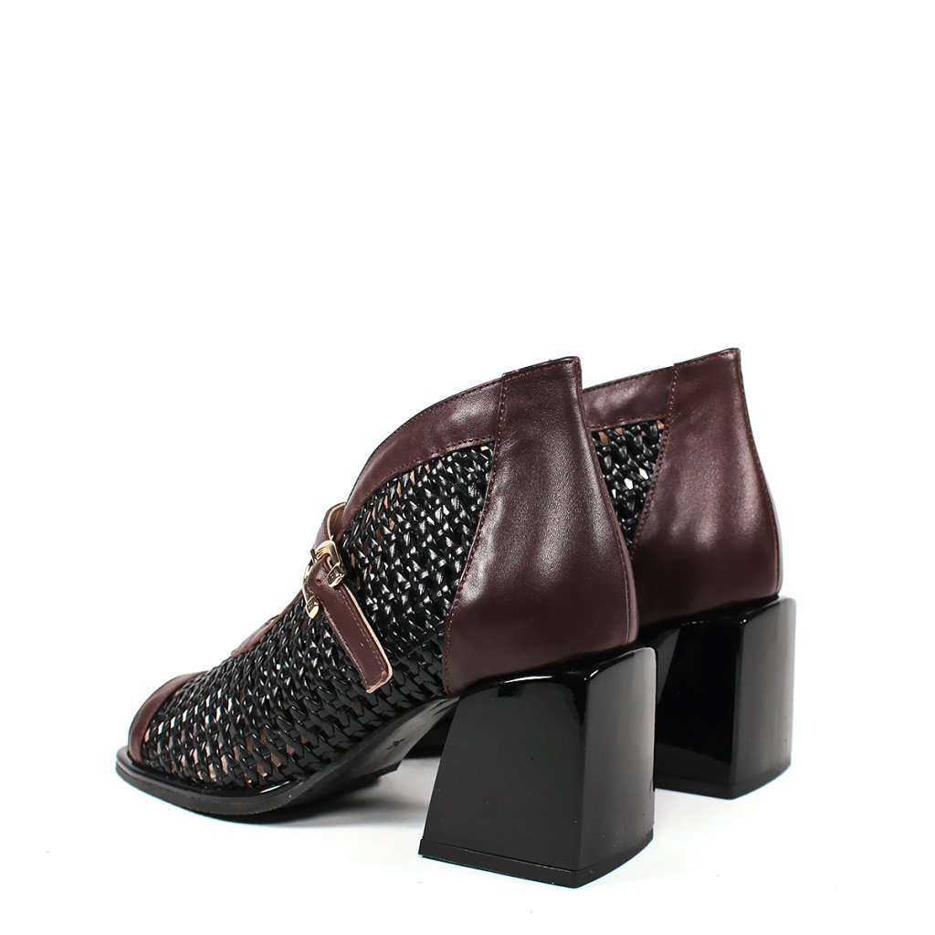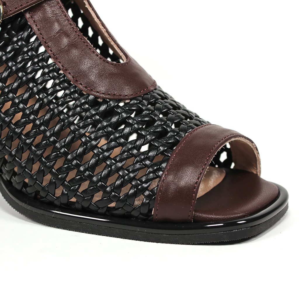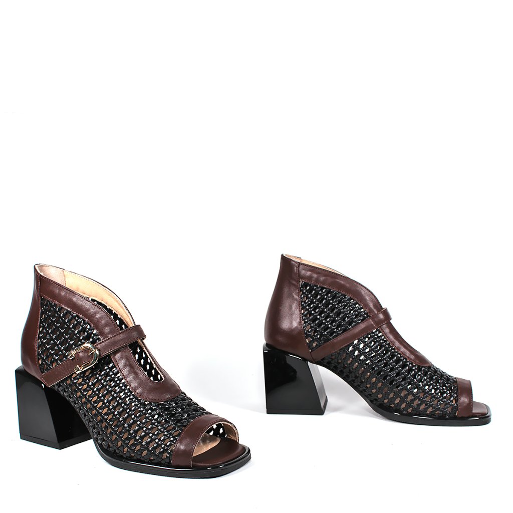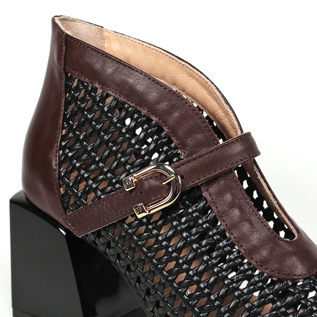 Táto dámska členková obuv značky Secretshoes predstavuje vzrušujúce spojenie moderného dizajnu a tradičnej remeselnej techniky. Výnimočnosť modelu spočíva v husto pletenom čiernom koženom povrchu, ktorý na priehlavku dopĺňa elegantný gaštanovohnedý kožený remienok s jemnou prackou. Dizajn s otvorenou špičkou a uzavretou pätou dodáva obuvi jedinečný a charakteristický vzhľad, zatiaľ čo stabilný čierny blokový podpätok zaručuje celodenný komfort a istý krok. Je to vynikajúca voľba pre prechodné obdobia alebo elegantné letné večery pre dámy, ktoré hľadajú štýlový a zároveň mimoriadne pohodlný kúsok do svojho šatníka.