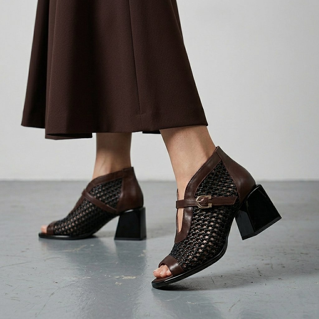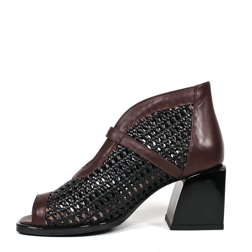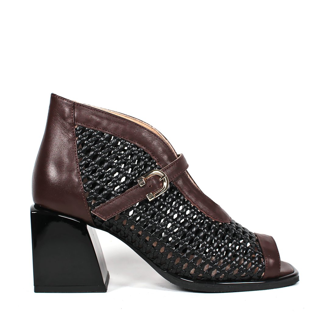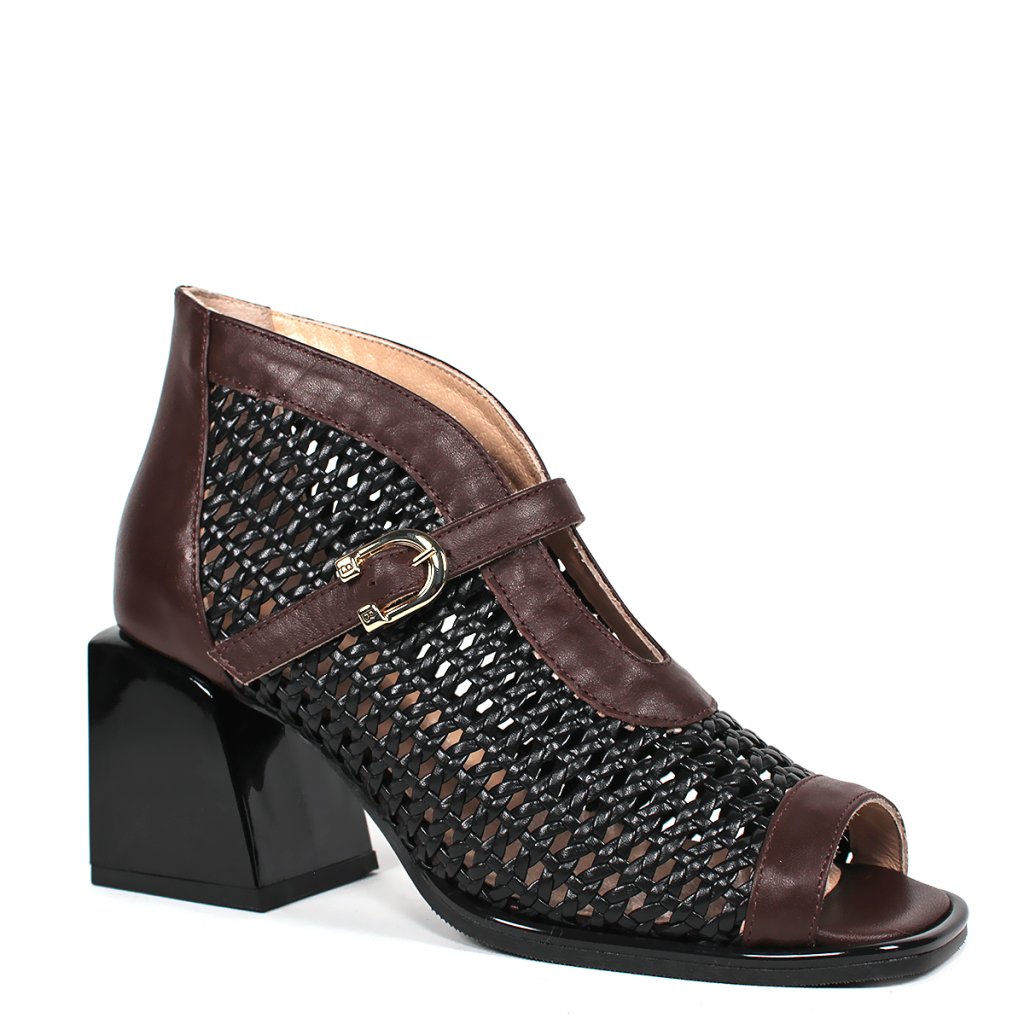 Táto dámska členková obuv značky Secretshoes predstavuje vzrušujúce spojenie moderného dizajnu a tradičnej remeselnej techniky. Výnimočnosť modelu spočíva v husto pletenom čiernom koženom povrchu, ktorý na priehlavku dopĺňa elegantný gaštanovohnedý kožený remienok s jemnou prackou. Dizajn s otvorenou špičkou a uzavretou pätou dodáva obuvi jedinečný a charakteristický vzhľad, zatiaľ čo stabilný čierny blokový podpätok zaručuje celodenný komfort a istý krok. Je to vynikajúca voľba pre prechodné obdobia alebo elegantné letné večery pre dámy, ktoré hľadajú štýlový a zároveň mimoriadne pohodlný kúsok do svojho šatníka.