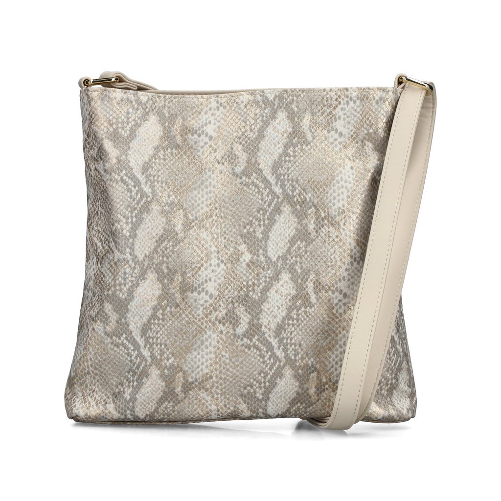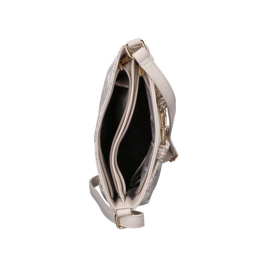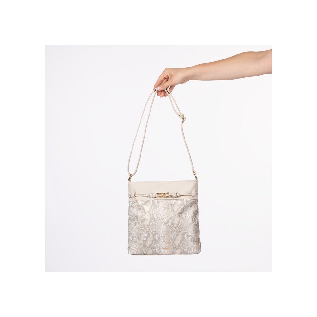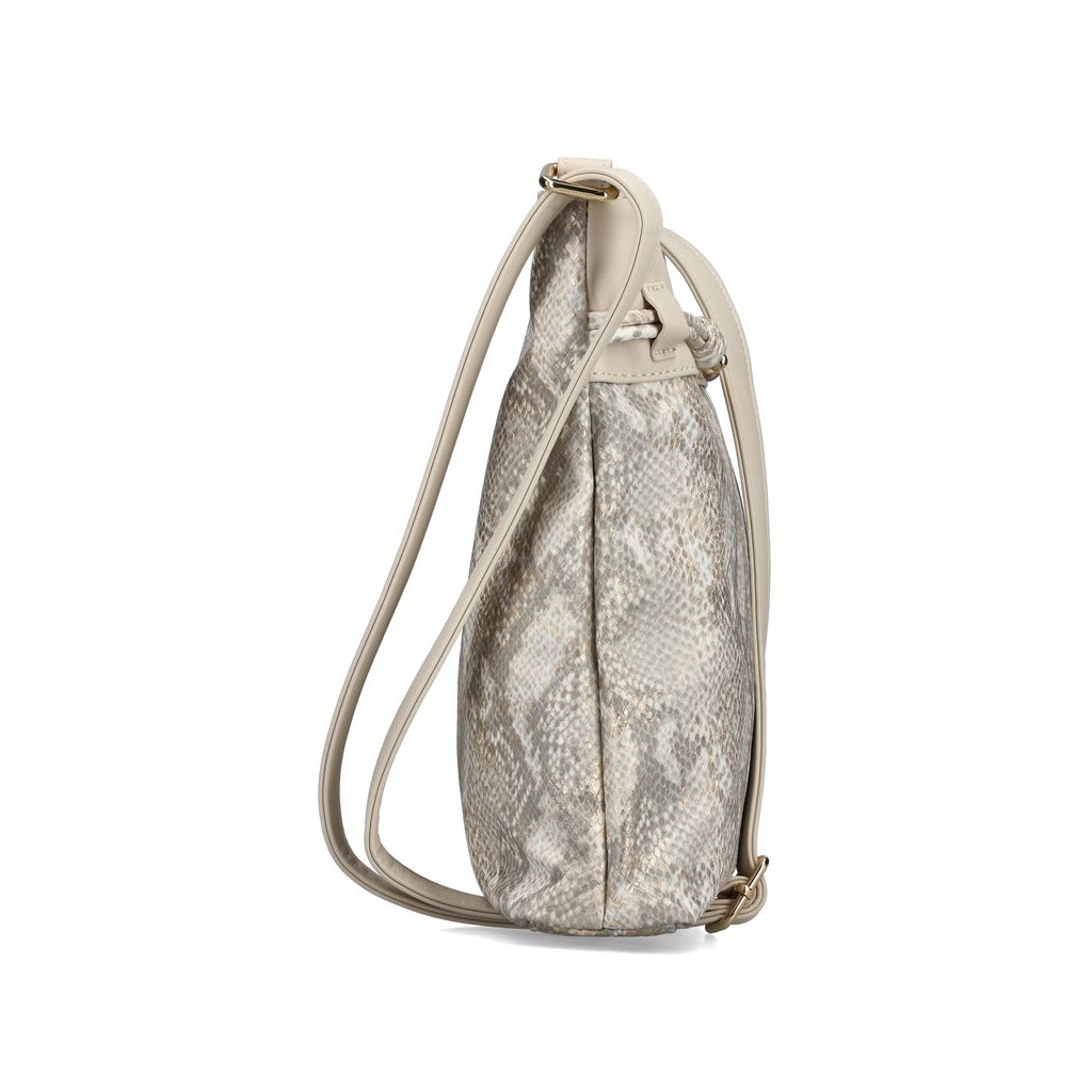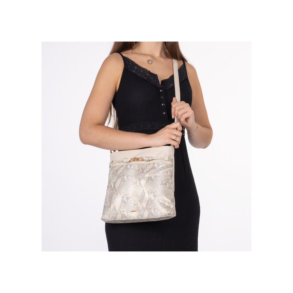 Táto elegantná dámska taška Rieker v krémovom odtieni (off-white) je dokonalým spojením vycibreného štýlu a funkčnosti. Výnimočnosť jej dodáva povrch s motívom hadej kože a jemným irizujúcim odleskom, ktorý vkusne dopĺňa dekoratívne uzlíkové zdobenie a kovové detaily v zlatej farbe. Dve samostatné hlavné priehradky na zips spolu s vnútornými vreckami zaisťujú praktické usporiadanie vašich vecí, zatiaľ čo nastaviteľný ramenný popruh zaručuje pohodlné nosenie na pleci alebo ako crossbody.