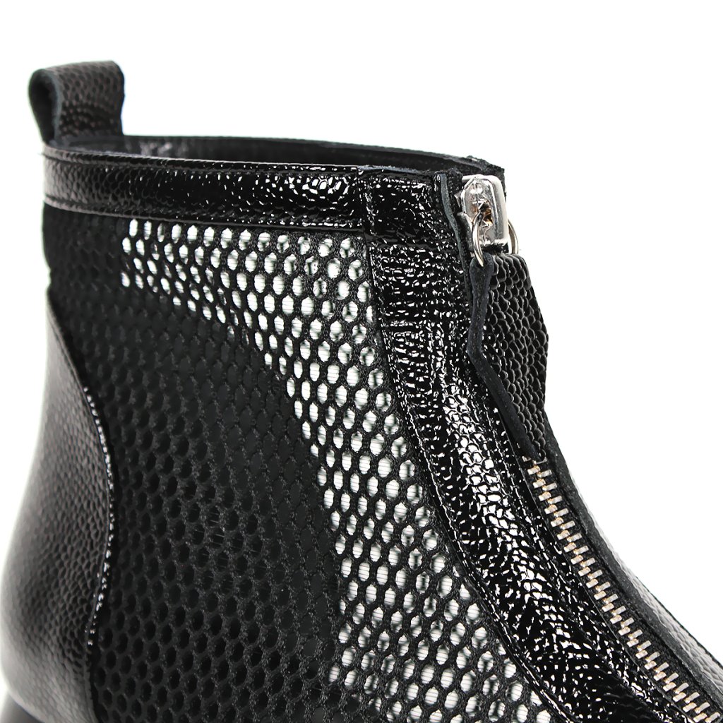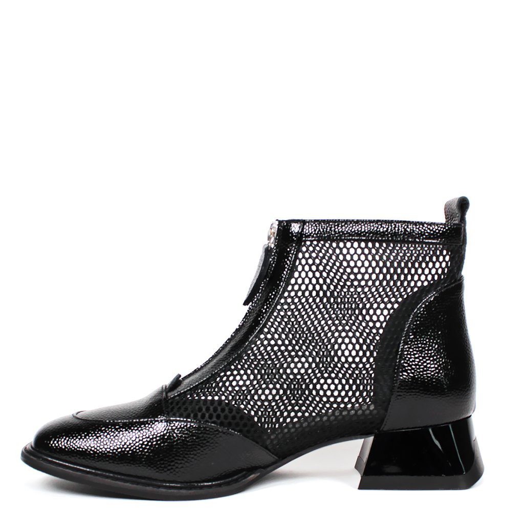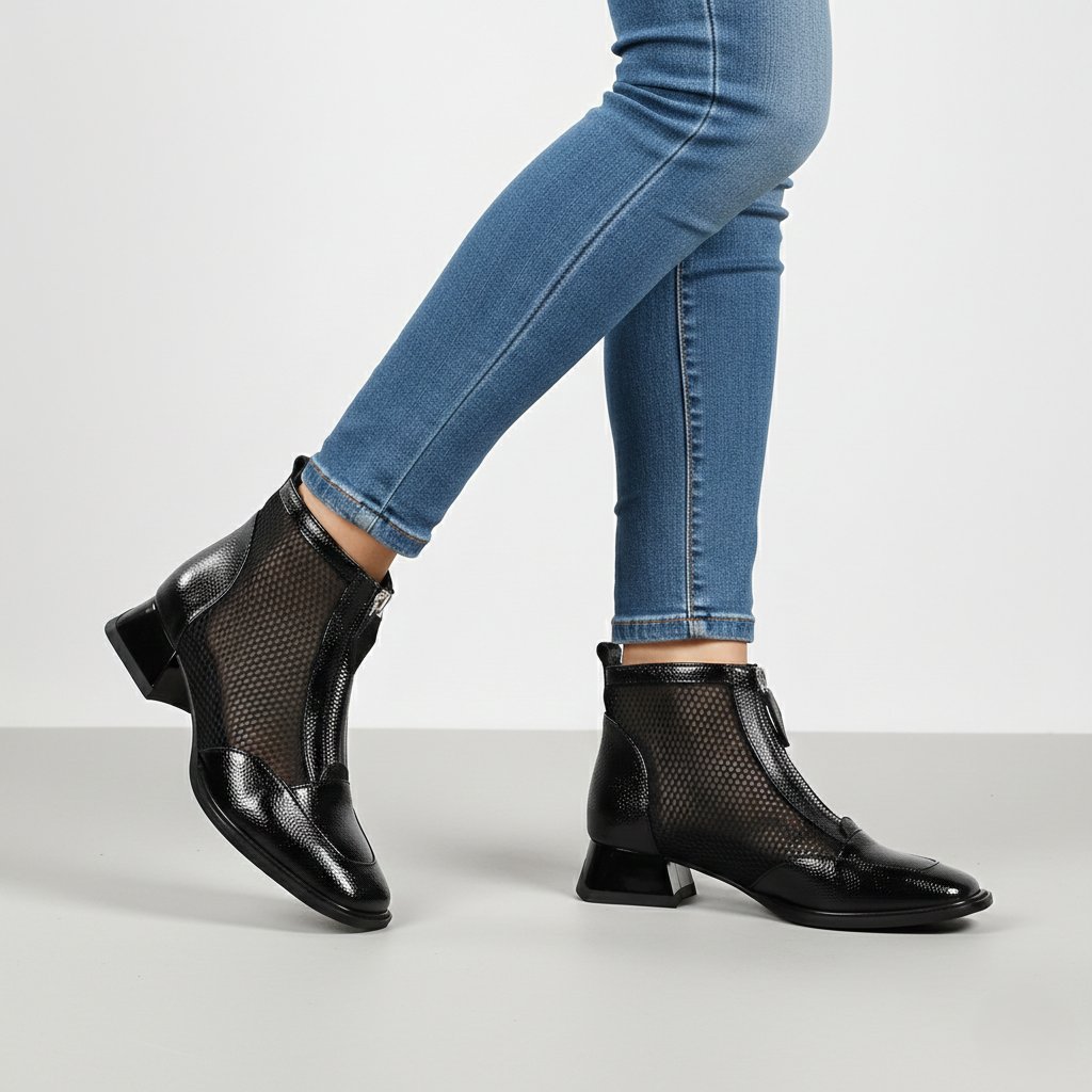 Tieto členkové čižmy značky Secretshoes sú dokonalým spojením modernej elegancie a extravagantného štýlu. Tmavočervenohnedý s lakovaným efektom ozvláštňuje bočná sieťovaná vsadka, ktorá zabezpečuje nielen priedušnosť, ale dodáva obuvi aj odvážny, priehľadný vzhľad. Predné zapínanie na zips uľahčuje obúvanie a zároveň podčiarkuje charakteristické línie topánky. Stabilný podpätok s geometrickým tvarom zaručuje celodenné pohodlie, vďaka čomu je tento model ideálnou voľbou pre tie dámy, ktoré hľadajú jedinečný a sebavedomý štýl na každý deň.