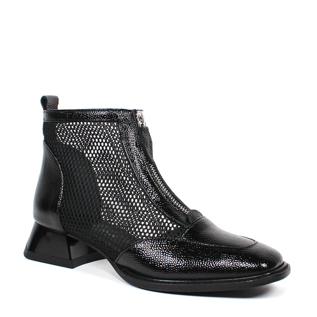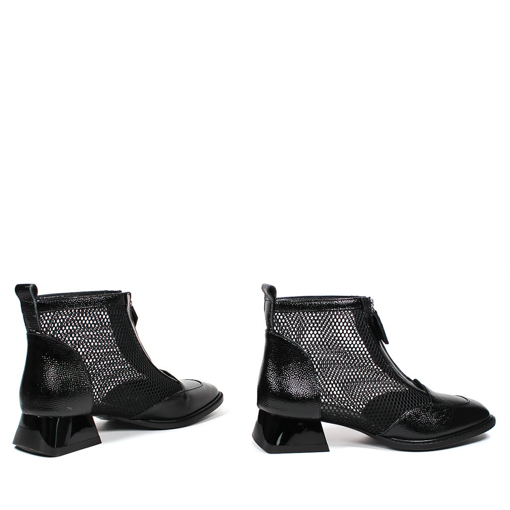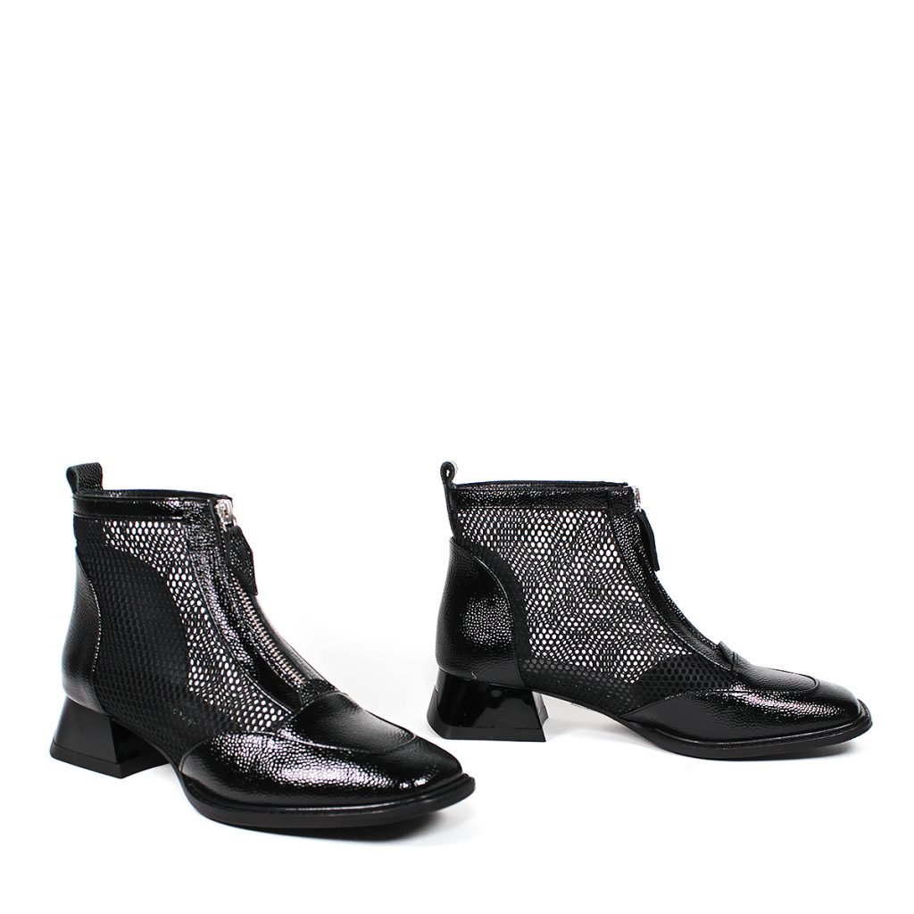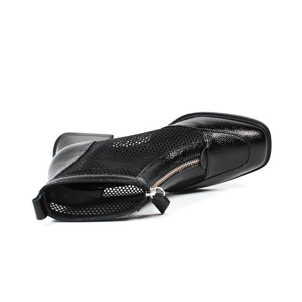 Tieto členkové čižmy značky Secretshoes sú dokonalým spojením modernej elegancie a extravagantného štýlu. Tmavočervenohnedý s lakovaným efektom ozvláštňuje bočná sieťovaná vsadka, ktorá zabezpečuje nielen priedušnosť, ale dodáva obuvi aj odvážny, priehľadný vzhľad. Predné zapínanie na zips uľahčuje obúvanie a zároveň podčiarkuje charakteristické línie topánky. Stabilný podpätok s geometrickým tvarom zaručuje celodenné pohodlie, vďaka čomu je tento model ideálnou voľbou pre tie dámy, ktoré hľadajú jedinečný a sebavedomý štýl na každý deň.