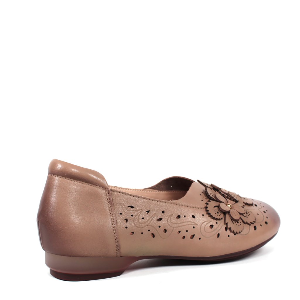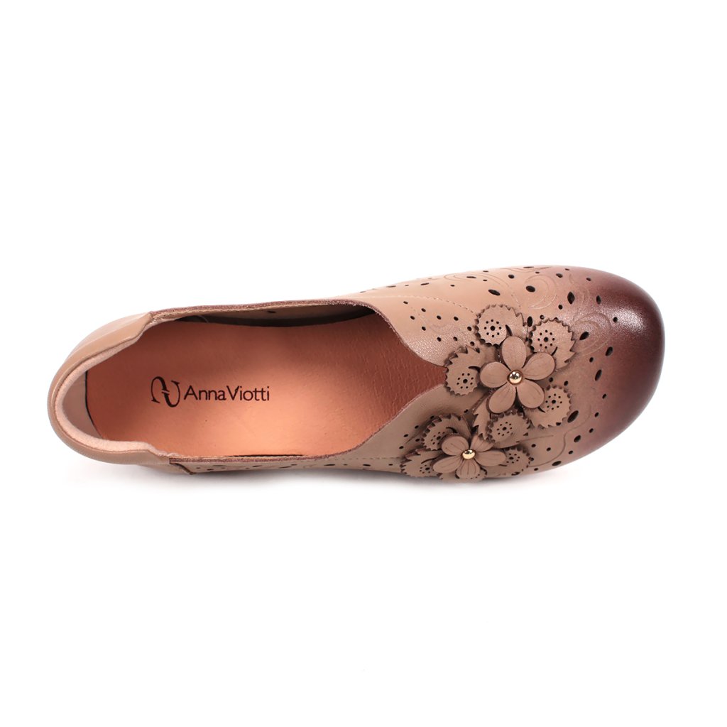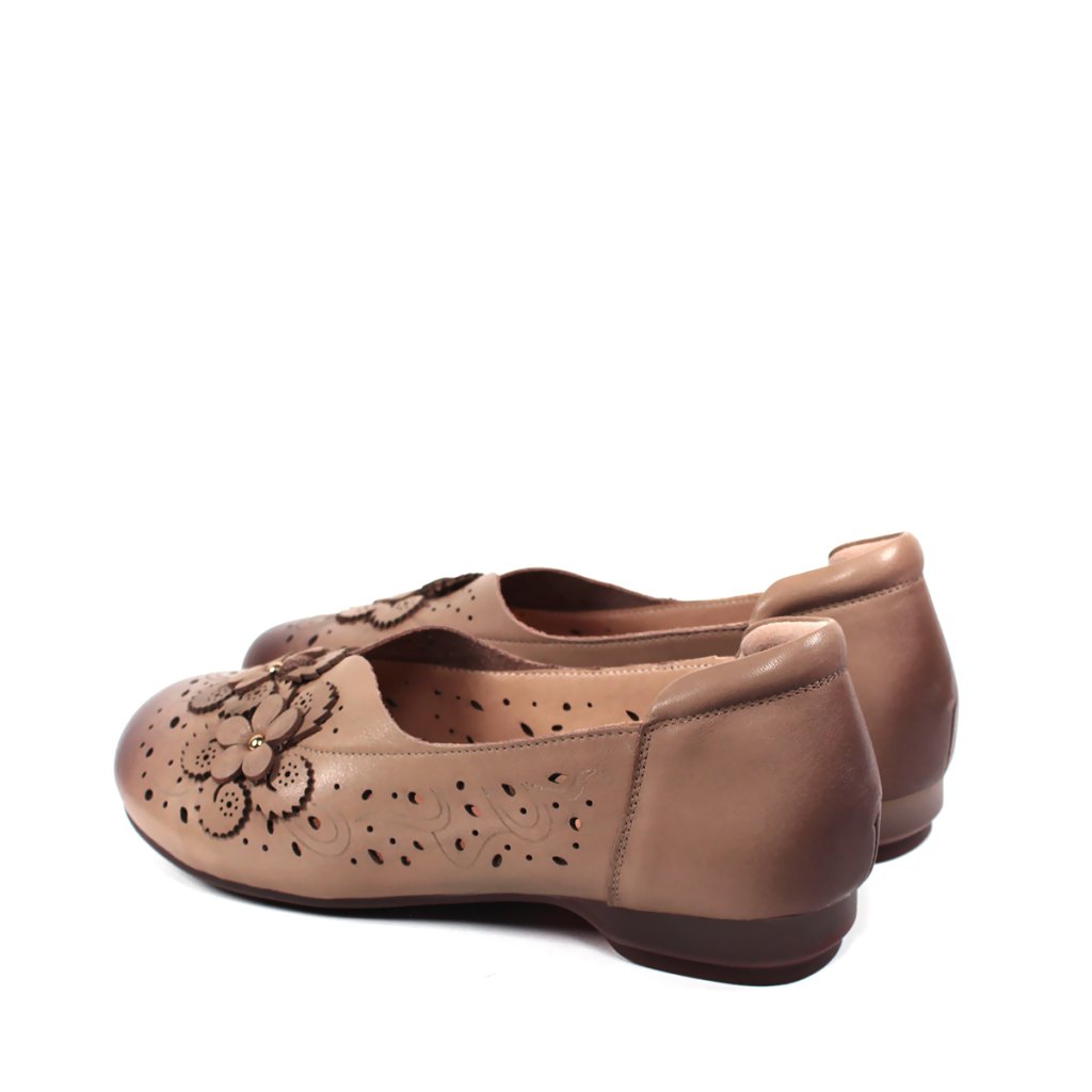 Tieto dámske poltopánky predstavujú dokonalé spojenie klasickej elegancie a každodenného pohodlia. Obuv je vyrobená z jemnej kože v hnedom odtieni, ktorú ozvláštňuje tmavšia patina na špičke. Zvršok topánky zdobí precízny laserom vyrezávaný vzor a romantické kožené kvetinové aplikácie, ktoré dodávajú celkovému vzhľadu ženský šarm. Nízky podpätok a mäkké vnútro zaisťujú celodenný komfort, vďaka čomu sú ideálnou voľbou do kancelárie aj na prechádzky mestom.
