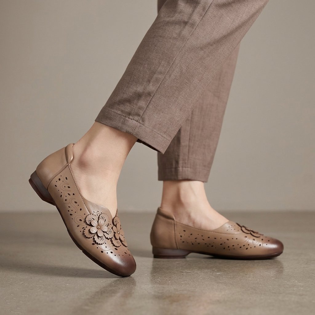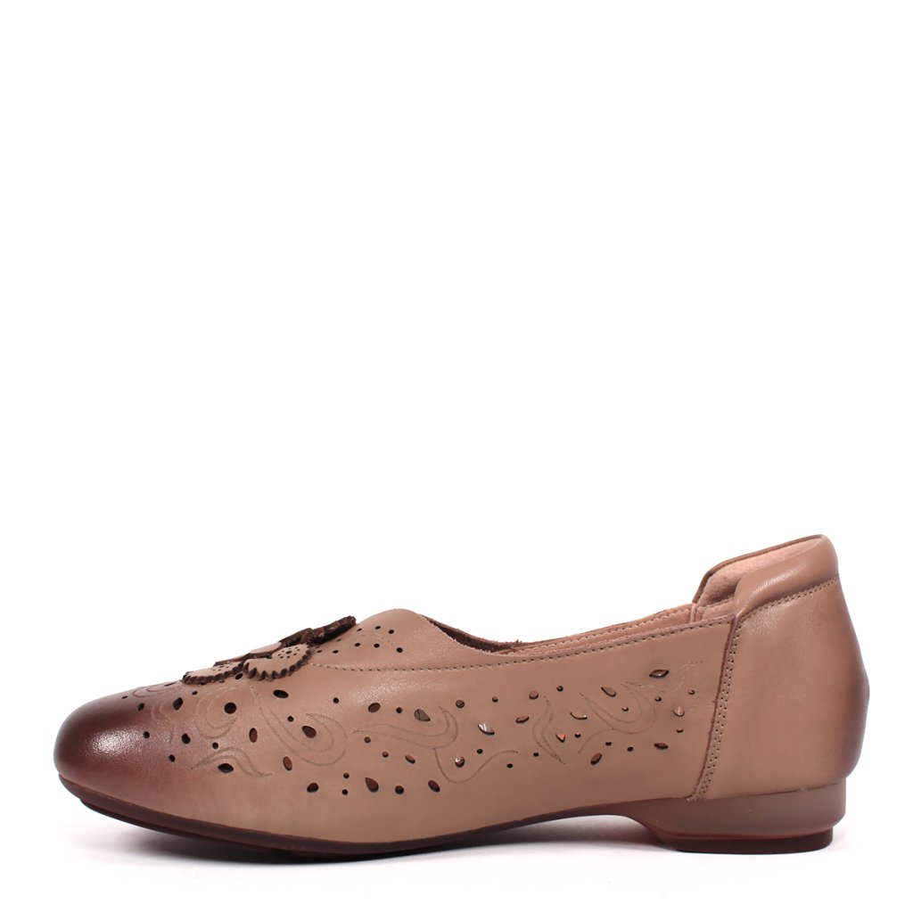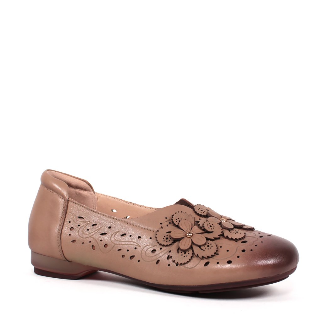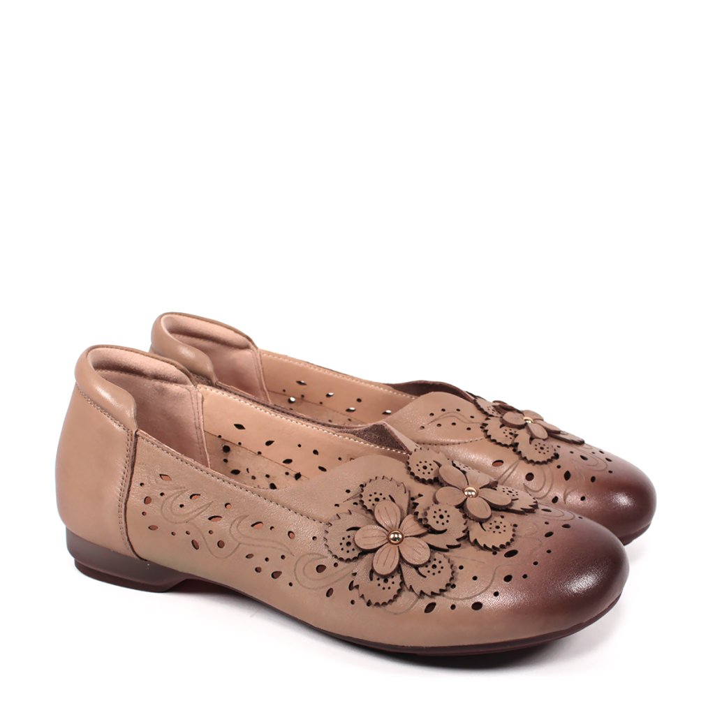 Tieto dámske poltopánky predstavujú dokonalé spojenie klasickej elegancie a každodenného pohodlia. Obuv je vyrobená z jemnej kože v hnedom odtieni, ktorú ozvláštňuje tmavšia patina na špičke. Zvršok topánky zdobí precízny laserom vyrezávaný vzor a romantické kožené kvetinové aplikácie, ktoré dodávajú celkovému vzhľadu ženský šarm. Nízky podpätok a mäkké vnútro zaisťujú celodenný komfort, vďaka čomu sú ideálnou voľbou do kancelárie aj na prechádzky mestom.