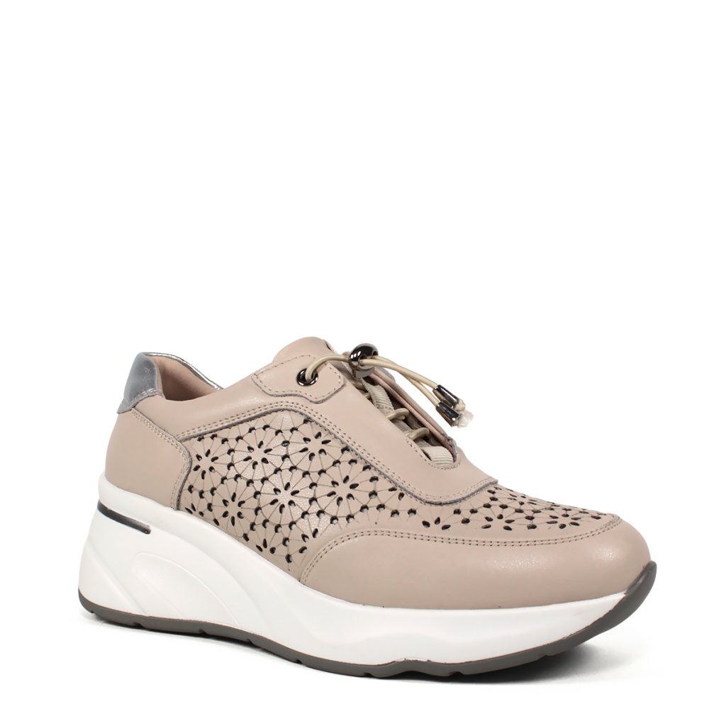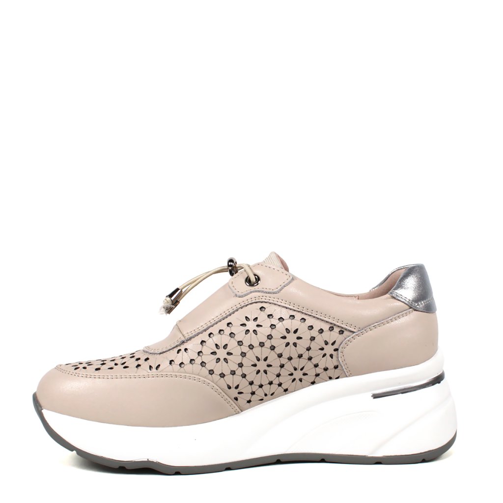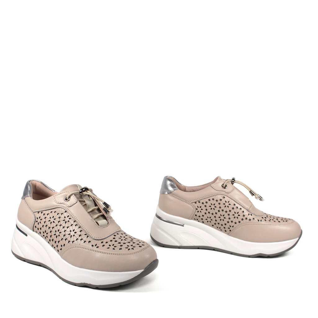 Táto moderná dámska vychádzková obuv v béžovom odtieni predstavuje elegantnú kombináciu športového štýlu a prepracovaných detailov. Kožený zvršok ozvláštňuje efektná, laserom vyrezávaná perforácia s kvetinovým vzorom, ktorá poskytuje nielen estetický zážitok, ale zabezpečuje aj optimálnu priedušnosť pre vaše nohy. Tradičné šnúrky nahrádza praktický systém rýchleho šnurovania s kovovými koncovkami, ktorý uľahčuje obúvanie a dodáva obuvi jedinečný charakter. Masívna biela platformová podrážka spolu so strieborným zdobením na päte zaručujú módny vzhľad a celodenné pohodlie, vďaka čomu je tento model ideálnym spoločníkom na každodenné prechádzky mestom.