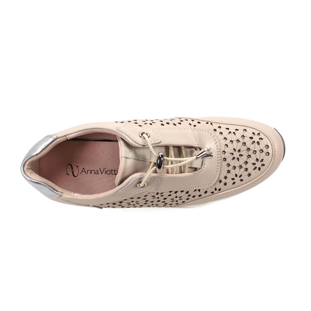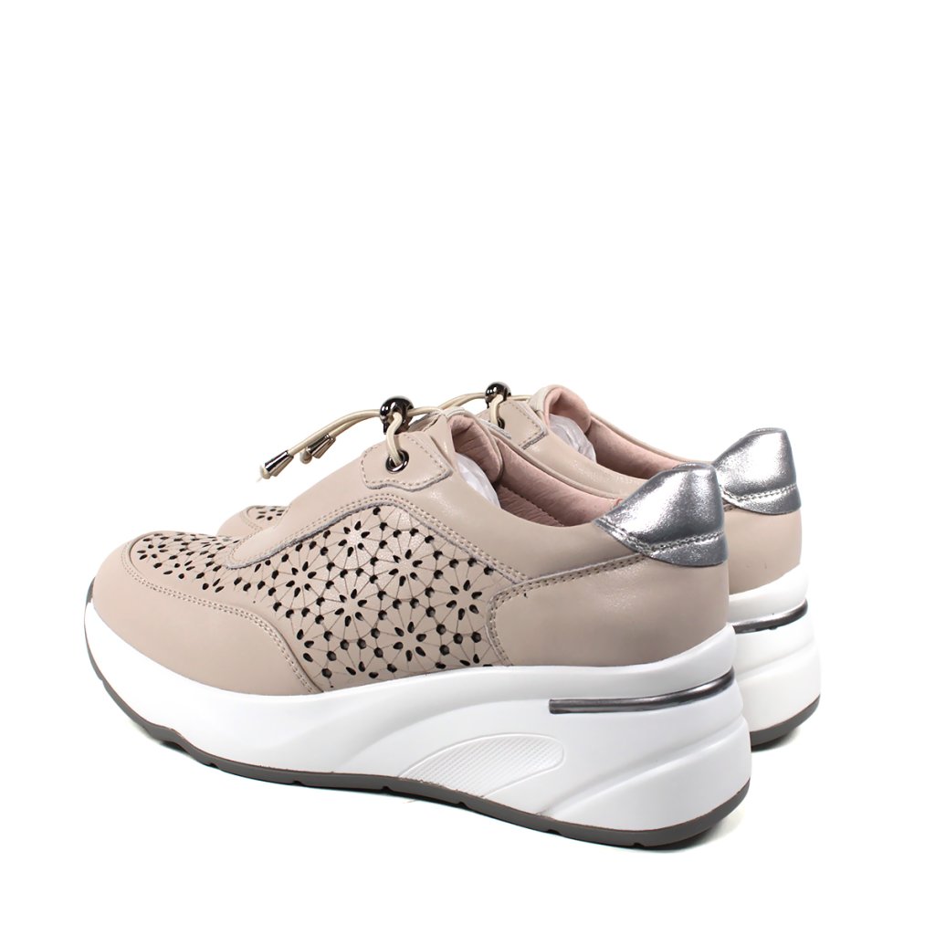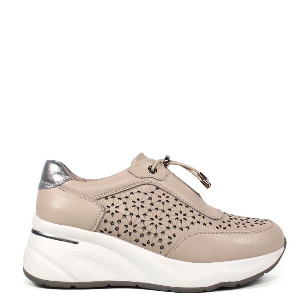 Táto moderná dámska vychádzková obuv v béžovom odtieni predstavuje elegantnú kombináciu športového štýlu a prepracovaných detailov. Kožený zvršok ozvláštňuje efektná, laserom vyrezávaná perforácia s kvetinovým vzorom, ktorá poskytuje nielen estetický zážitok, ale zabezpečuje aj optimálnu priedušnosť pre vaše nohy. Tradičné šnúrky nahrádza praktický systém rýchleho šnurovania s kovovými koncovkami, ktorý uľahčuje obúvanie a dodáva obuvi jedinečný charakter. Masívna biela platformová podrážka spolu so strieborným zdobením na päte zaručujú módny vzhľad a celodenné pohodlie, vďaka čomu je tento model ideálnym spoločníkom na každodenné prechádzky mestom.