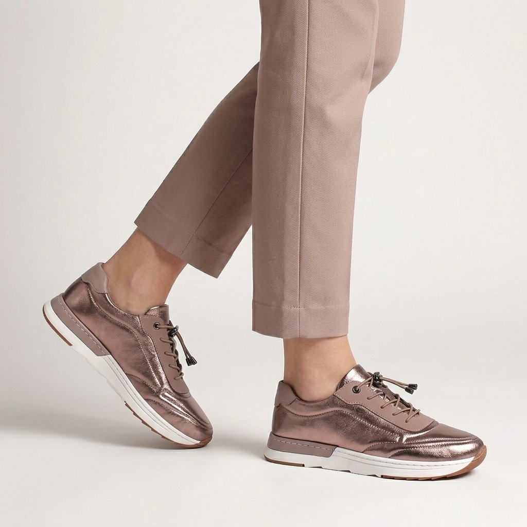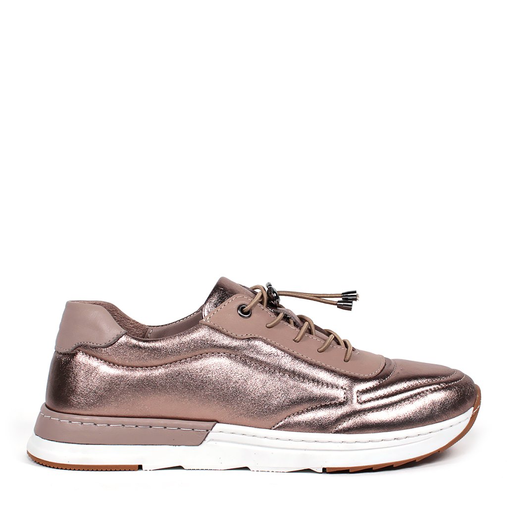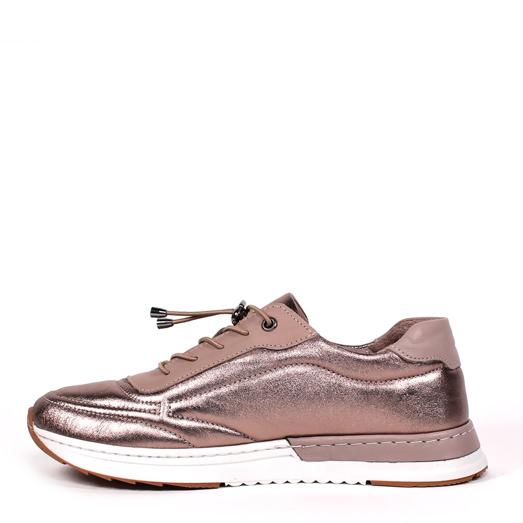 Tieto dámske kožené tenisky značky Secretshoes sú úžasným spojením kovového lesku a športovej elegancie. Zvršok vyrobený z kože so špeciálnou metalickou úpravou v odtieni bronz okamžite pritiahne pozornosť, zatiaľ čo mäkký materiál a polstrovaná oblasť členka zaručujú maximálne pohodlie. Moderný vzhľad dopĺňa praktický systém elastických šnúrok so sťahovacím stopperom, ktorý umožňuje rýchle obúvanie a dokonalé prispôsobenie priehlavku. Hrubá biela športová podrážka zaisťuje nielen pružnú chôdzu, ale aj vizuálne zvýrazňuje dynamické línie topánky, vďaka čomu je tento model ideálnym doplnkom pre štýlový mestský outfit.