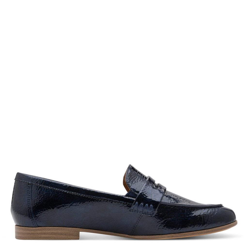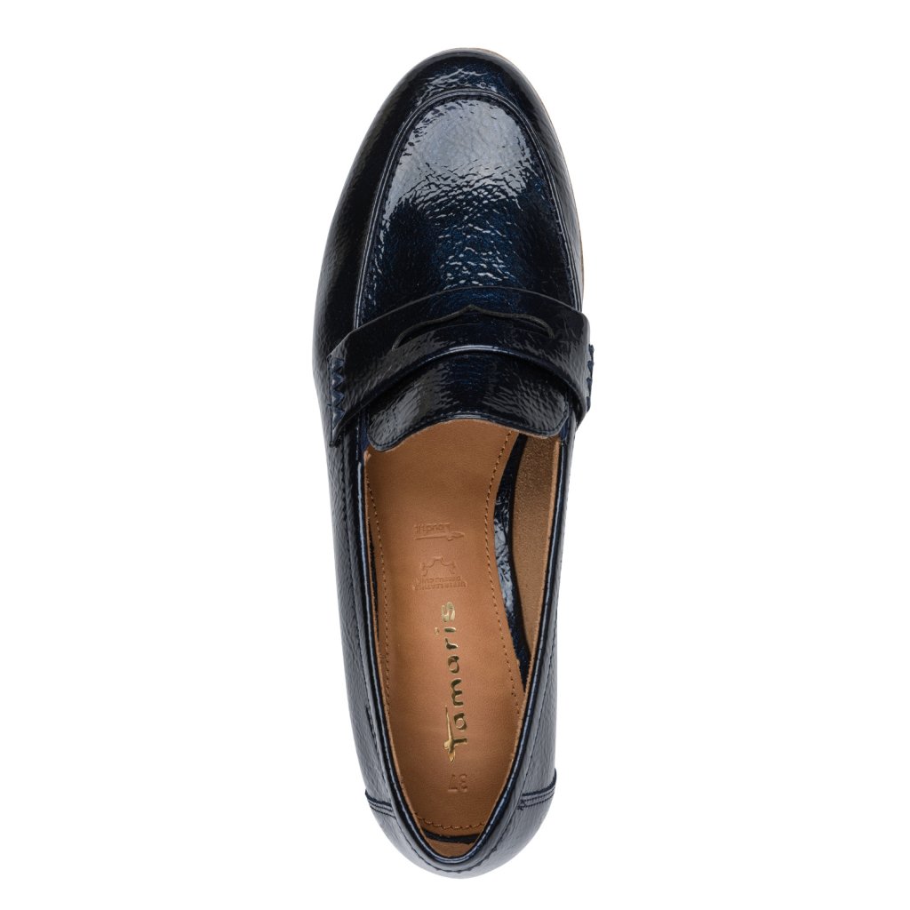 Tieto lakované mokasíny Tamaris sú dokonalým spojením klasickej elegancie a moderného luxusu. Elegantný navy odtieň (tmavomodrá) a povrch s vysokým leskom dodávajú topánkam sofistikovaný vzhľad, ktorý okamžite pozdvihne akýkoľvek biznis alebo príležitostný outfit.