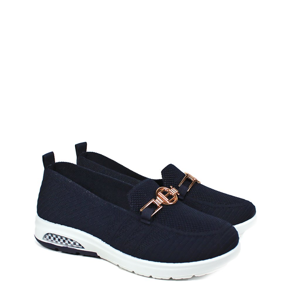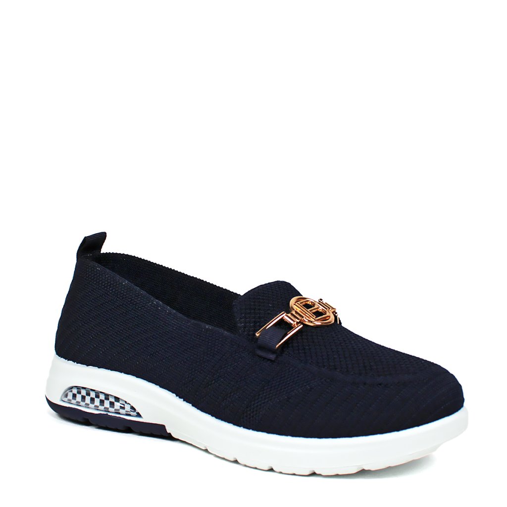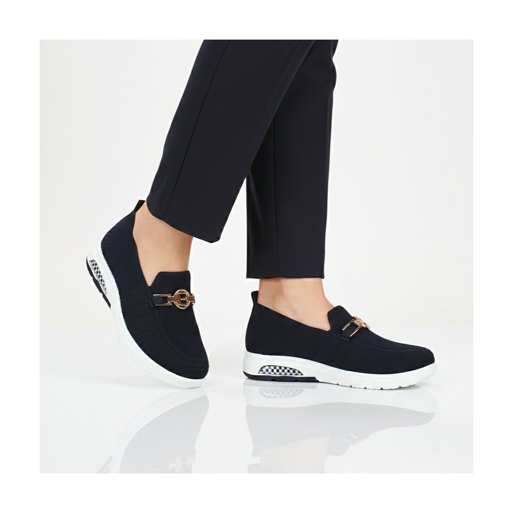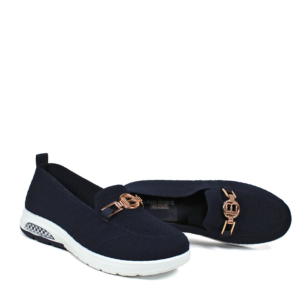 Tieto štýlové tmavomodré slip-on topánky Laura Biagiotti predstavujú dokonalú kombináciu športového pohodlia a elegantného vzhľadu. Zvršok v sýtej tmavej farbe vyrobený flexibilnou pletenou technológiou sa presne prispôsobí tvaru chodidla a zároveň zabezpečí vynikajúcu priedušnosť po celý deň. Topánky robí skutočne ženskými výrazná zlatá ozdoba s logom značky, ktorá krásne ladí s tmavomodrým základom. Vzduchový vankúš v päte zabudovaný do kontrastnej bielej podrážky a šachovnicový detail im dodávajú moderný a dynamický charakter. Pre maximálnu hygienu je stielka vyberateľná, takže sa dá ľahko čistiť alebo vymeniť. Je to ideálna voľba na rušné dni pre tie dámy, ktoré hľadajú klasickú eleganciu v pohodlnom prevedení.