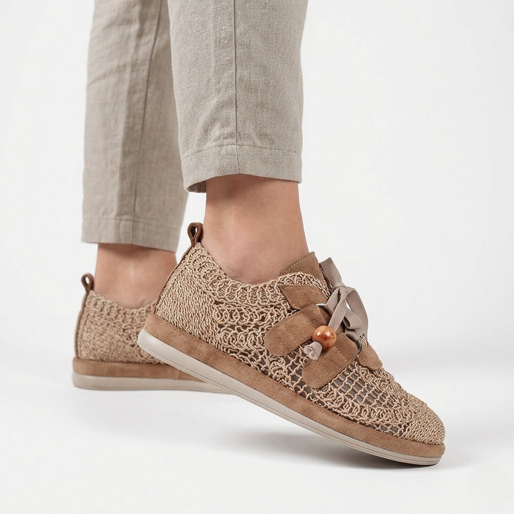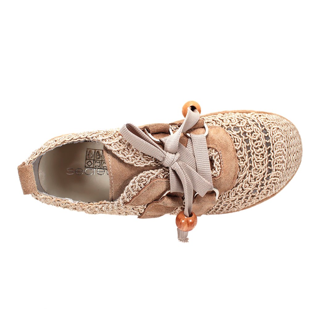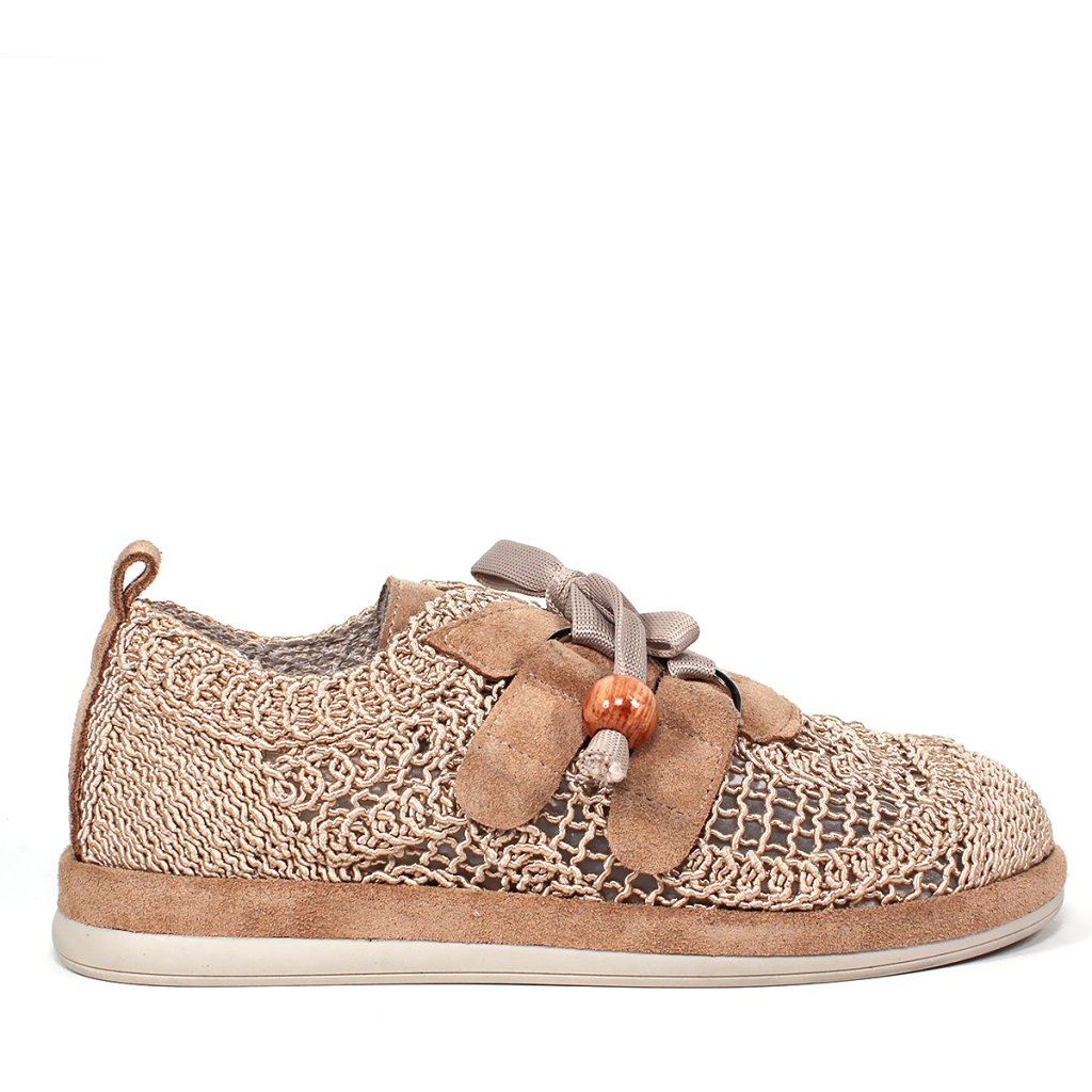 Táto sofistikovaná dámska poltopánka v krémovom odtieni je dokonalým spojením rustikálnej elegancie a moderného dizajnu. Výnimočnosťou obuvi je zvršok s dierovaným vzorom pripomínajúcim techniku háčkovania, ktorý zabezpečuje vzdušnosť a ľahkosť počas teplejších sezón. Vzhľad dotvárajú detaily zo zamatovo hebkého semišu a jedinečné šnurovanie s mašľou zdobenou drevenými korálkami s prírodným efektom, ktoré dodávajú topánkam skutočný charakter. Svetlá, kontrastná podrážka nielenže dodáva celkovému vzhľadu športovejší nádych, ale zaručuje aj celodenné pohodlie, vďaka čomu je tento model vynikajúcou voľbou pre štýlové a zároveň ležérne všedné dni.