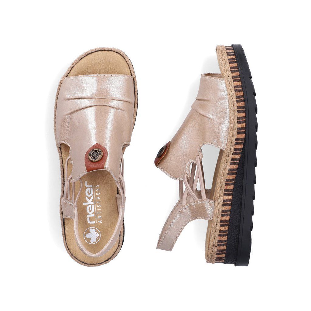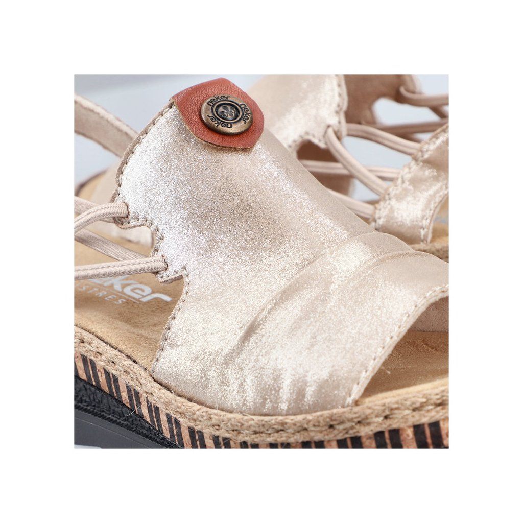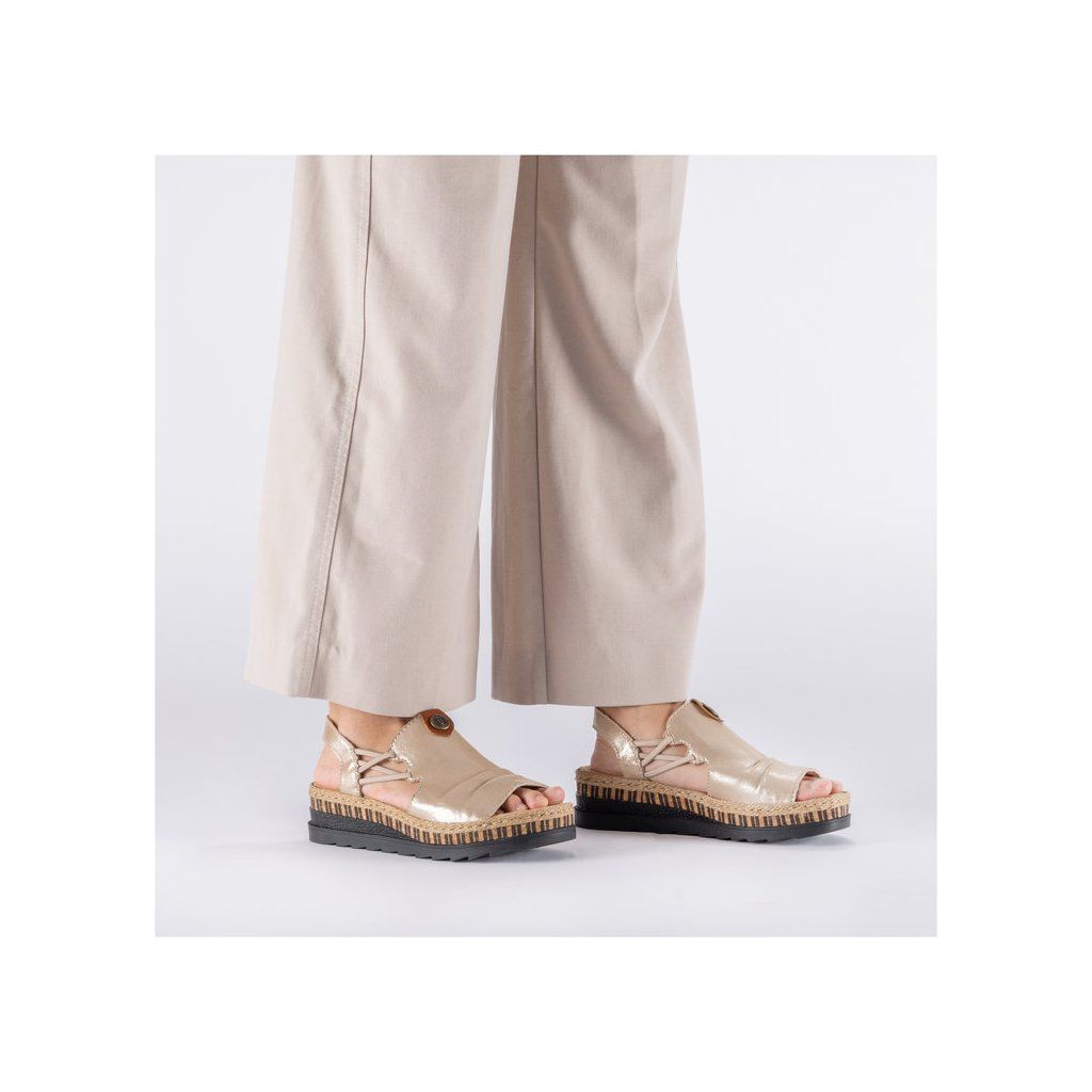 Tieto sandále značky RIEKER sa rýchlo stanú vaším obľúbeným letným spoločníkom. Krémový zvršok je ozvláštnený jemným nariasením a vkusnou kovovou ozdobou, ktorá dodáva modelu ženský a štýlový vzhľad. Vďaka pružným gumičkám po stranách je obúvanie pohodlné, pričom sandále sa krásne prispôsobia tvaru chodidla. Mäkká textilná stielka zabezpečí príjemný došľap a komfort aj pri dlhšej chôdzi. Tento model sa výborne hodí k dlhým sukniam, letným šatám aj ležérnym outfitom a je ideálnou voľbou na prechádzky mestom, dovolenku či bežné letné dni, keď chcete spojiť eleganciu s pohodlím.
