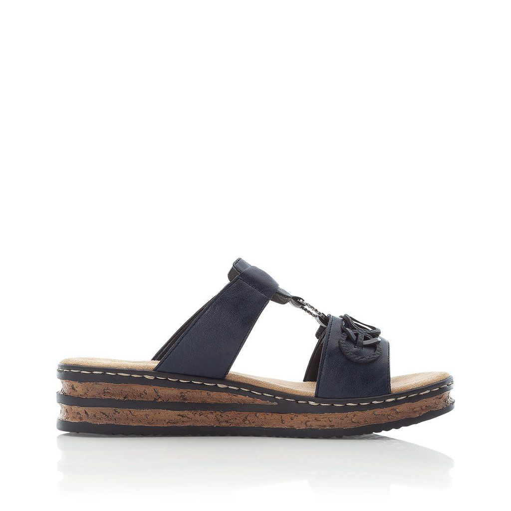 Tieto dámske šľapky značky RIEKER ocení každá žena, ktorá má rada jednoduchú eleganciu. Zvršok tmavo modrej farby je na prednom pásiku ozdobený aplikáciou v podobe spletených kruhov a kovový prvok spája prednú a priehlavkovú časť. Oba pásiky sú potom vybavené suchým zipsom, teda si obuv môžete pohodlne nastaviť podľa svojich požiadaviek. Mäkká stielka je vyrobená z príjemného materiálu, ktorý Vám zabezpečí pohodlie na každom kroku. Podošva v spojení korku a čiernych pruhov doladia vzhľad sandálov k dokonalosti. Tieto šľapky budú skvele vyzerať s dlhými sukňami či šatami.