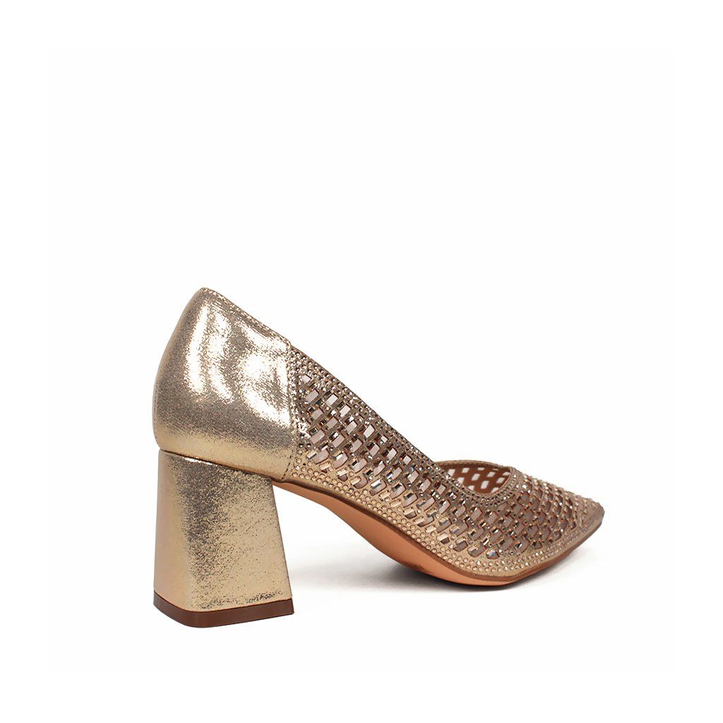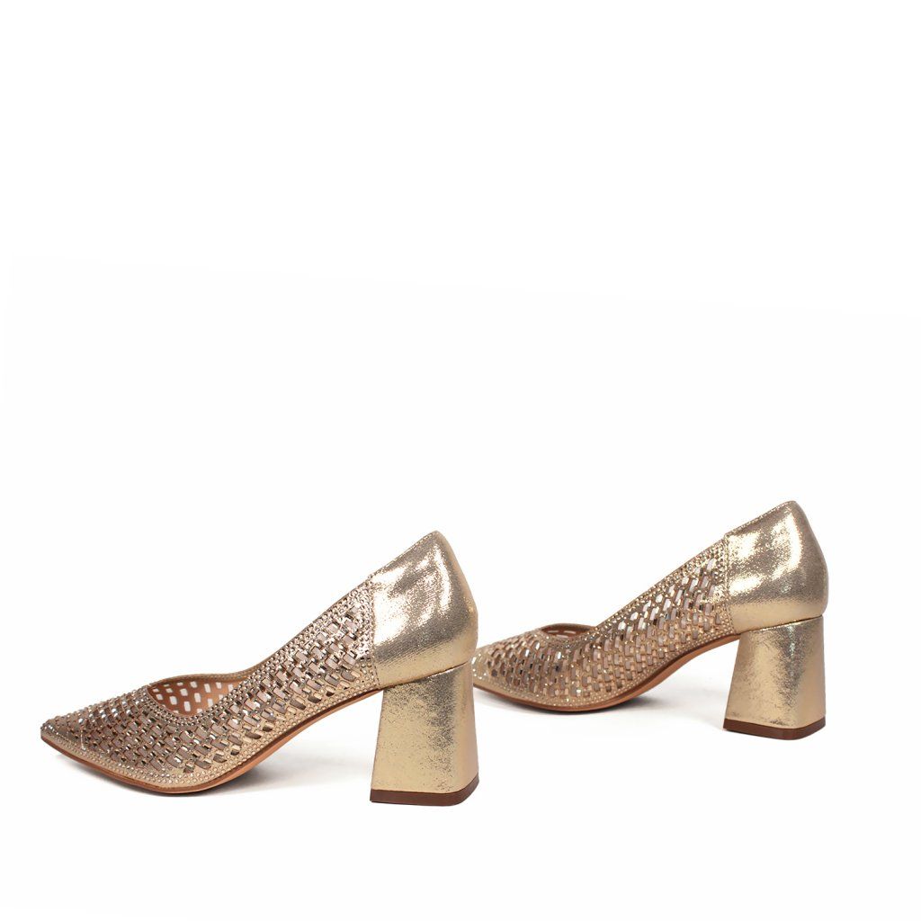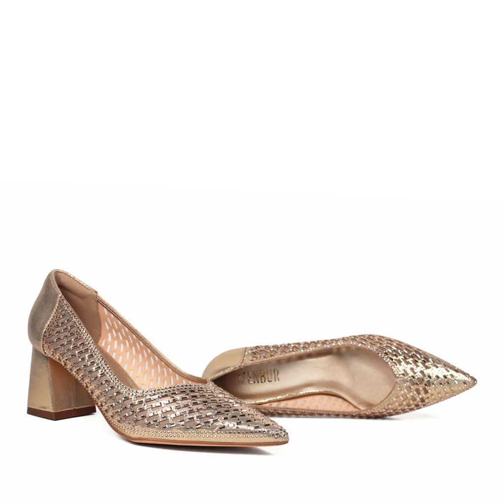 Tieto elegantné lodičky značky Menbur sú dokonalou kombináciou vycibreného štýlu a moderného dizajnu, ktorý urobí každú výnimočnú príležitosť nezabudnuteľnou. Zlatá farba s metalickým odleskom dodáva topánkam luxusný vzhľad, zatiaľ čo priehľadné sieťované detaily na bokoch sú zdobené drobnými trblietavými kryštálmi. Špicatá špička opticky predlžuje postavu a stabilný, stredne vysoký blokový podpätok zaisťuje pohodlie počas celého večera. Mäkké spracovanie vnútornej stielky a kvalitné materiály, ktoré sú pre túto značku typické, zaručujú, že tento model je nielen vizuálne pôsobivý, ale aj praktickou voľbou k slávnostnému outfitu.
