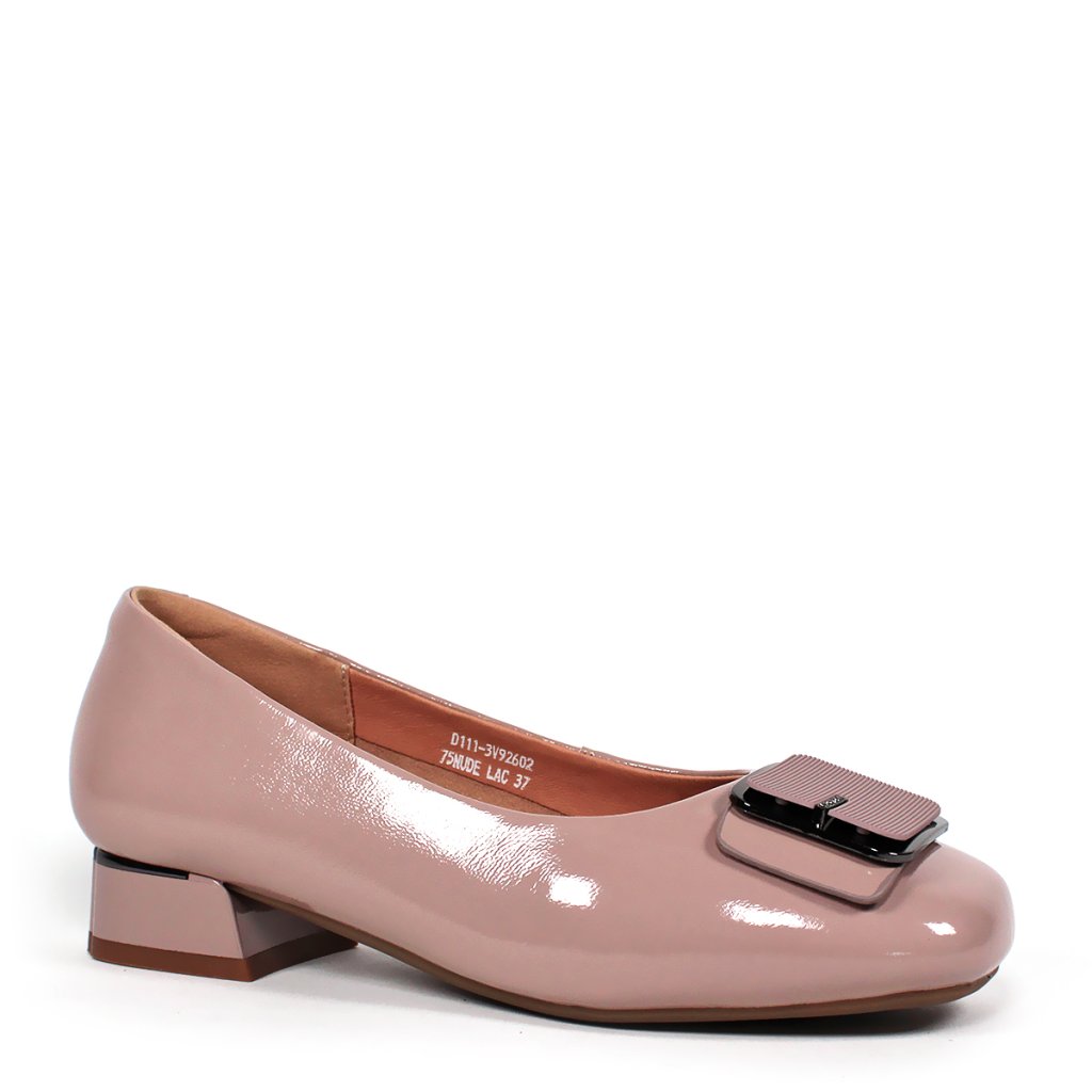 Tieto poltopánky predstavujú dokonalé spojenie klasickej elegancie a moderného štýlu, ktoré sa stanú základným kúskom každého dámskeho šatníka. Lesklý lakovaný povrch dodáva obuvi sofistikovaný vzhľad, zatiaľ čo jedinečná textúrovaná ozdobná spona na špičke dodáva modelu osobitý charakter. Nízky a stabilný blokový podpätok zaručuje celodenné pohodlie, vďaka čomu je tento pár ideálnou voľbou do kancelárie, na obchodné stretnutia alebo aj na spoločenské udalosti. Mäkké vnútro a zaoblená špička sa starajú o prirodzený komfort chodidla.