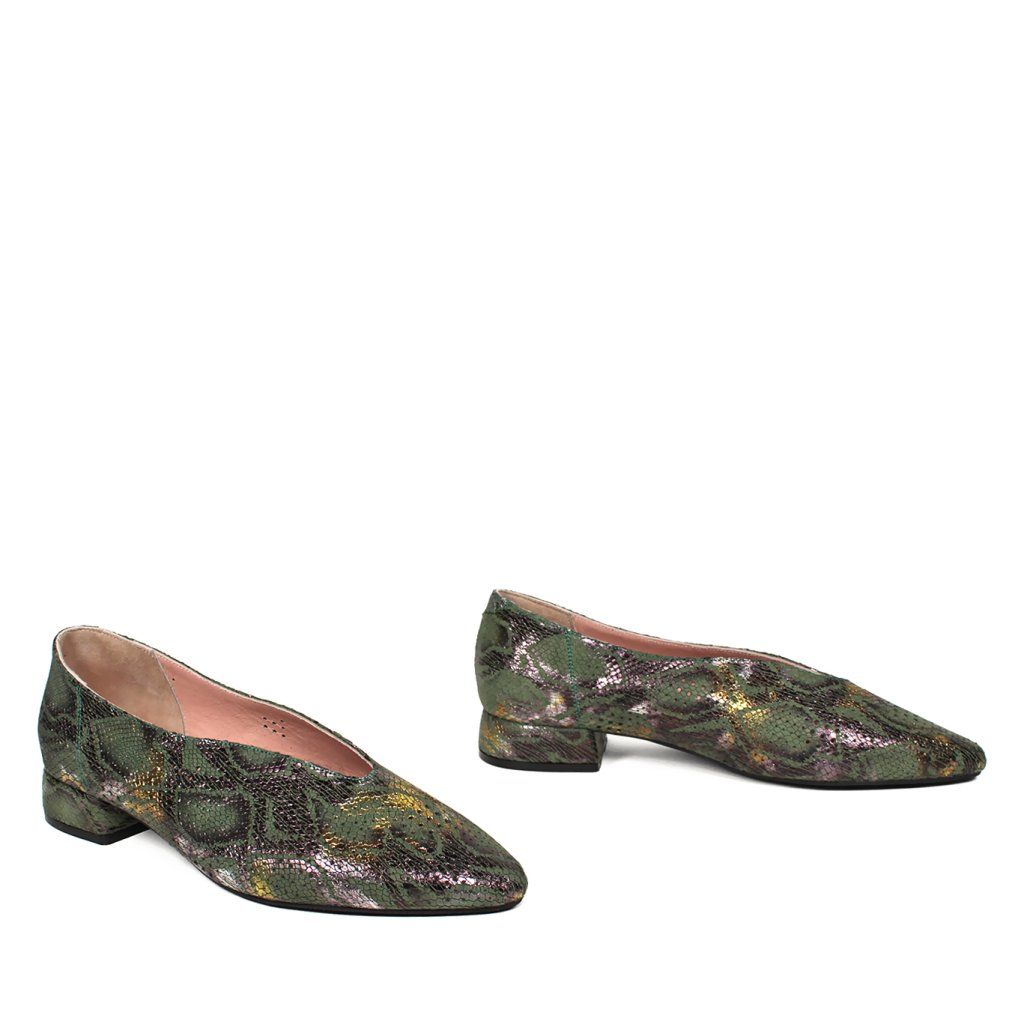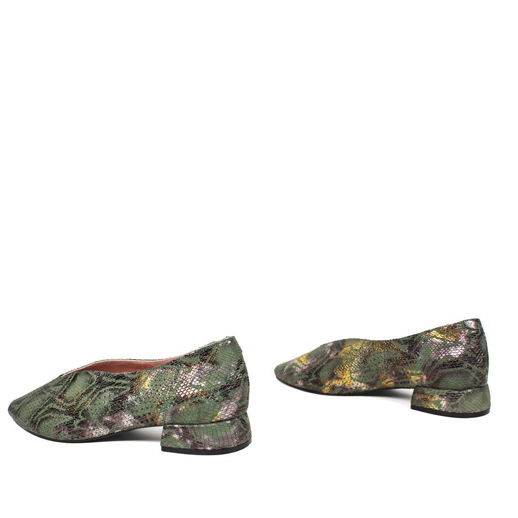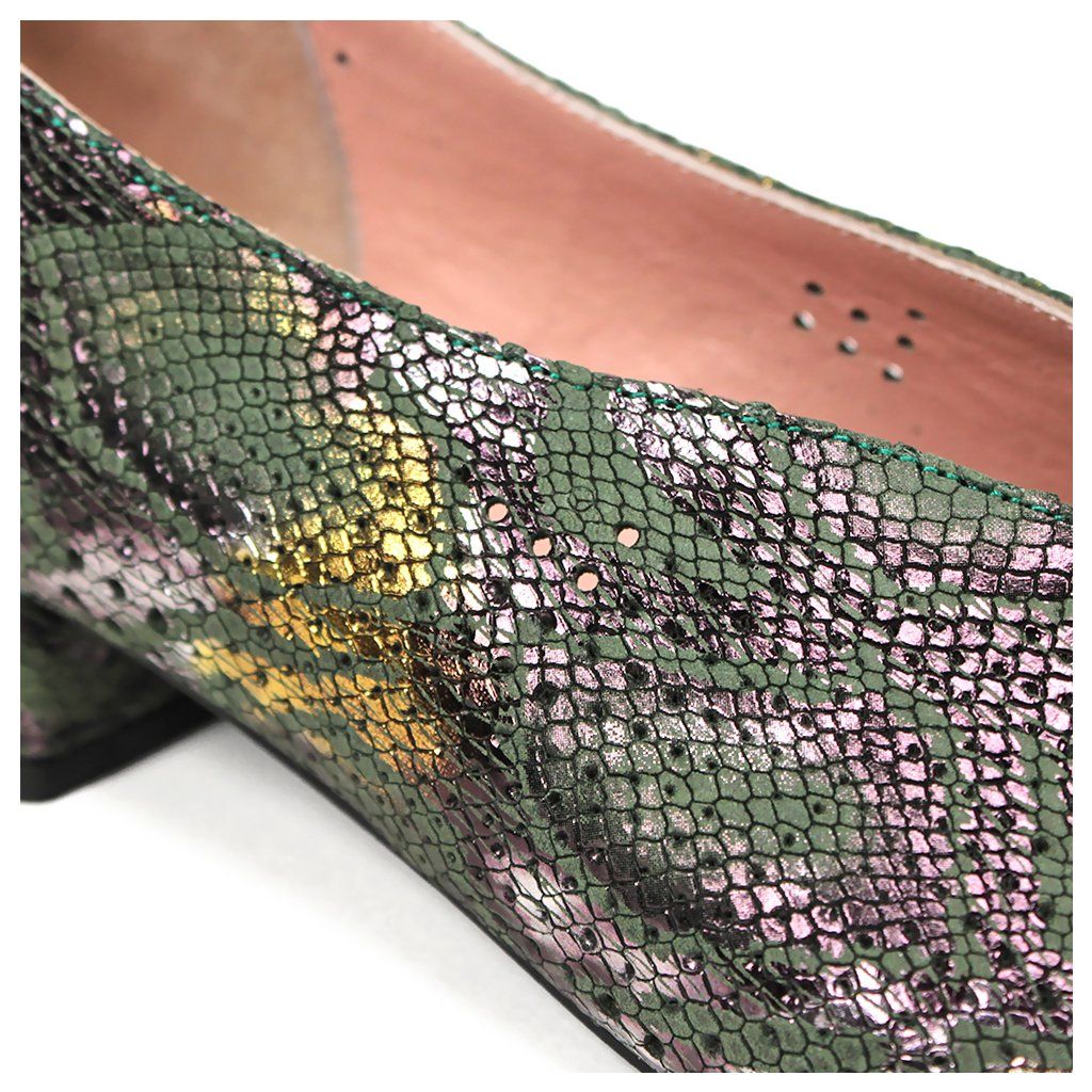 Dizajn: Originálny hadí vzor s jemným metalickým odleskom v zeleno-zlatých tónoch, ktorý dodáva obuvi luxusný nádych.
