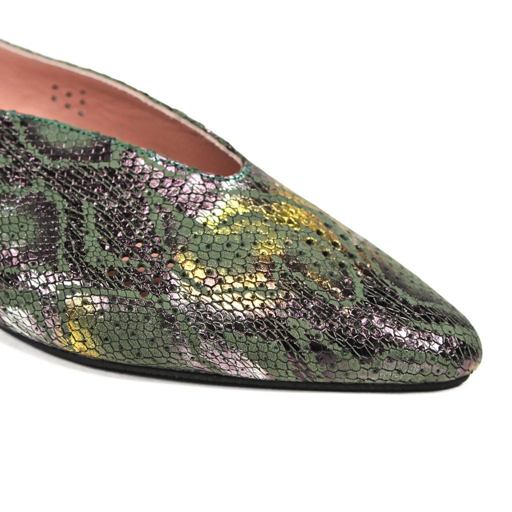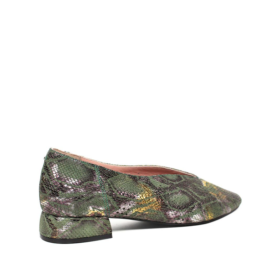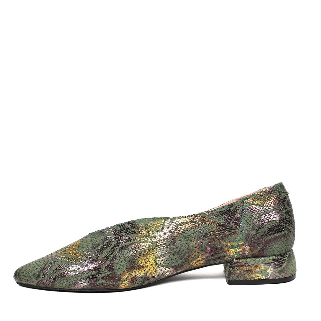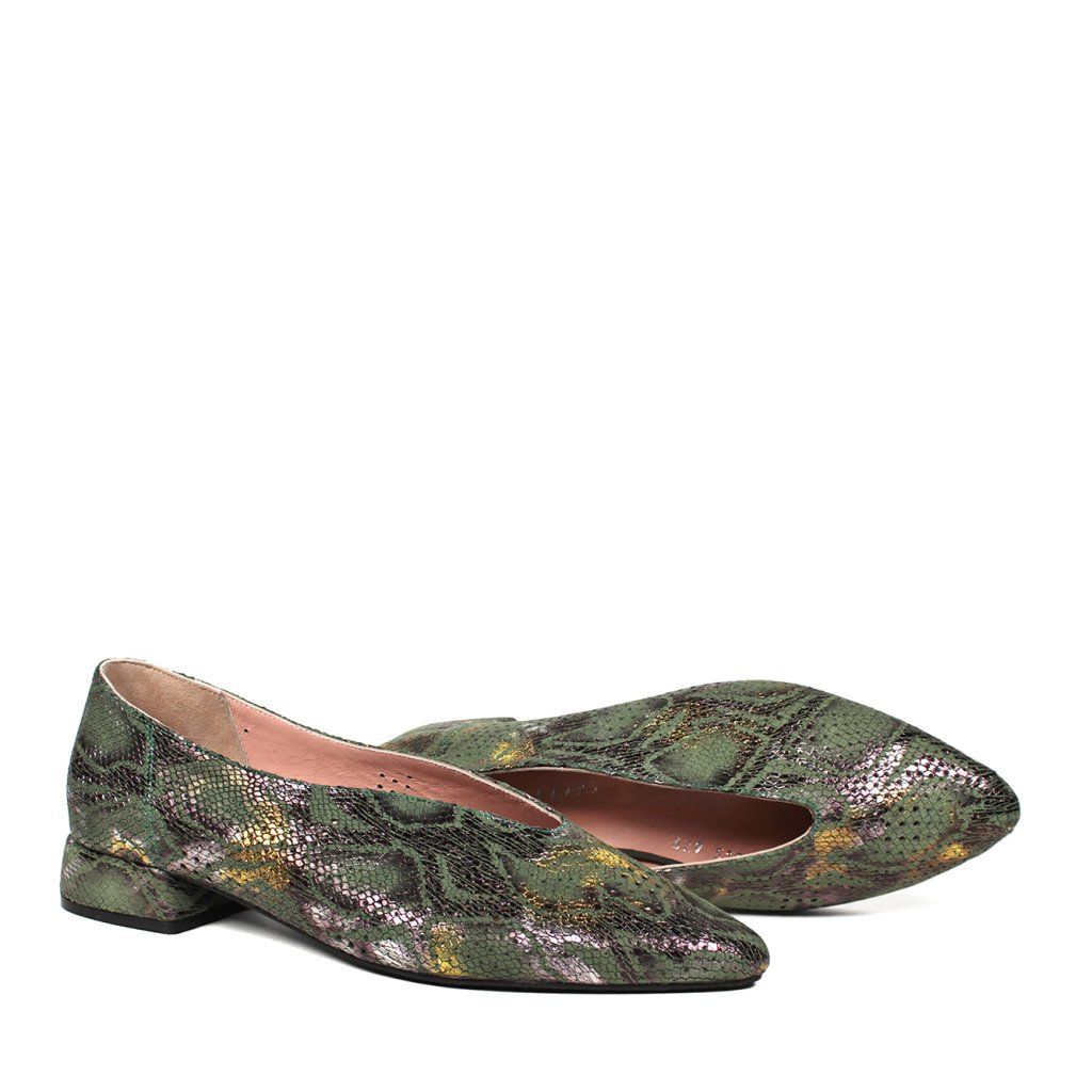 Dizajn: Originálny hadí vzor s jemným metalickým odleskom v zeleno-zlatých tónoch, ktorý dodáva obuvi luxusný nádych.