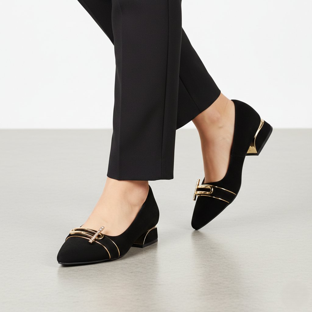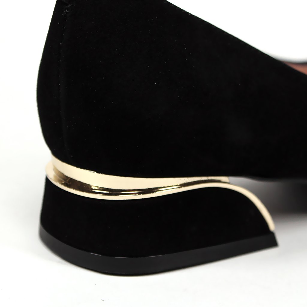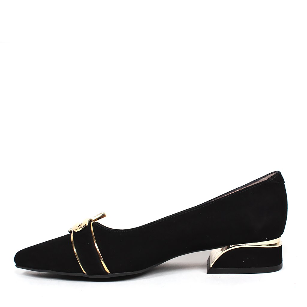 Tieto rafinované dámske topánky s čiernym semišovým zvrškom sú dokonalou kombináciou klasickej elegancie a moderného dizajnu. Špicatá špička a zlaté kovové zdobenie na priehlavku okamžite upútajú pozornosť a dodávajú celkovému vzhľadu luxusný nádych. Výnimočnosťou tohto modelu je stabilný, nízky blokový podpätok, ktorý je ozvláštnený jedinečným zakriveným zlatým detailom, vďaka čomu pôsobí veľmi štýlovo. Vnútorná časť s mäkkou podšívkou v prírodnom tóne zaručuje dlhotrvajúce pohodlie, takže tieto lodičky sú ideálnou voľbou nielen do kancelárie, ale stanú sa aj ozdobou každého večerného outfitu.