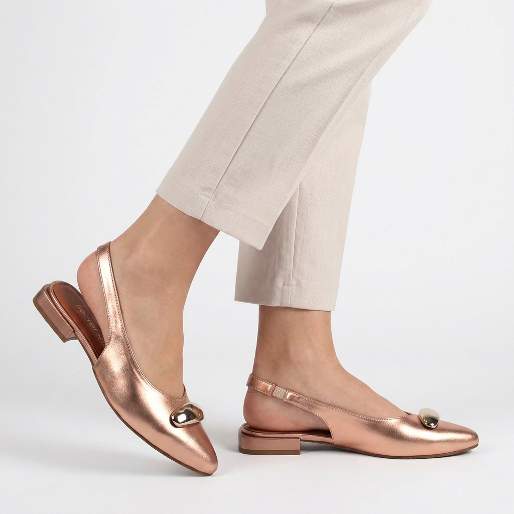 Tieto úchvatné metalické ružovo-zlaté lodičky s otvorenou pätou (slingback) zaručene upútajú pozornosť. Dizajn so špicatou špičkou robí skutočne výnimočným a moderným výrazná ozdoba z lešteného zlata. Otvorená pätová časť a tenký, flexibilný remienok zaisťujú pohodlné nosenie, zatiaľ čo nízky metalický podpätok dodáva jemnú eleganciu. Sú ideálnou voľbou k príležitostným šatám, ale okamžite premenia na štýlový aj jednoduchší outfit s džínsami.