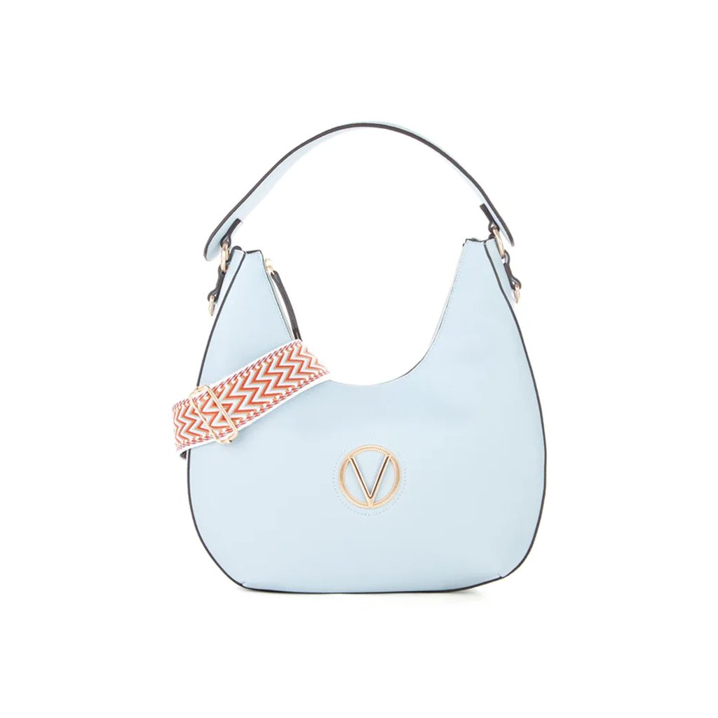 Veľká kabelka s písmenom V vo svetlo zlatej farbe. Má odnímateľný viacfarebný ramenný popruh a štandardný remienok z ekokože.