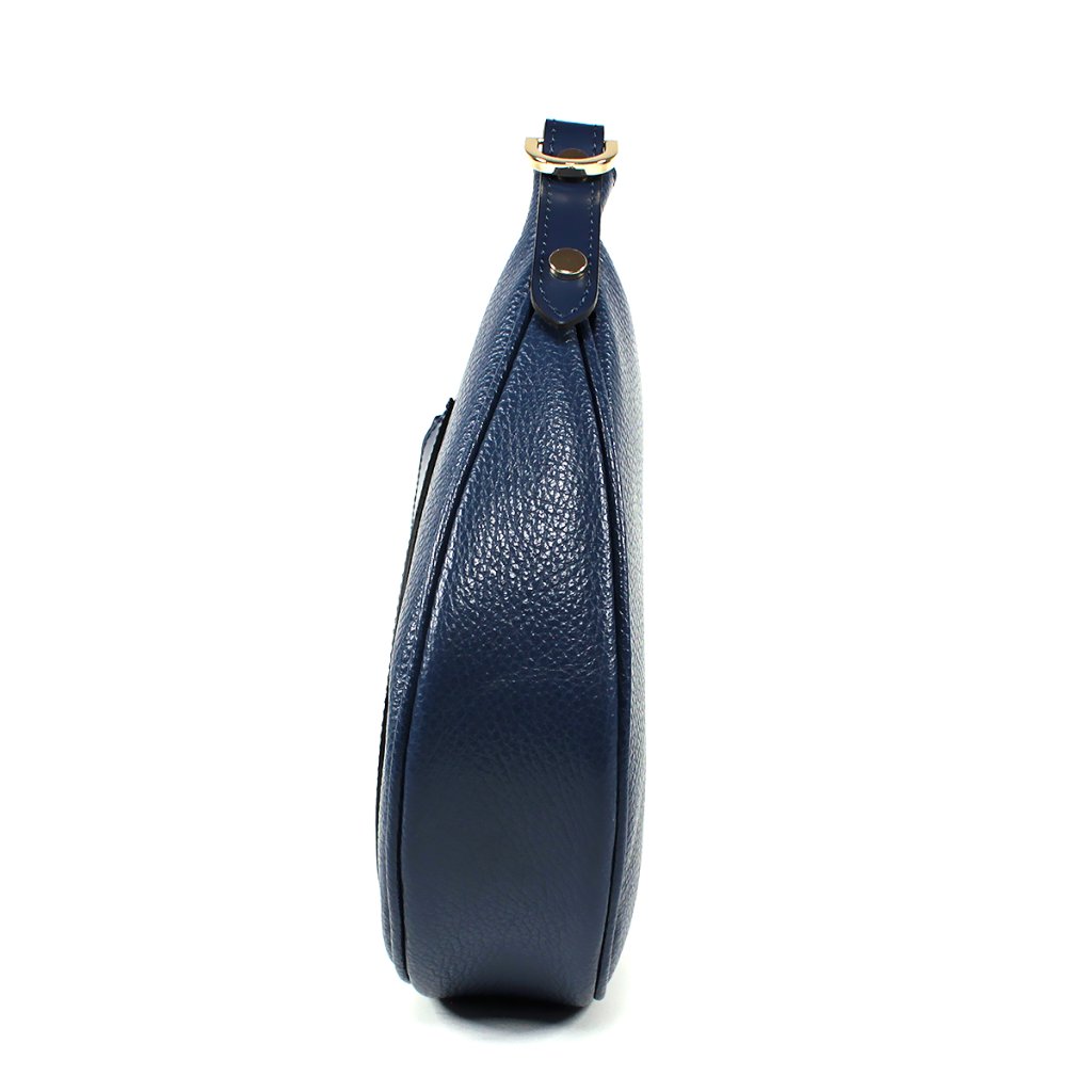 Táto štýlová a moderná tmavomodrá kožená kabelka z kolekcie Secret je ideálnou voľbou v duchu každodennej elegancie. Taška vyniká svojím jedinečným polmesiacovým dizajnom a povrchom z prémiovej textúrovanej kože, ktorú dopĺňa hladké predné vrecko a zlaté kovové doplnky, dodávajúce celku skutočnú sofistikovanosť. Priestranné vnútro poskytuje dostatok miesta pre vaše cennosti, zatiaľ čo široký, nastaviteľný a odnímateľný popruh zaručuje pohodlné nosenie na ramene alebo krížom cez telo.