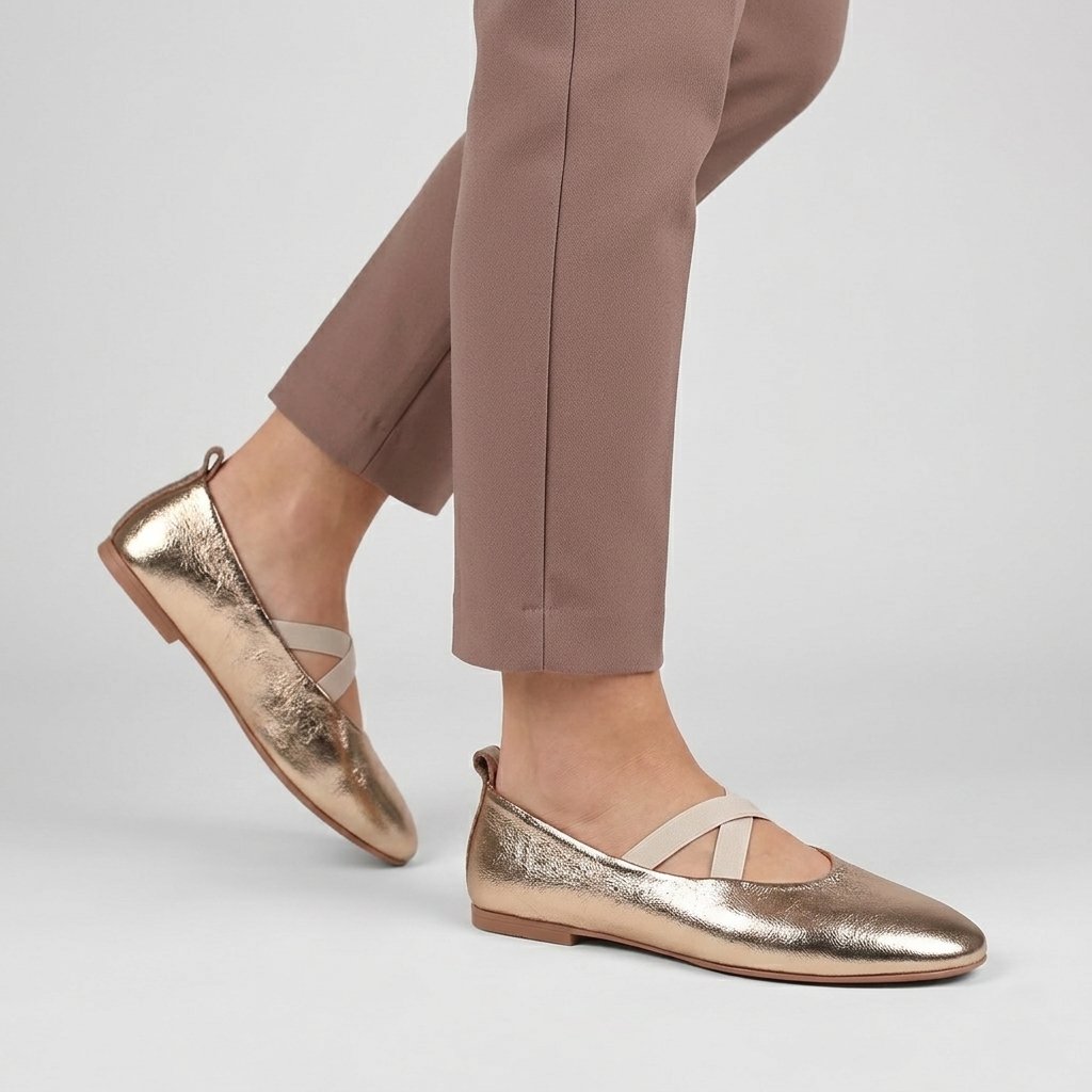 Tieto balerínky značky Secretshoes predstavujú dokonalé spojenie pohodlia a moderného štýlu. Žiarivý metalický povrch v odtieni šampanského zlata okamžite upúta pozornosť a premení aj ten najjednoduchší outfit na slávnostný a výnimočný kúsok. Praktické prekrížené gumičky dodávajú obuvi nielen pôvabný baletný vzhľad, ale zabezpečujú aj stabilné nosenie počas celého dňa. Mäkké vnútro a flexibilná podrážka zaručujú maximálny komfort, či už sa chystáte na elegantnú udalosť alebo prežívate rušný pracovný deň.