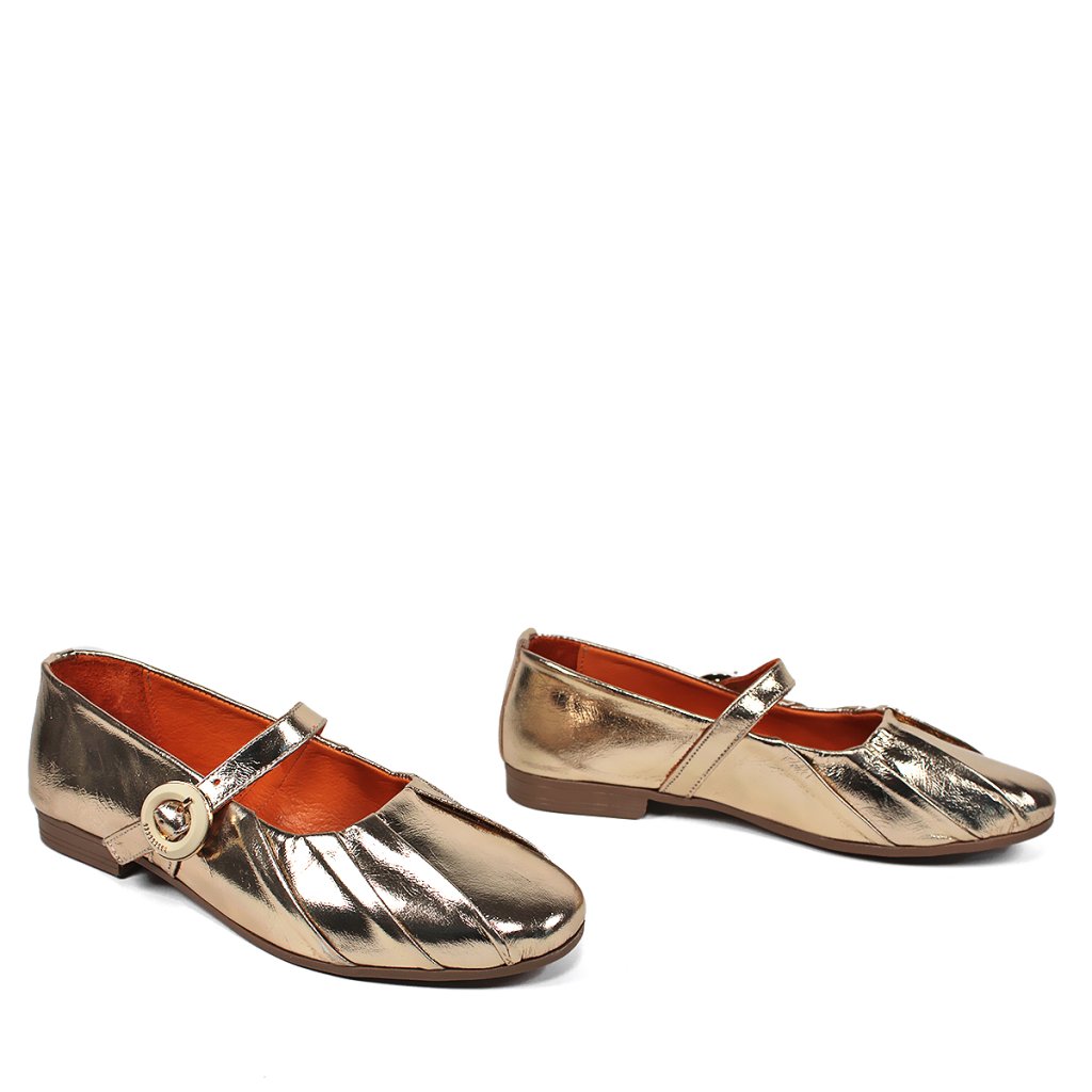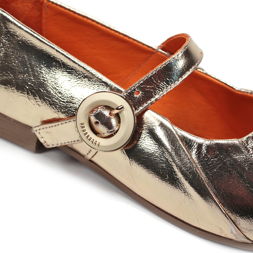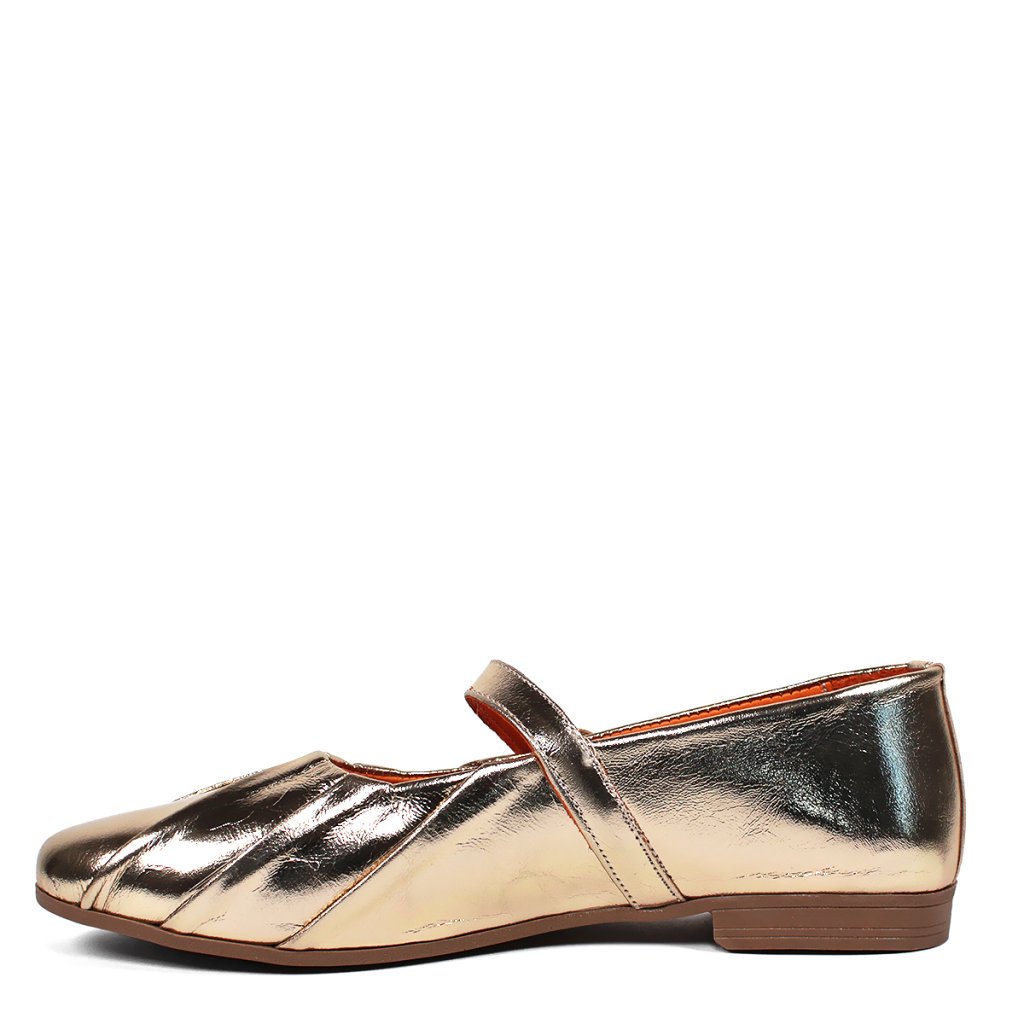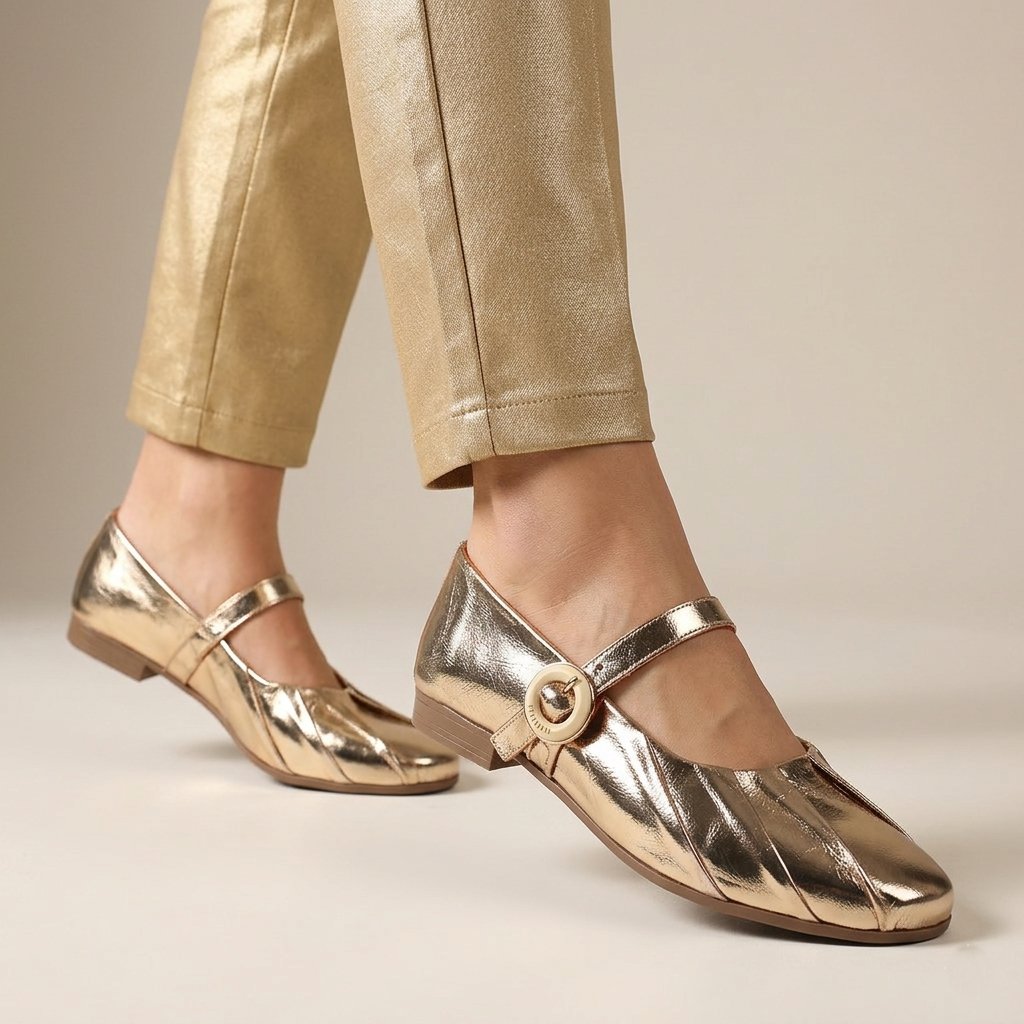 Tieto úchvatné dámske topánky značky Secretshoes sú modernou a extravagantnou reinterpretáciou klasického štýlu Mary Jane, ktorá sa zaručene stane jedným z najvýnimočnejších kúskov vášho šatníka. Žiarivý metalický odtieň šampanského zlata a jedinečne textúrovaná, riasená špička vyžarujú odvážnu eleganciu, zatiaľ čo remienok s okrúhlou ozdobnou sponou s antickým nádychom dodáva obuvi stabilitu a jedinečný charakter. Nízky podpätok a kontrastná hnedá podrážka vytvárajú ideálnu rovnováhu medzi štýlom a celodenným pohodlím, vďaka čomu sú ideálnou voľbou k elegantnému kancelárskemu outfitu alebo ako výrazný prvok pre večerné príležitosti.