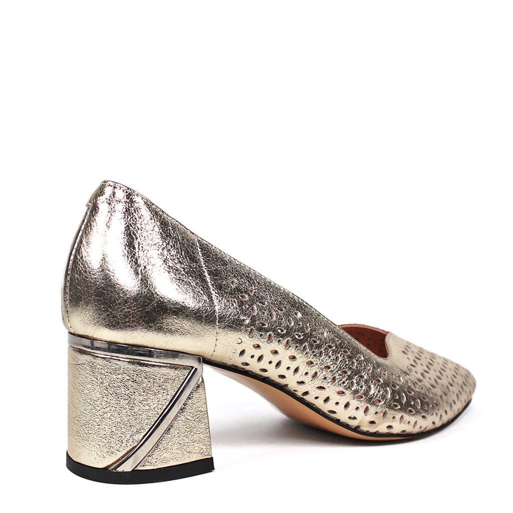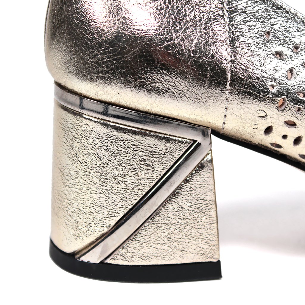 Tieto elegantné lodičky v zlatej farbe sú ideálnou voľbou pre dámy, ktoré obľubujú sofistikovaný a jedinečný štýl. Špeciálny perforovaný vzor pôsobí nielen ako efektný vizuálny prvok, ale zabezpečuje aj vynikajúcu priedušnosť. Stabilný, stredne vysoký blokový podpätok je doplnený moderným kovovým detailom, vďaka čomu poskytuje celodenné pohodlie bez kompromisov v elegancii. Špicatá špička a jemné línie dodávajú vzhľadu ženskosť, či už ide o pracovné stretnutie alebo večernú spoločenskú udalosť.