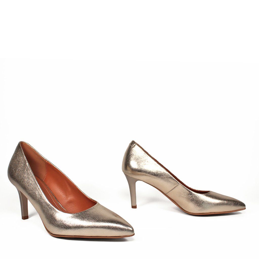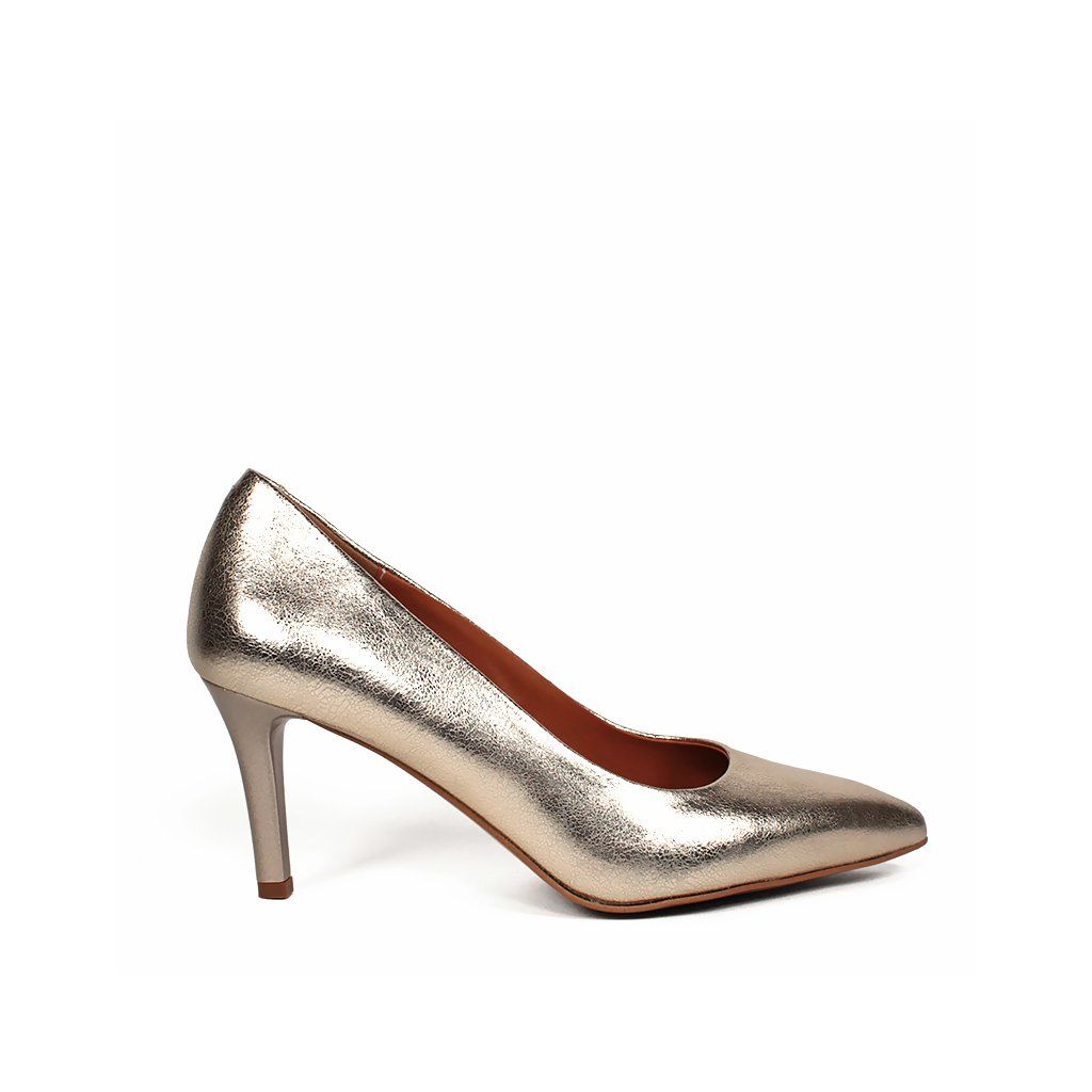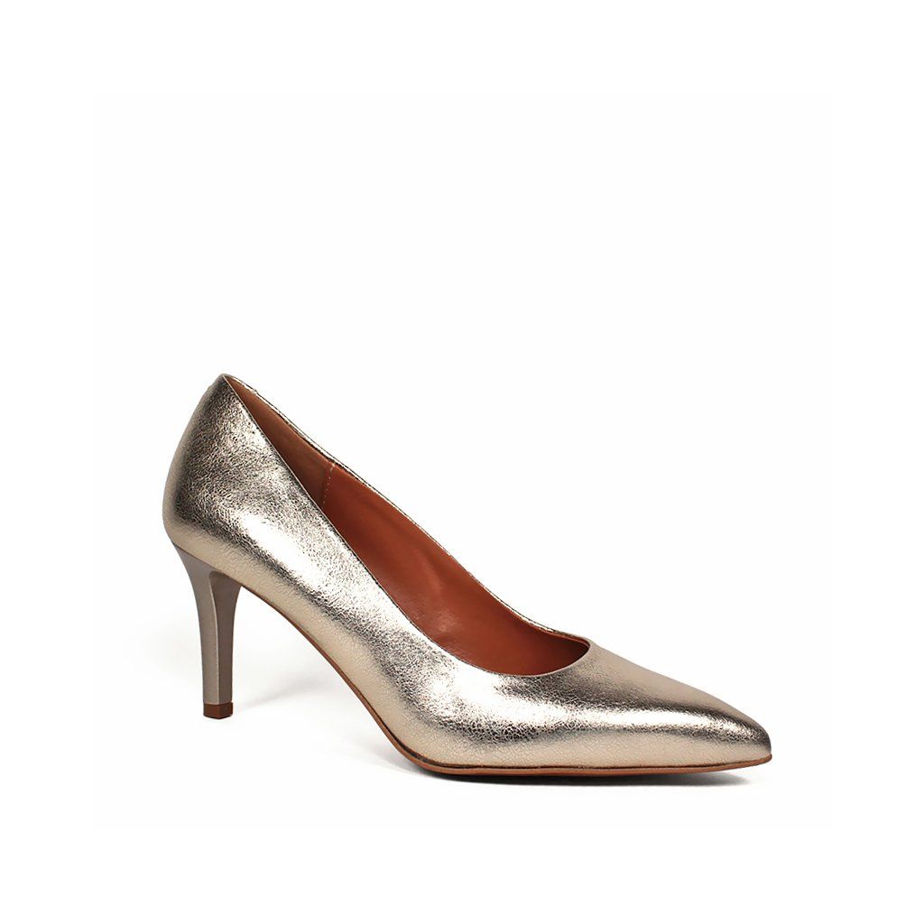 Ich klasický, zašpicatený strih a vysoký, štíhly podpätok krásne predĺžia siluetu a dodajú chôdzi potrebnú gráciu. Metalická úprava kože s jemnou textúrou odráža svetlo a dodáva topánkam hĺbku.