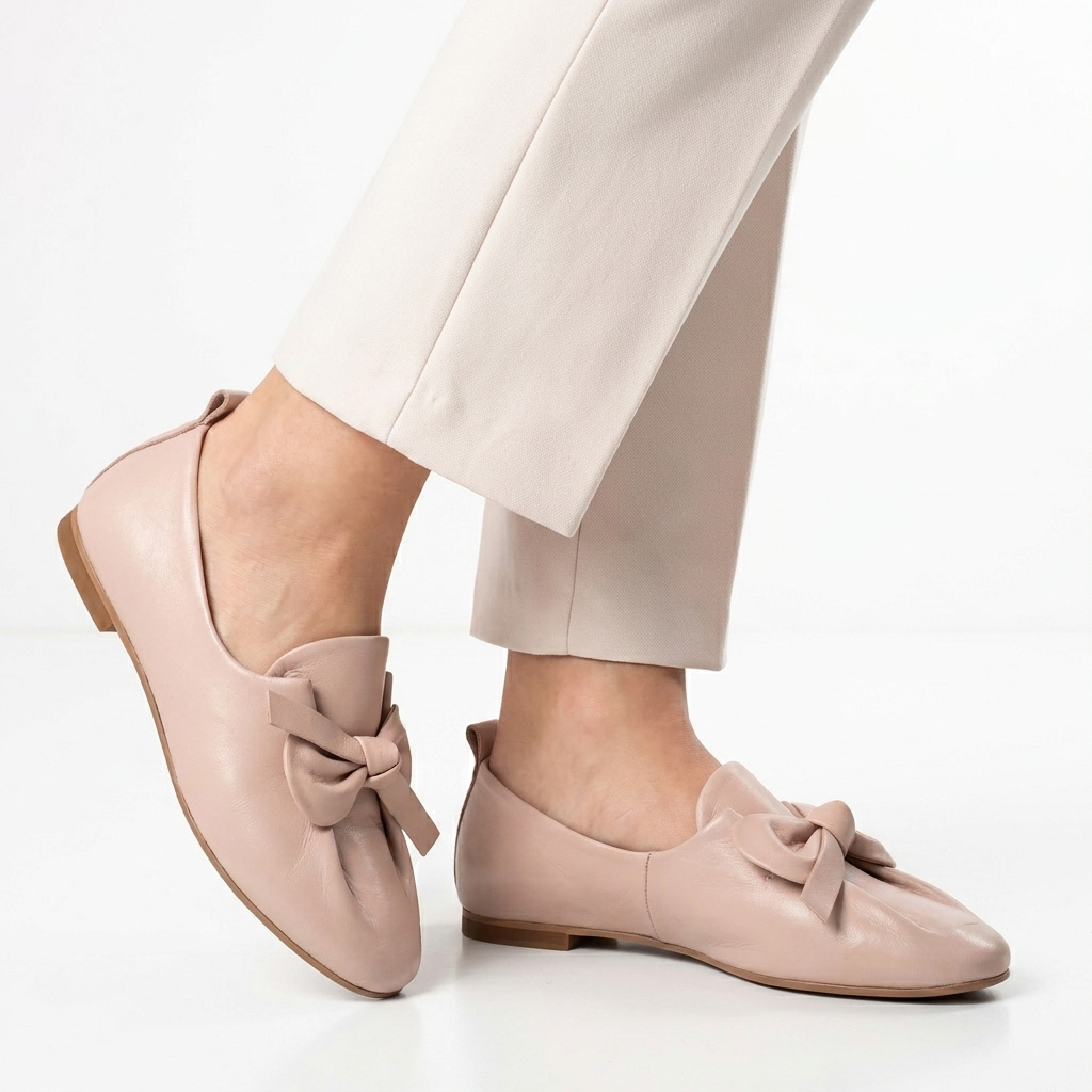 Tieto elegantné kožené mokasíny v krémovej farbe predstavujú dokonalé spojenie ženskosti a každodenného pohodlia. Výnimočnosť obuvi dodáva mašľa v rovnakej farbe a materiáli, ktorá sa nachádza na hornej časti a dodáva topánkam romantický, no zároveň moderný vzhľad. Kvalitné spracovanie z mäkkej kože a nízky podpätok zaručujú komfort počas celého dňa, zatiaľ čo jemne špicatá špička opticky predlžuje postavu. Sú ideálnou voľbou do práce, na elegantnejšie príležitosti alebo aj na štýlovú prechádzku mestom.