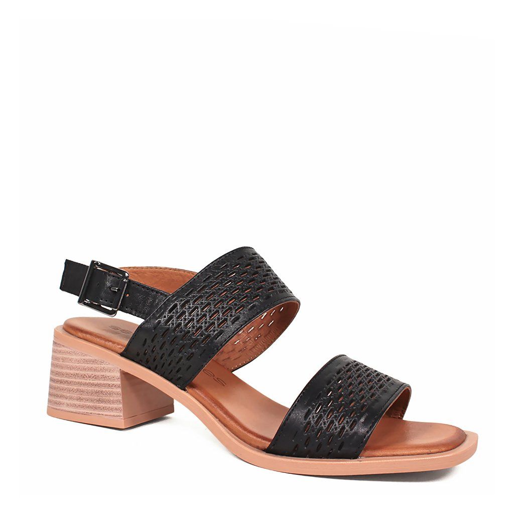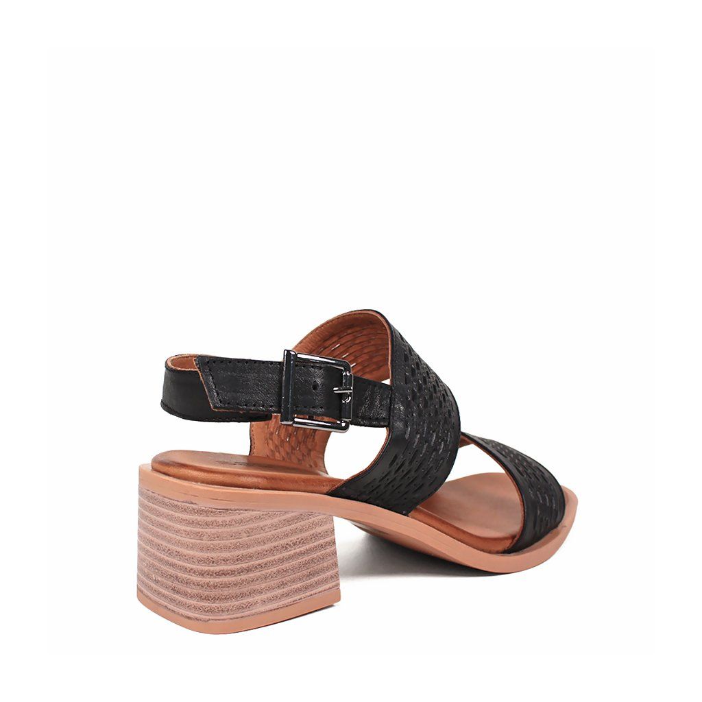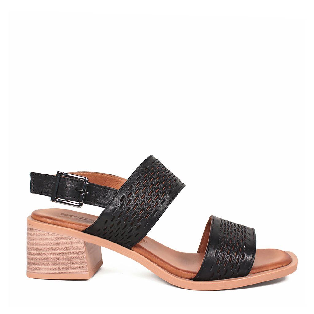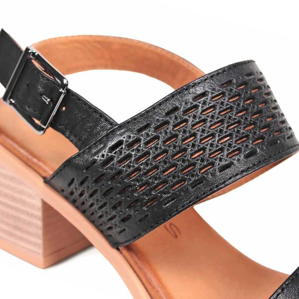 Tieto čierne kožené sandále sú dokonalou kombináciou štýlu a pohodlia, vďaka čomu sú ideálnou voľbou na každodenné nosenie aj špeciálne príležitosti. Výnimočnosť obuvi dodávajú laserom vyrezávané perforované remienky, ktoré sú nielen estetické, ale zabezpečujú aj vynikajúcu priedušnosť pre nohu. Stabilný stredne vysoký blokový podpätok má textúru s prirodzeným efektom dreva, čo vytvára moderný kontrast s tmavým zvrškom. Pomocou elegantnej pracky na päte sa sandále dajú presne prispôsobiť chodidlu, zatiaľ čo polstrovaná vnútorná stielka zaručuje pocit komfortu počas celého dňa.