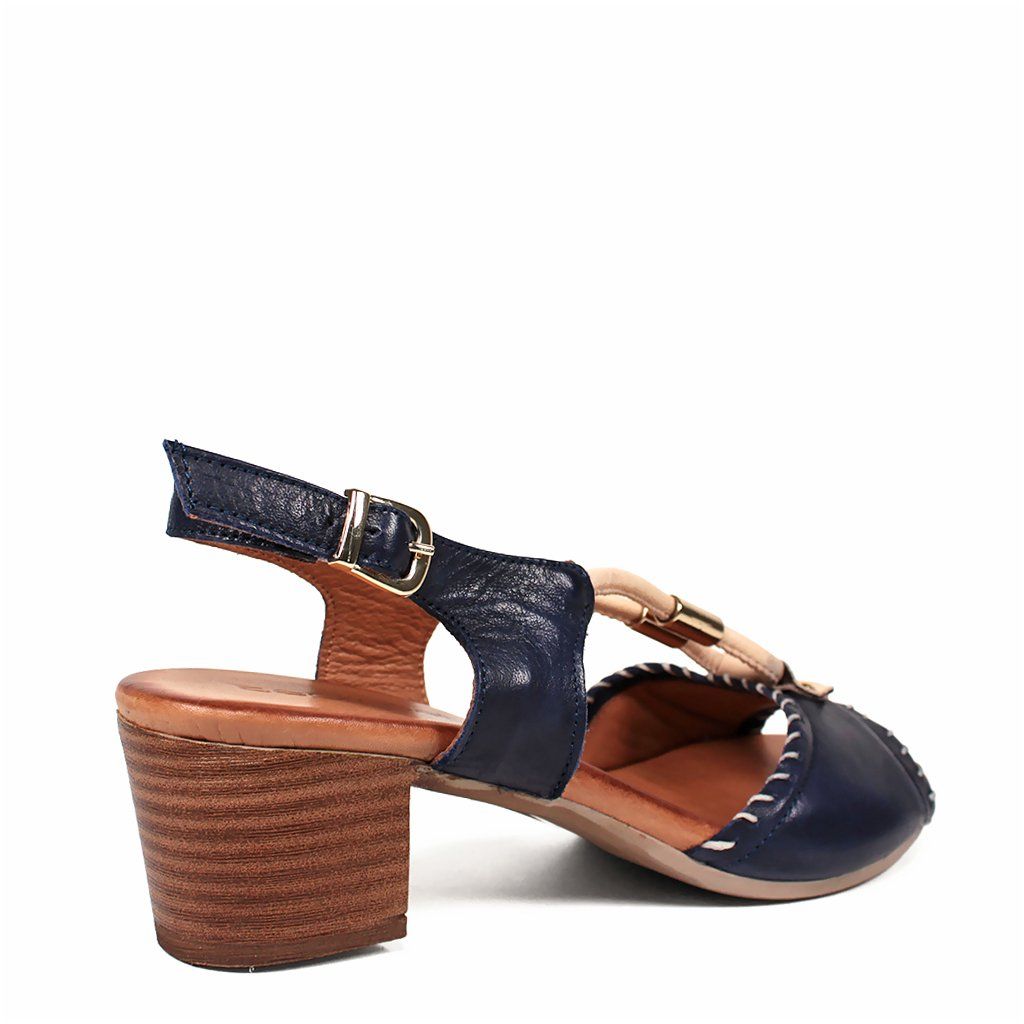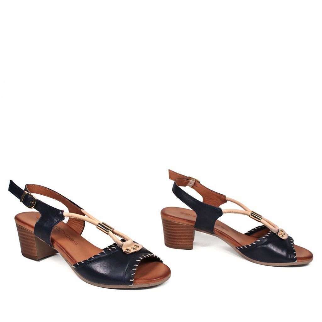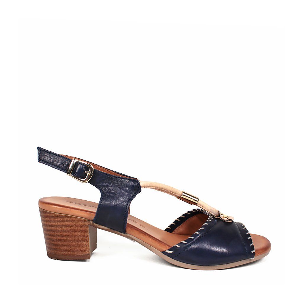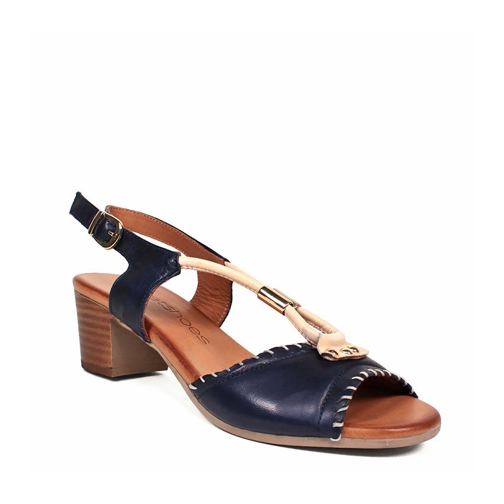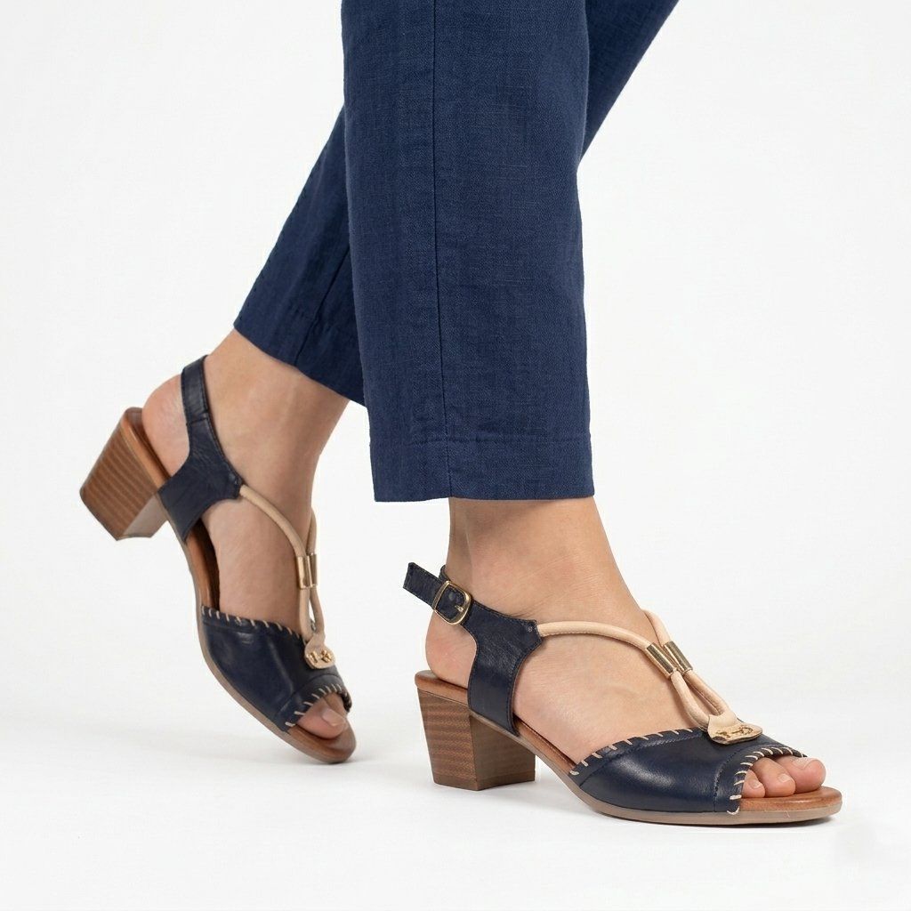 Tieto tmavomodré kožené sandále sú spojením vycibreného štýlu a pohodlia, vďaka čomu sú ideálnym doplnkom letného šatníka. Eleganciu obuvi podčiarkuje kontrastné biele prešívanie a krémové remienky, ktoré spája vkusná kovová ozdoba v zlatom tóne. Stabilný, stredne vysoký podpätok s dreveným efektom a polstrovaná vnútorná stielka zaisťujú komfortné nosenie počas celého dňa, zatiaľ čo nastaviteľný remienok so sponou okolo členka umožňuje dokonalé prispôsobenie.