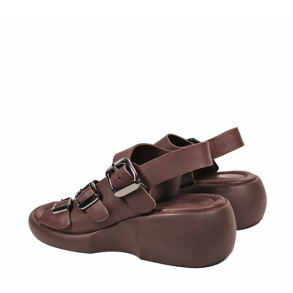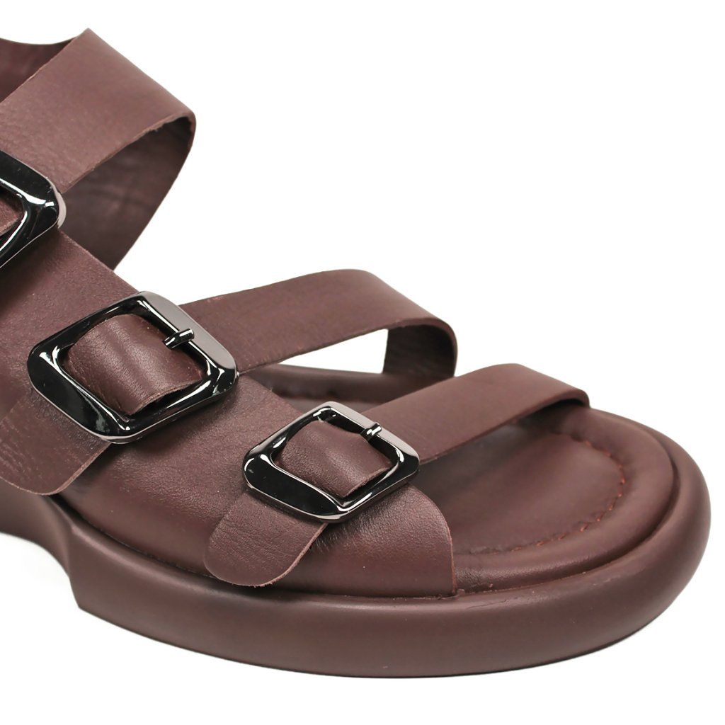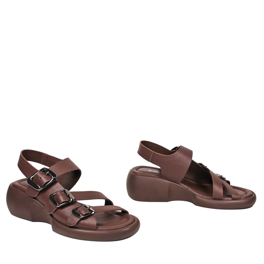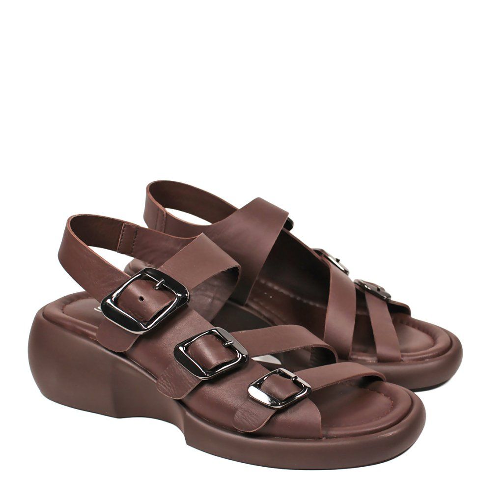 Tieto moderné hnedé dámske sandále predstavujú dokonalé spojenie pohodlia a štýlu na každý deň. Charakter obuvi dodávajú tri hrubšie remienky nastaviteľné striebornými prackami, ktoré sú nielen vizuálne príťažlivé, ale zabezpečujú aj precízne prispôsobenie nohe. Špeciálne tvarovaná masívna platforma dodáva modelu moderný a športovo-elegantný vzhľad, pričom poskytuje chodidlám optimálnu oporu. Mäkká stielka a zadný remienok, ktorý pevne drží pätu, zaručujú celodenný komfort, vďaka čomu sú tieto sandále ideálnou voľbou na mestské prechádzky aj na dlhšie pracovné dni.