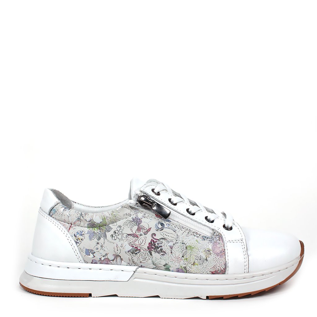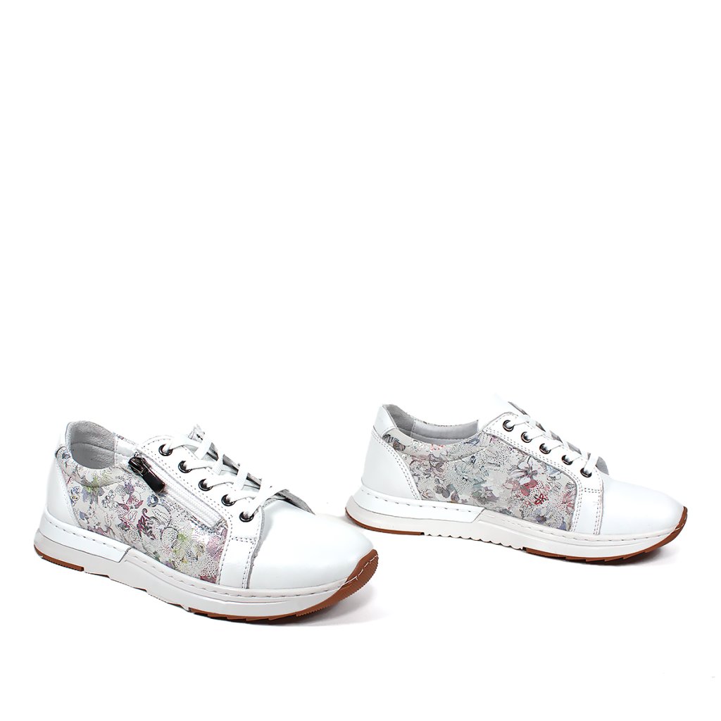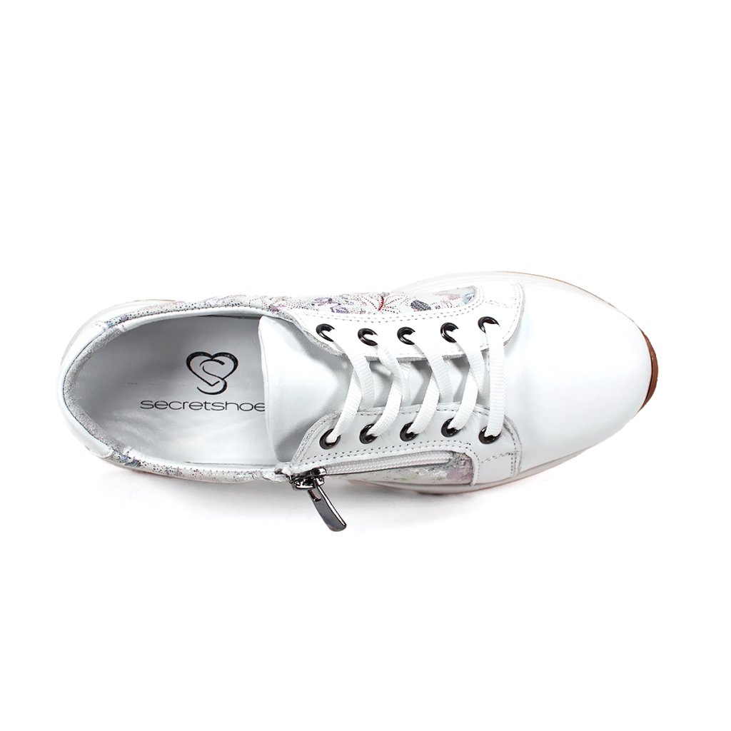 Tieto dámske tenisky značky Secretshoes sú dokonalou kombináciou pohodlia a jedinečného štýlu, ktorý vnesie sviežosť do vášho každodenného šatníka. Základná čistá biela farba topánok dodáva elegantný vzhľad, zatiaľ čo jemný kvetinový vzor v pastelových farbách na bočných paneloch pôsobí romanticky a umelecky. Okrem tradičného šnurovania sa na boku nachádza aj praktický zips, ktorý slúži nielen ako moderný dekoratívny prvok, ale výrazne uľahčuje aj obúvanie a vyzúvanie. Robustná biela podrážka s hnedou spodnou časťou zaručuje vynikajúcu priľnavosť a celodenný komfort, vďaka čomu je tento model ideálnou voľbou na mestské prechádzky aj voľnočasové aktivity.