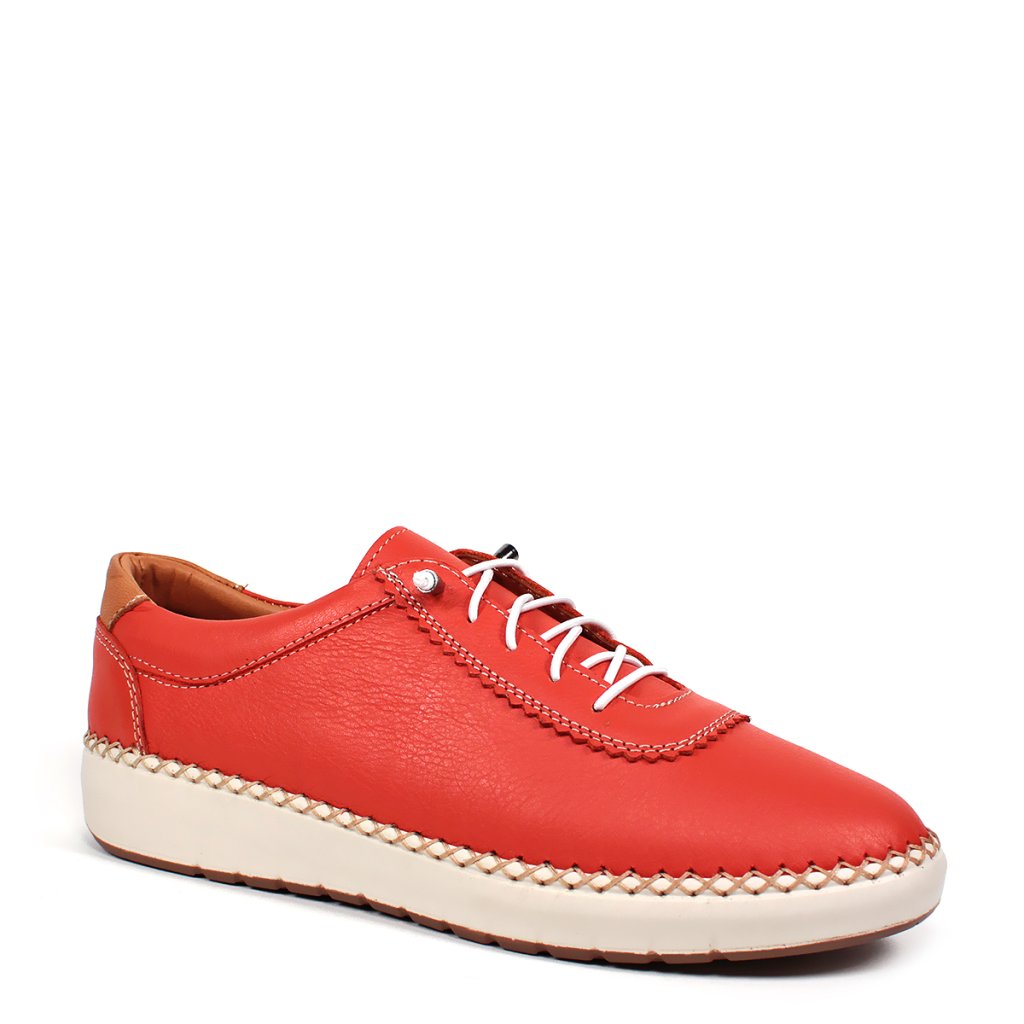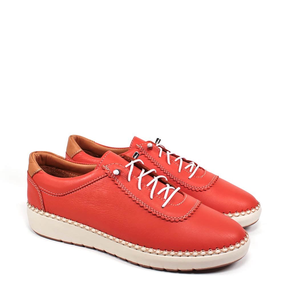Tieto žiarivo oranžové dámske kožené topánky značky Secretshoes predstavujú dokonalú kombináciu štýlu a pohodlia na každý deň. Zvršok vyrobený z prémiovko kvalitnej mäkkej kože zdobí unikátne ručné šitie s pleteným efektom pozdĺž podrážky, ktoré obuvi dodáva nielen odolnosť, ale aj výnimočný charakter. Kontrastné biele šnúrky a pružná, vyvýšená biela podrážka zabezpečujú moderný športový vzhľad, zatiaľ čo hnedý detail na päte prináša do celkového dizajnu jemnú eleganciu. Vnútorné prevedenie topánky spolu so stielkou s logom značky zaručujú celodenný komfort, vďaka čomu sú ideálnou voľbou na mestské prechádzky alebo rušné pracovné dni.