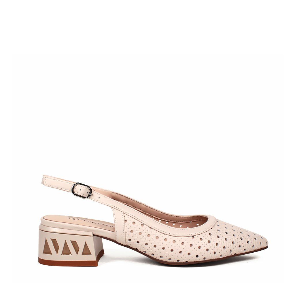 Tieto sofistikované dámske poltopánky v béžovom odtieni predstavujú dokonalú kombináciu klasickej elegancie a moderného dizajnu. Dizajn so špicatou špičkou ozvláštňuje jemný perforovaný vzor po celom povrchu, ktorý poskytuje nielen estetický vzhľad, ale aj vynikajúcu priedušnosť počas teplejších dní. Pohodlný a stabilný blokový podpätok je zdobený jedinečným vyrezávaným geometrickým vzorom, ktorý dodáva obuvi charakteristický vzhľad. Strih typu slingback s otvorenou pätou a nastaviteľným remienkom so sponou zaručuje bezpečné uchytenie a celodenný komfort, vďaka čomu sú ideálnou voľbou do kancelárie aj na slávnostné príležitosti.