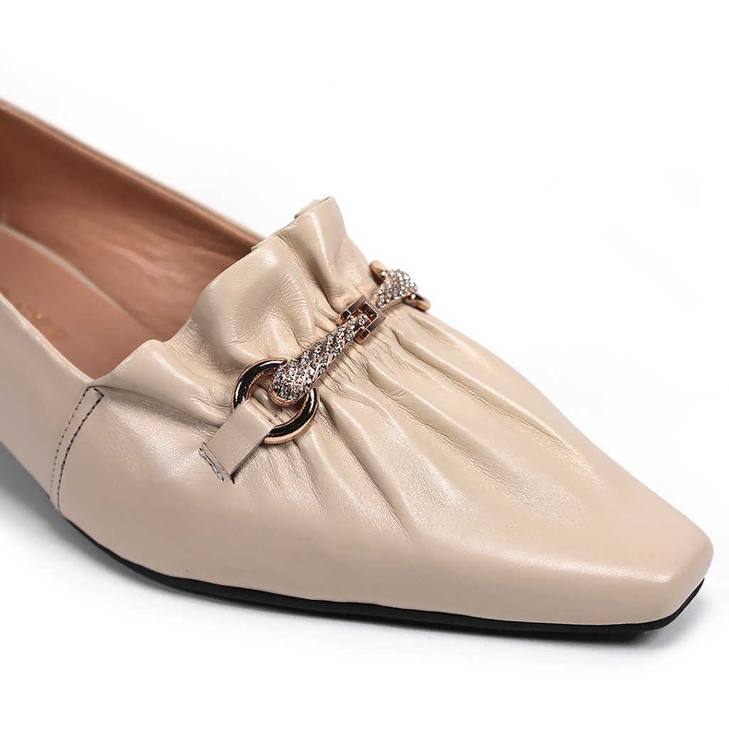 Tieto sofistikované lodičky značky Secretshoes sú dokonalou kombináciou modernej elegancie a pohodlia. Zvršok z jemnej kože v béžovom odtieni a špeciálna nariasená špička dodávajú topánkam jedinečný charakter, ktorý umocňuje kovová ozdoba v tóne rosegold zdobená trblietavými kamienkami. O stabilitu sa stará pevný nízky blokový podpätok, ktorého zadnú časť zdobí štýlové logo typické pre túto značku, čo zaručuje prémiový pocit pri každom kroku. Sú ideálnou voľbou do kancelárie aj k elegantným každodenným outfitom.