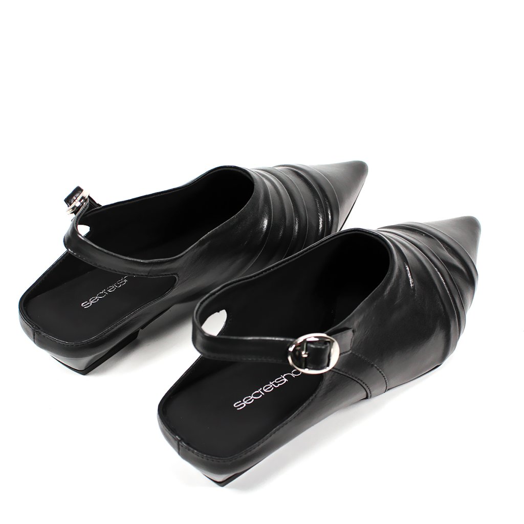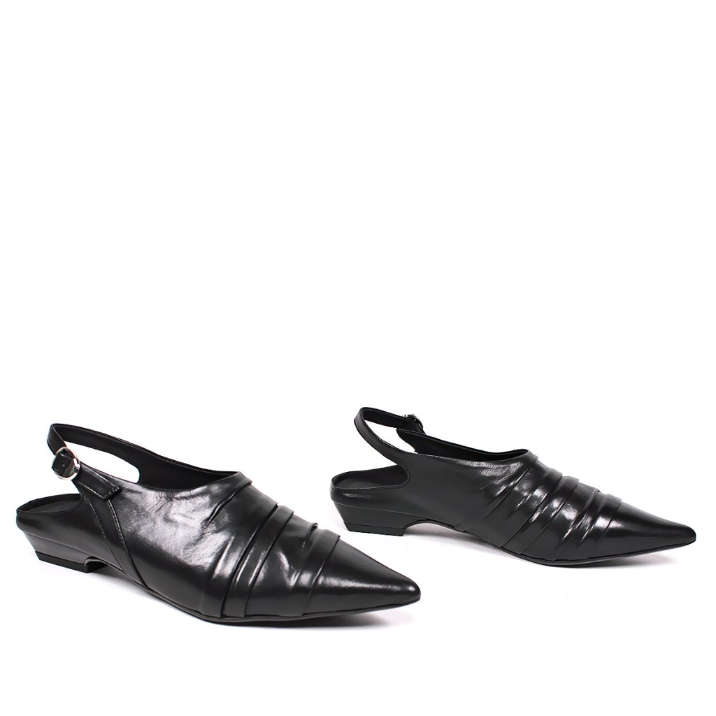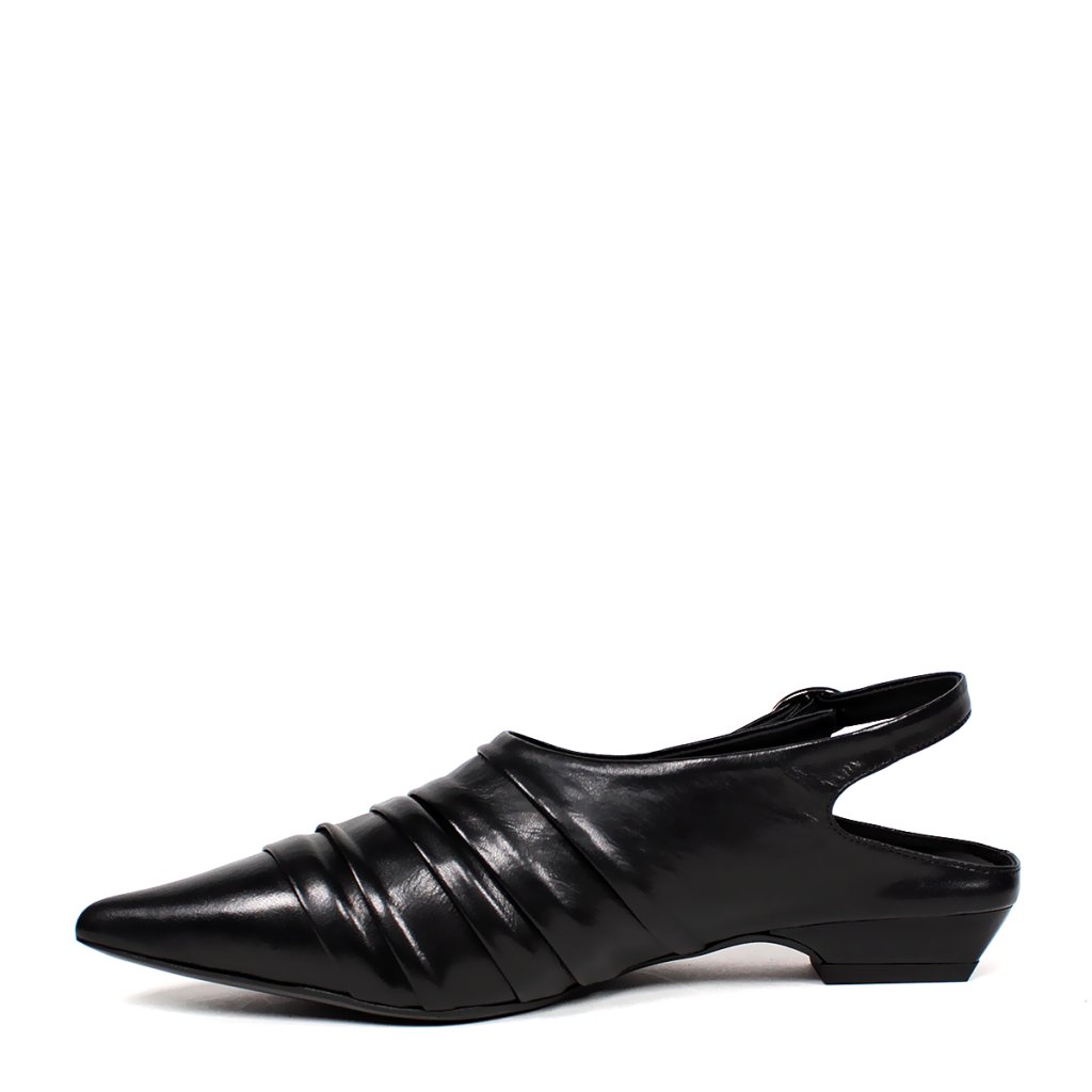 Tieto čierne poltopánky s voľnou pätou značky Secretshoes sú majstrovským spojením čistého minimalizmu a jedinečných textúr. Charakter obuvi dodáva špicatá špička a jemné riasenie na zvršku, ktoré prepožičiava mäkkej koži osobitú dynamiku. Otvorená päta a tenký remienok s nastaviteľnou prackou zaisťujú dokonalé prispôsobenie, zatiaľ čo mimoriadne nízky geometrický podpätok ponúka celodenné pohodlie bez straty štýlu. Tento model je vynikajúcou voľbou pre modernú ženu, ktorá hľadá kancelársku eleganciu a každodenný šmrnc v jednom nadčasovom kúsku.