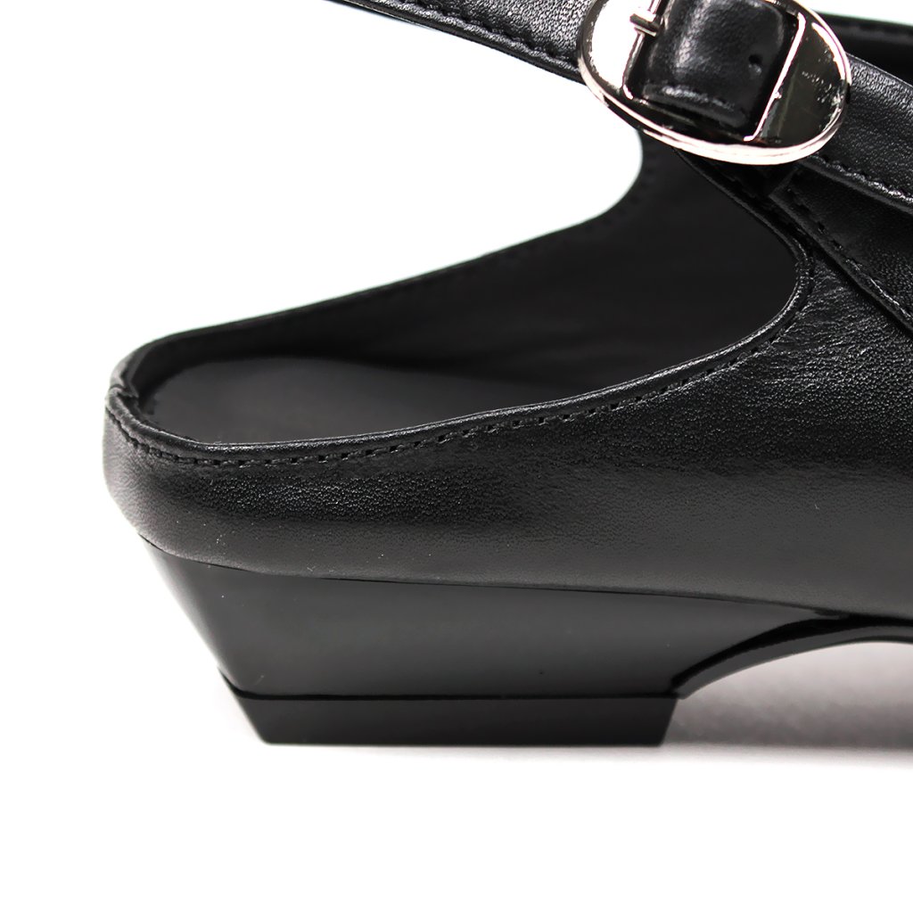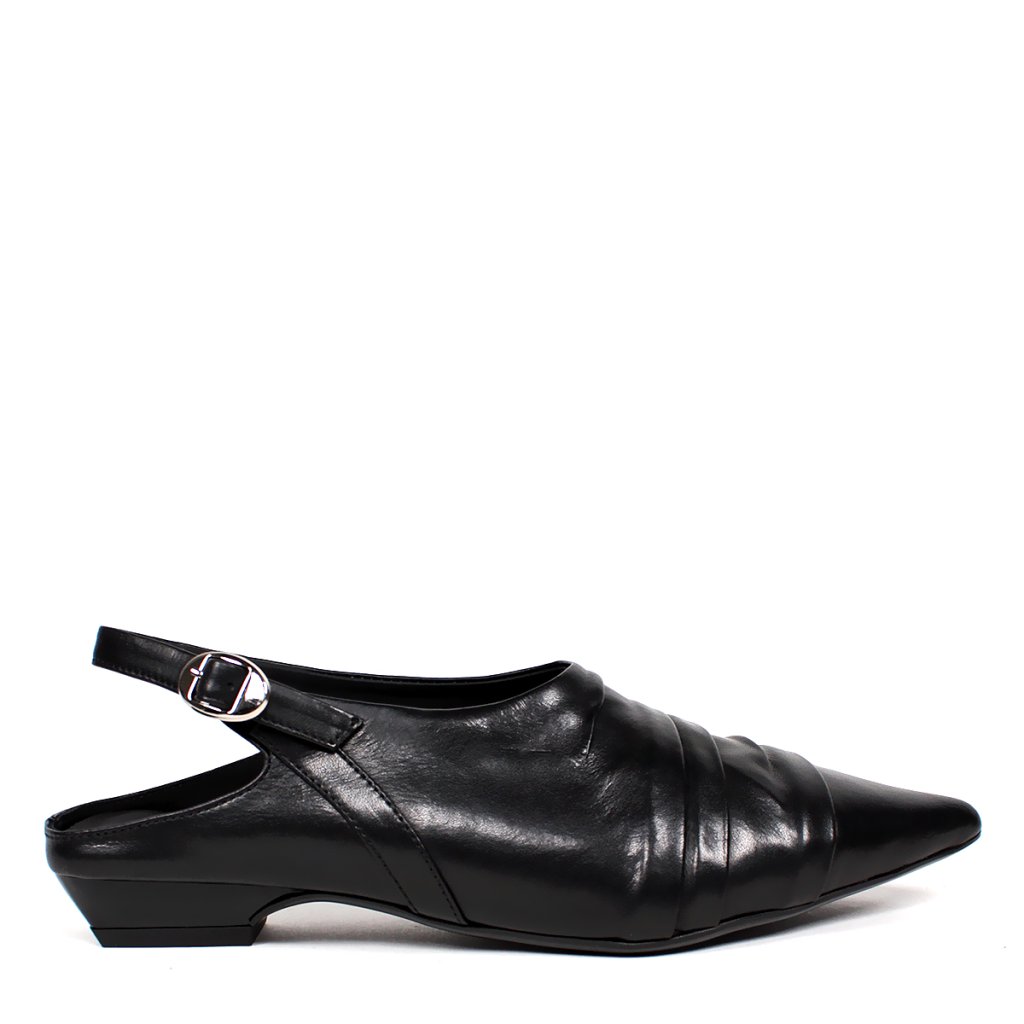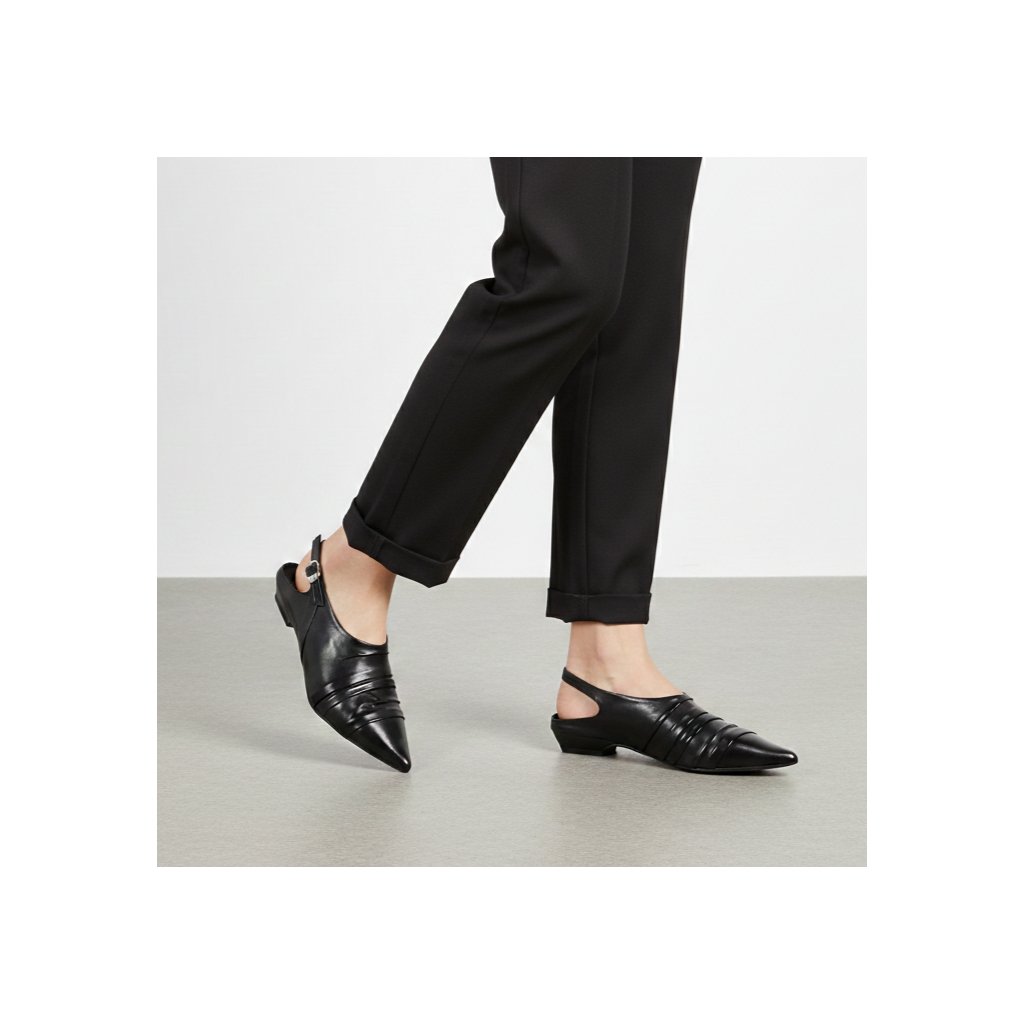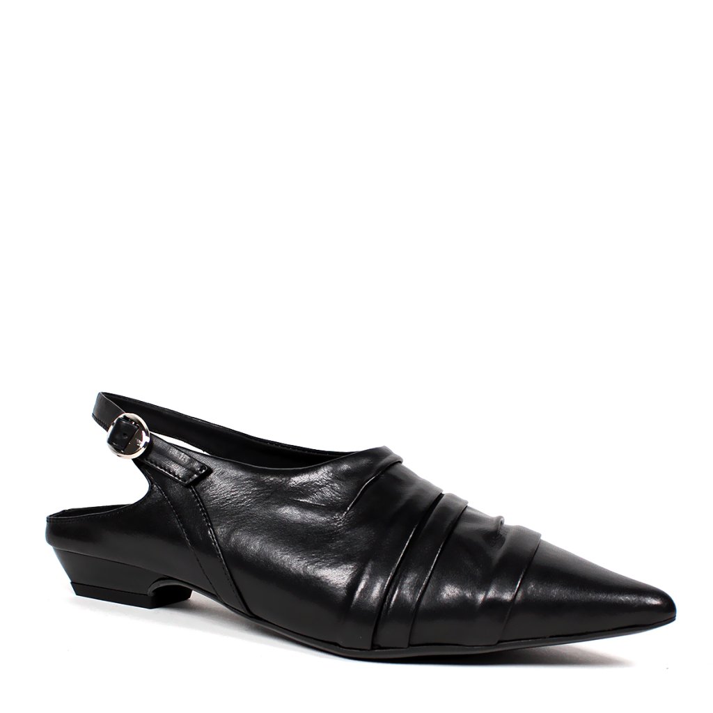 Tieto čierne poltopánky s voľnou pätou značky Secretshoes sú majstrovským spojením čistého minimalizmu a jedinečných textúr. Charakter obuvi dodáva špicatá špička a jemné riasenie na zvršku, ktoré prepožičiava mäkkej koži osobitú dynamiku. Otvorená päta a tenký remienok s nastaviteľnou prackou zaisťujú dokonalé prispôsobenie, zatiaľ čo mimoriadne nízky geometrický podpätok ponúka celodenné pohodlie bez straty štýlu. Tento model je vynikajúcou voľbou pre modernú ženu, ktorá hľadá kancelársku eleganciu a každodenný šmrnc v jednom nadčasovom kúsku.