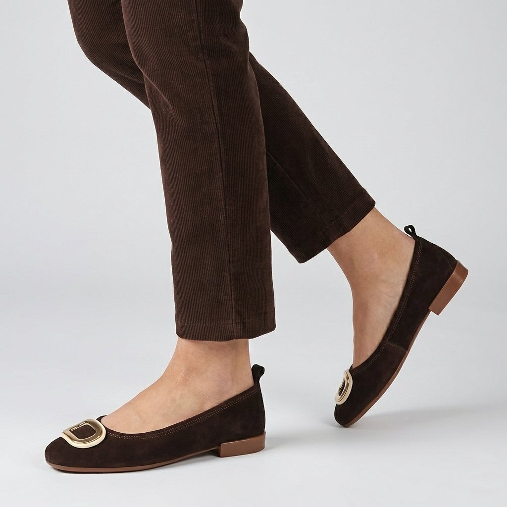 Tieto tmavohnedé semišové balerínky značky Secretshoes v sebe spájajú klasickú eleganciu s modernými detailmi. Zvršok z prémiového materiálu so zamatovým vzhľadom dopĺňa výrazná zlatá spona na špičke, ktorá dodáva obuvi nádych luxusu. Vnútorná podšívka v žiarivej oranžovej farbe prináša do dizajnu nečakaný a štýlový prvok, zatiaľ čo stabilný nízky podpätok a mäkká stielka zaručujú pohodlie aj počas dlhých pracovných dní. Ide o všestranný kúsok, ktorý vynikne rovnako dobre s elegantnými nohavicami ako aj so šatami.