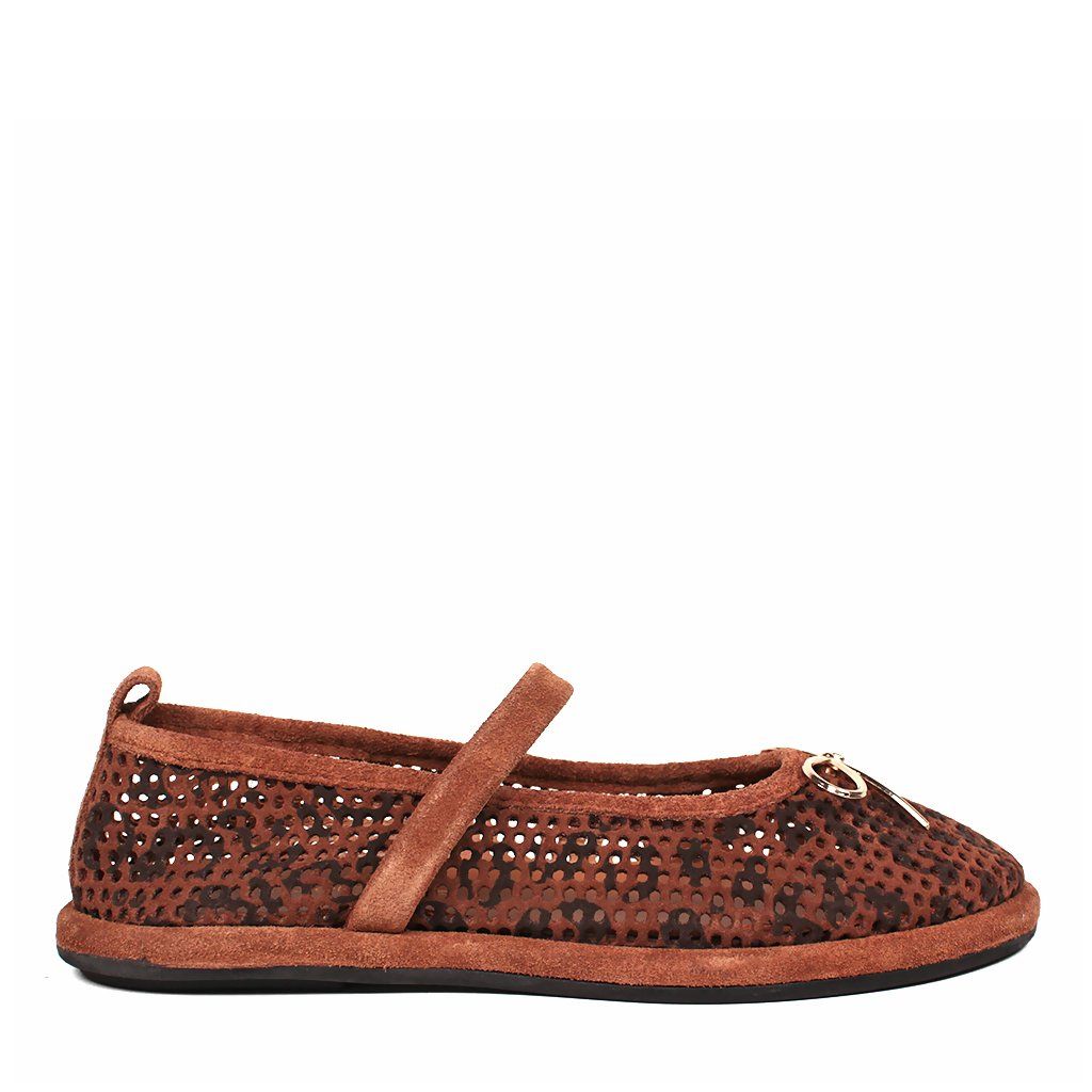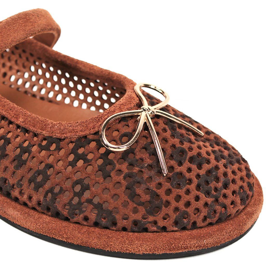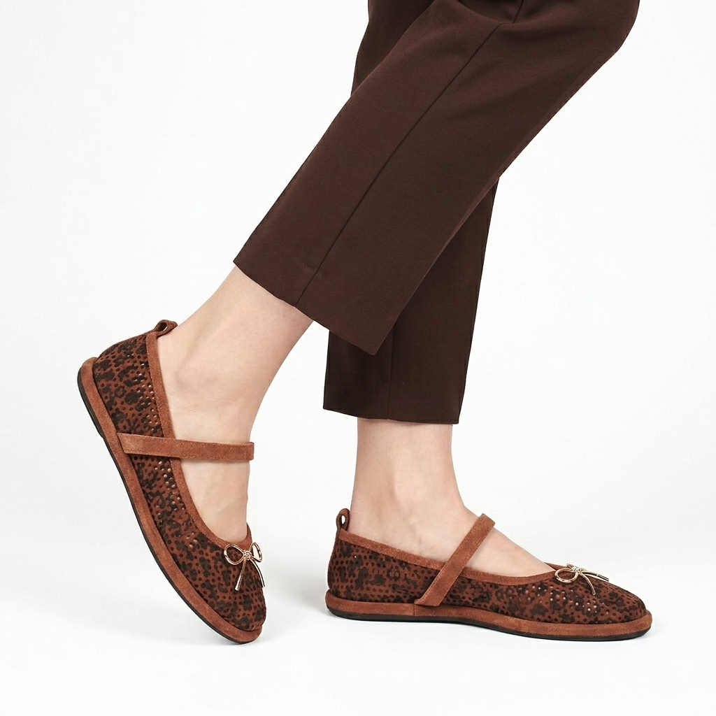 Tieto výnimočné hnedé semišové balerínky predstavujú dokonalú kombináciu ženskosti a pohodlia. Celoplošný dierovaný vzor dodáva obuvi nielen jedinečnú textúru, ale zabezpečuje aj vynikajúcu priedušnosť, vďaka čomu sú ideálnou voľbou aj počas teplejších dní. Remienok cez priehlavok poskytuje stabilné uchytenie, zatiaľ čo jemná zlatá mašlička na špičke dodáva modelu elegantný a romantický nádych. Mäkká podrážka a prírodný materiál sa postarajú o celodenný komfort, či už ide o prácu v kancelárii alebo ľahkú prechádzku mestom.