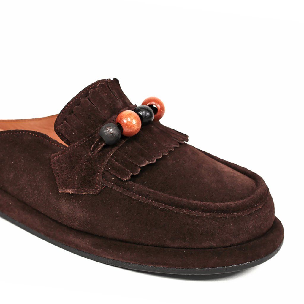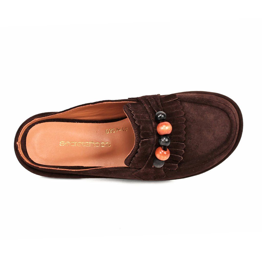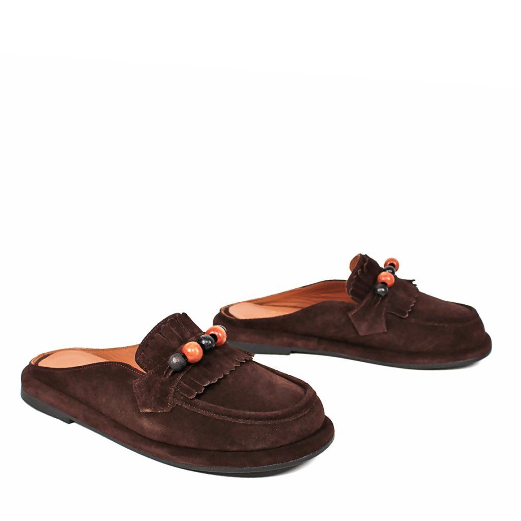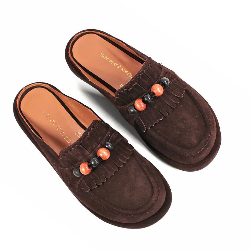 Štýlové nasúvacie šľapky s uzatvorenou špičkou od značky Secretshoes. Sú vyrobené z kvalitnej pravej kože v elegantnom hnedom odtieni a zdobené jemnými strapcami s farebnými korálikmi.