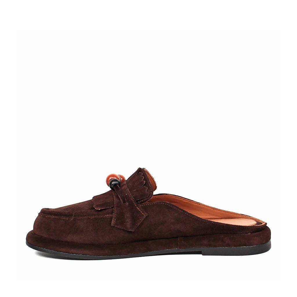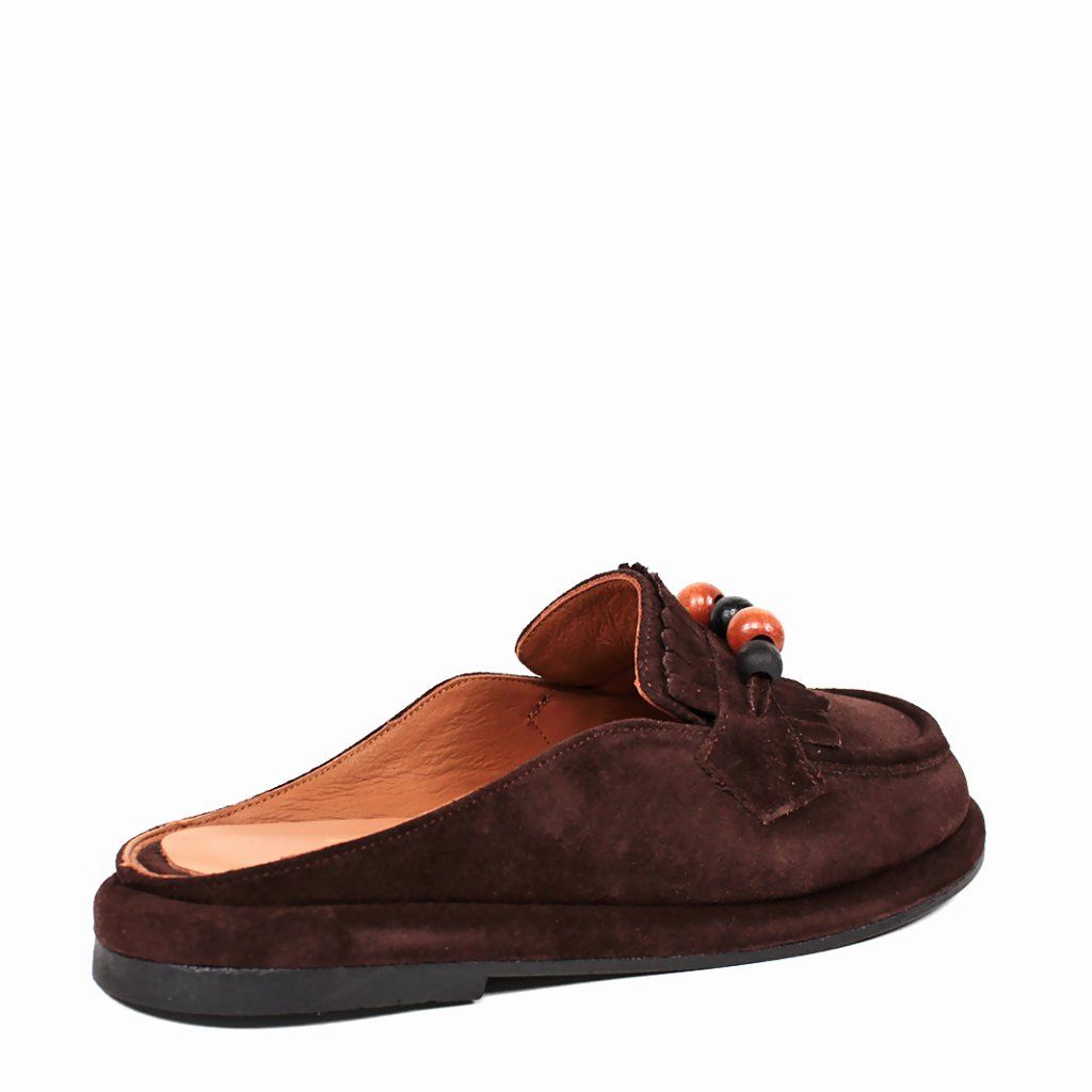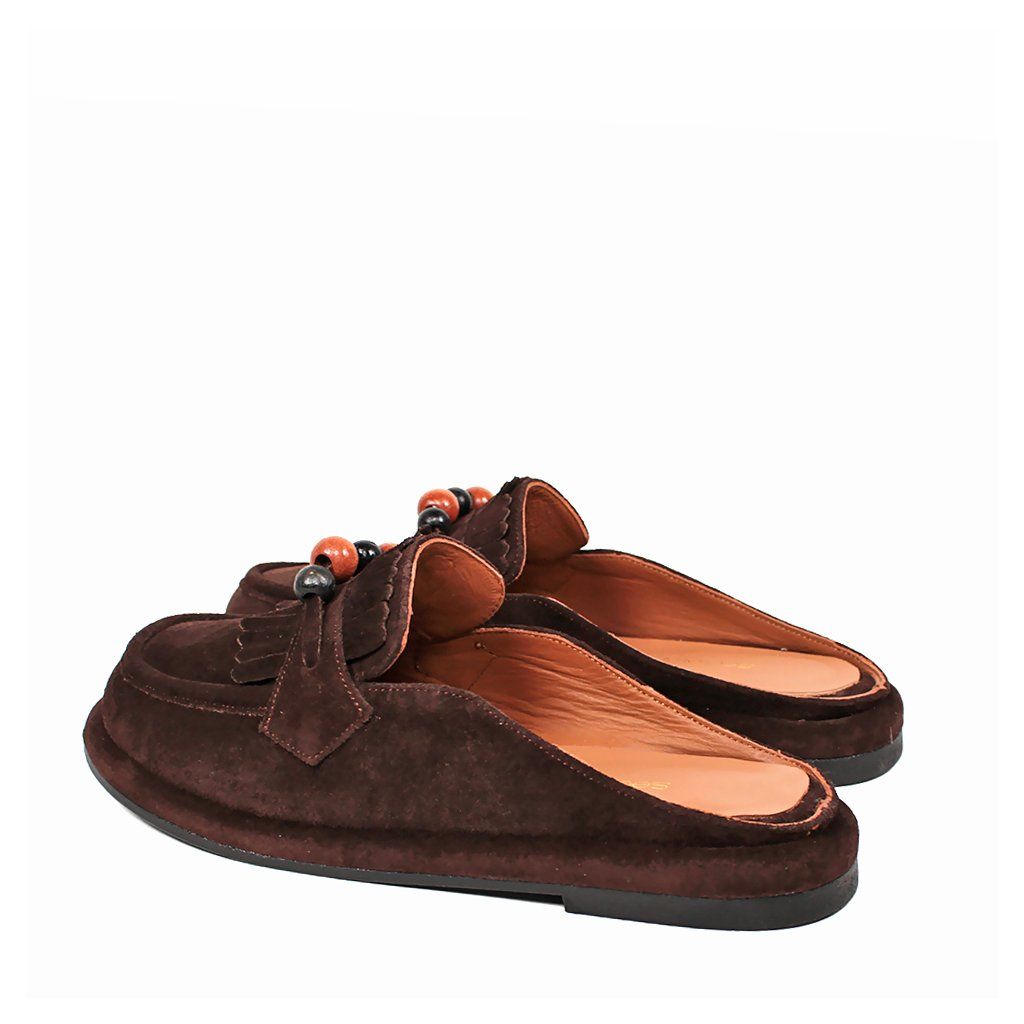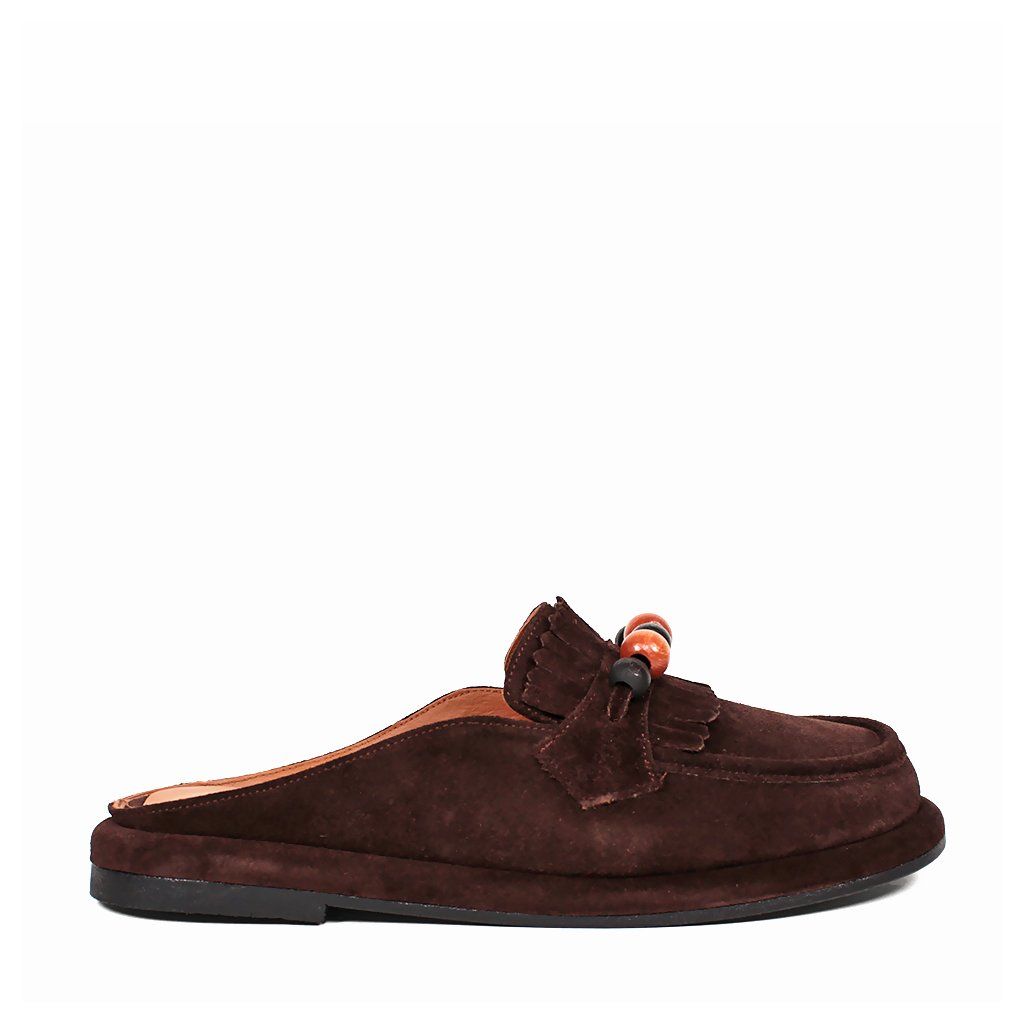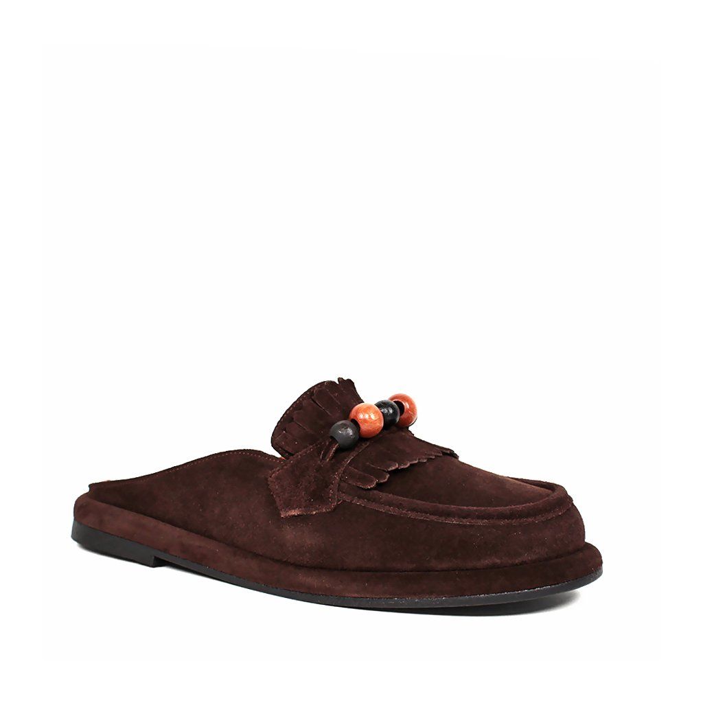 Štýlové nasúvacie šľapky s uzatvorenou špičkou od značky Secretshoes. Sú vyrobené z kvalitnej pravej kože v elegantnom hnedom odtieni a zdobené jemnými strapcami s farebnými korálikmi.
