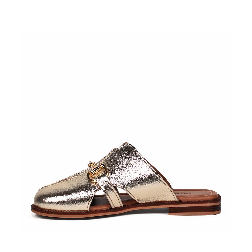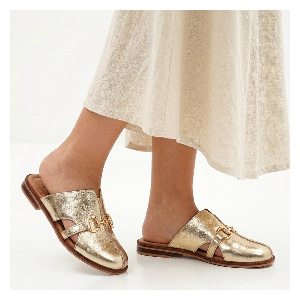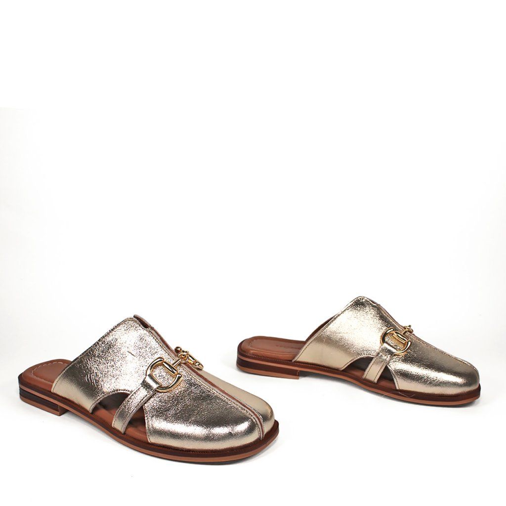 Dodajte svojmu letu zlatý lesk s exkluzívnymi šľapkami Secretshoes. Tento model s uzavretou špičkou v podmanivom zlatom prevedení je stvorený pre ženy, ktoré milujú eleganciu s nádychom luxusu. Metalický povrch kože nádherne odráža svetlo, zatiaľ čo ikonická zlatá spona dodáva obuvi šperkový charakter. Vďaka bočným výrezom a nízkemu podpätku s výškou 1,5 cm si vychutnáte dokonalú kombináciu vzdušnosti a celodenného komfortu. Ideálny kúsok, ktorý premení aj jednoduchý outfit na hviezdny vzhľad.