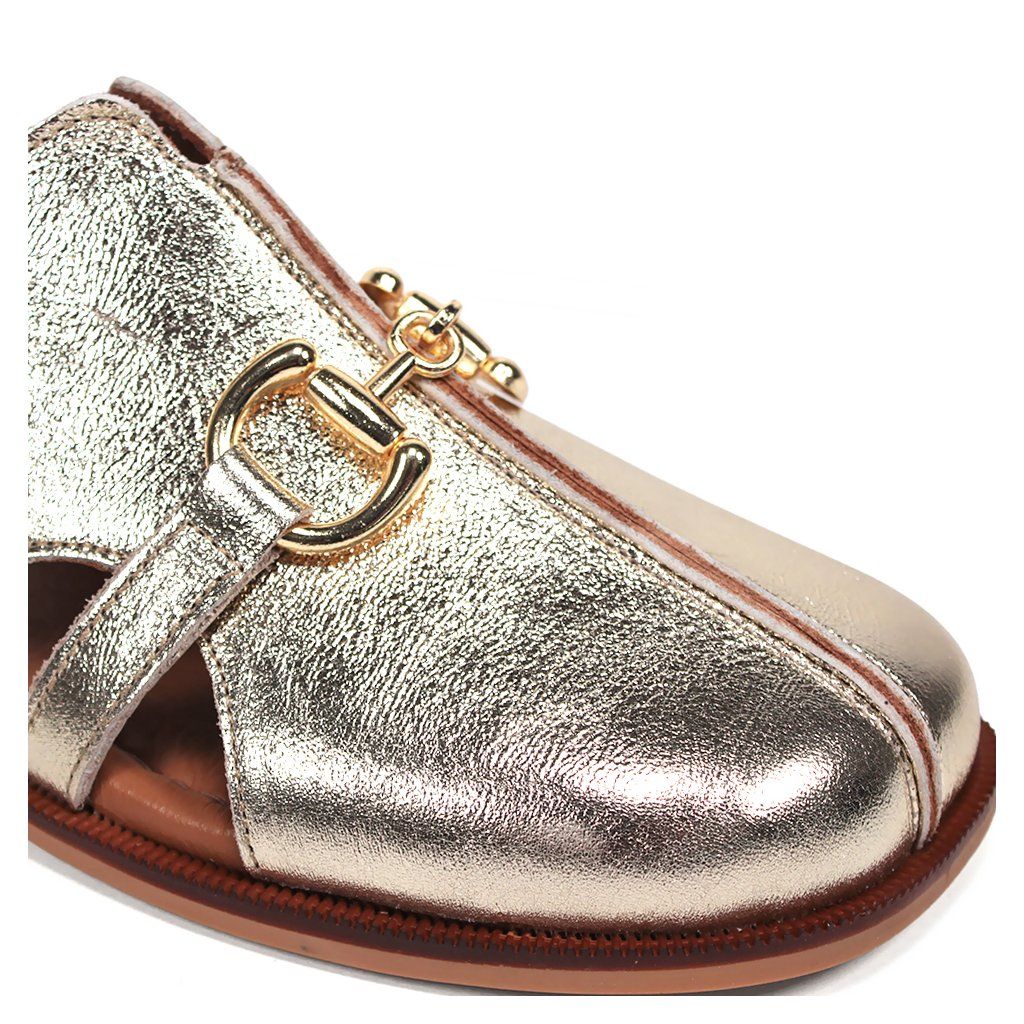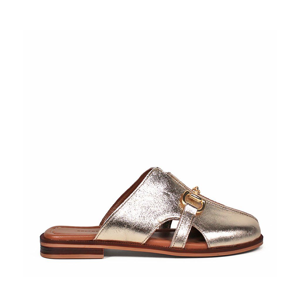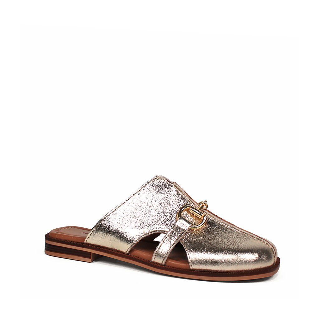 Dodajte svojmu letu zlatý lesk s exkluzívnymi šľapkami Secretshoes. Tento model s uzavretou špičkou v podmanivom zlatom prevedení je stvorený pre ženy, ktoré milujú eleganciu s nádychom luxusu. Metalický povrch kože nádherne odráža svetlo, zatiaľ čo ikonická zlatá spona dodáva obuvi šperkový charakter. Vďaka bočným výrezom a nízkemu podpätku s výškou 1,5 cm si vychutnáte dokonalú kombináciu vzdušnosti a celodenného komfortu. Ideálny kúsok, ktorý premení aj jednoduchý outfit na hviezdny vzhľad.