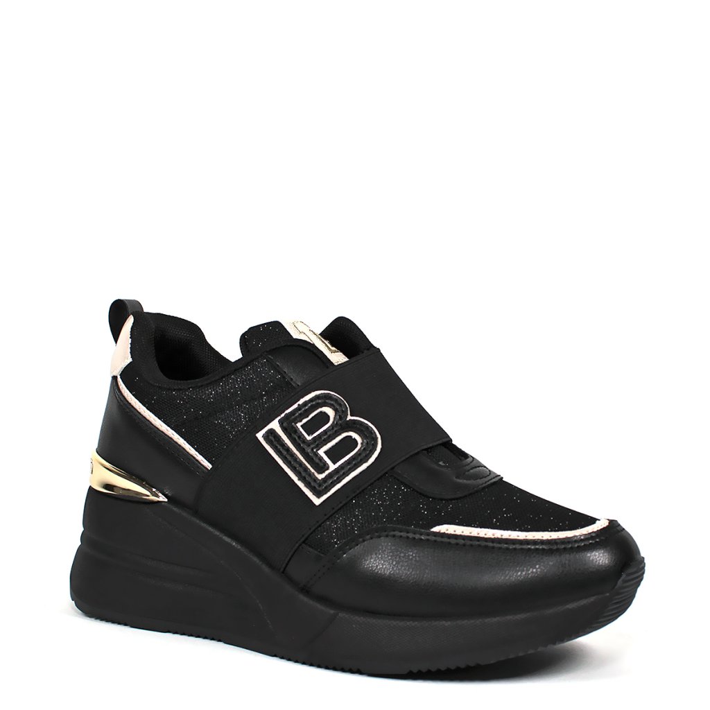 Tieto ohromujúce čierne tenisky Laura Biagiotti sú stelesnením sebavedomého štýlu a moderného luxusu. Hlbokú čiernu základnú farbu ozvláštňujú žiarivé, trblietavé textúry a elegantné zlaté detaily, ktoré sa objavujú na špičke aj na päte. Centrálnym prvkom obuvi je široký elastický remienok s výrazným logom značky zdobeným kamienkami, ktorý poskytuje nielen stabilnú oporu, ale funguje aj ako šperk. Robustná, no zároveň ľahká čierna podrážka a vyvýšená päta zaisťujú celodenné pohodlie a zároveň opticky predlžujú nohy, vďaka čomu sú dokonalým doplnkom odvážneho mestského outfitu.