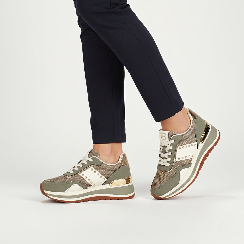 Tieto výnimočné dámske tenisky Laura Biagiotti v nubukových a zlatých tónoch sú dokonalou kombináciou športového pohodlia a luxusného dizajnu. Zvršok topánky sa skladá z pútavých textúr: metalicky lesklé sieťované vložky dopĺňajú elegantné panely so semišovým efektom a čisté biele detaily. Skutočný charakter dodáva bočný biely pás, ktorý je jedinečný vďaka malým žiariacim kamienkom a jemne vyrazenému logu „LB“. Pozlátený ozdobný prvok na päte a metalické zakončenie ešte viac umocňujú exkluzívny vzhľad, zatiaľ čo viacvrstvová vyvýšená podrážka s drážkovaným dezénom zaisťuje maximálnu stabilitu a celodenný komfort.