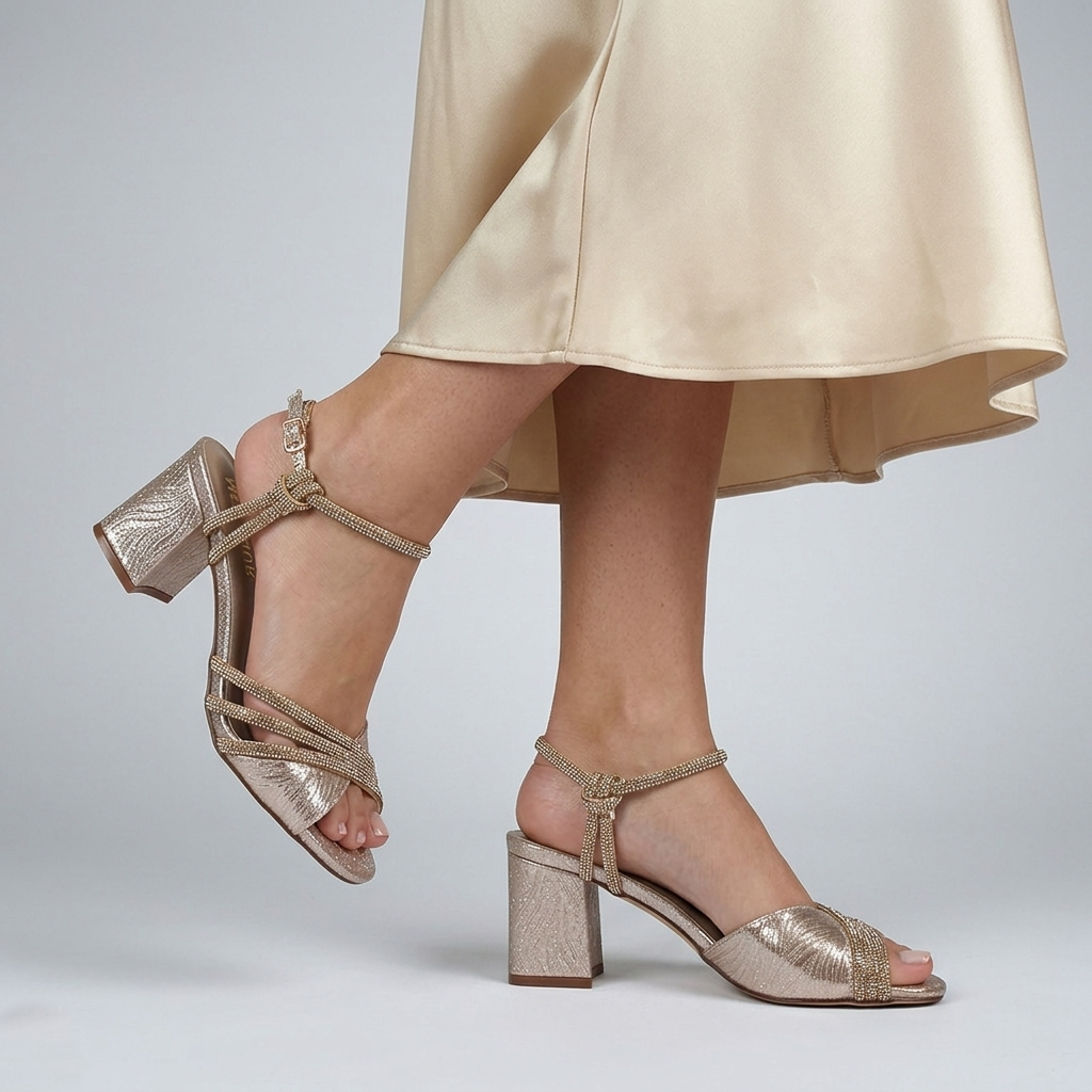 Tieto nádherné sandále značky Menbur sú dokonalým spojením sofistikovanej elegancie a moderného štýlu, ktorý dodá každému spoločenskému outfitu nezabudnuteľný šmrnc. Jemne textúrovaný materiál v rosegold odtieni s trblietavým efektom a vlnitým vzorom dopĺňajú tenké remienky zdobené štrasovými kamienkami, ktoré pôsobia luxusným dojmom. Stabilný, stredne vysoký blokový podpätok zaisťuje pohodlie počas celého večera a remienok okolo členka so zapínaním na sponu zaručuje bezpečné uchytenie, vďaka čomu je tento model ideálnou voľbou na svadby, plesy alebo elegantné večerné podujatia.