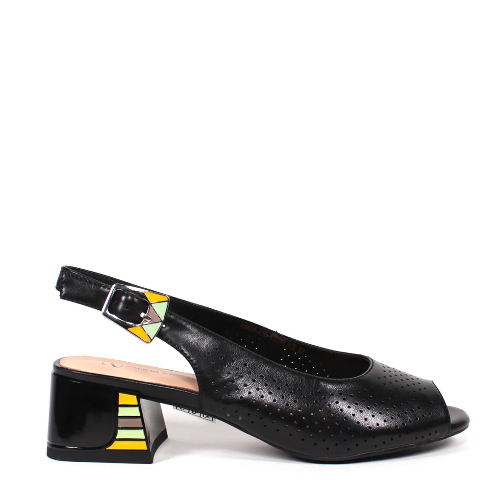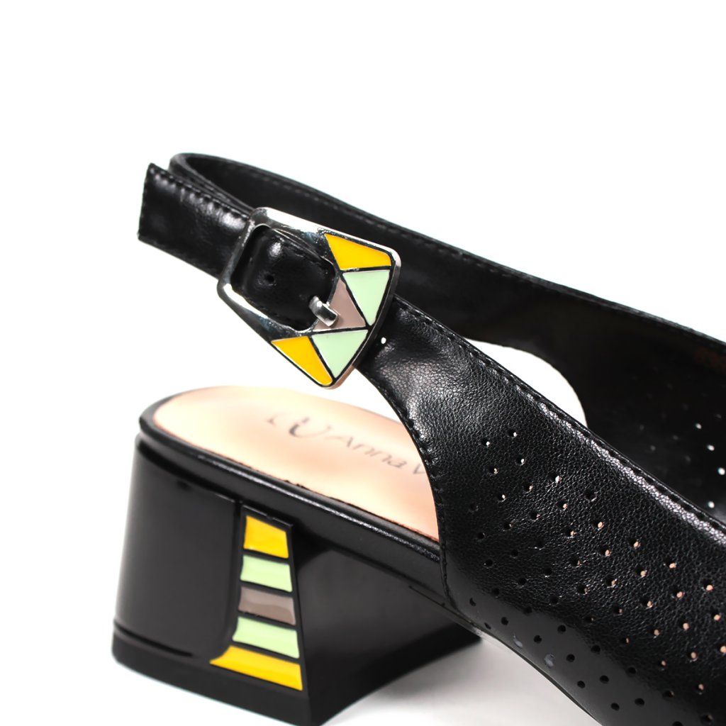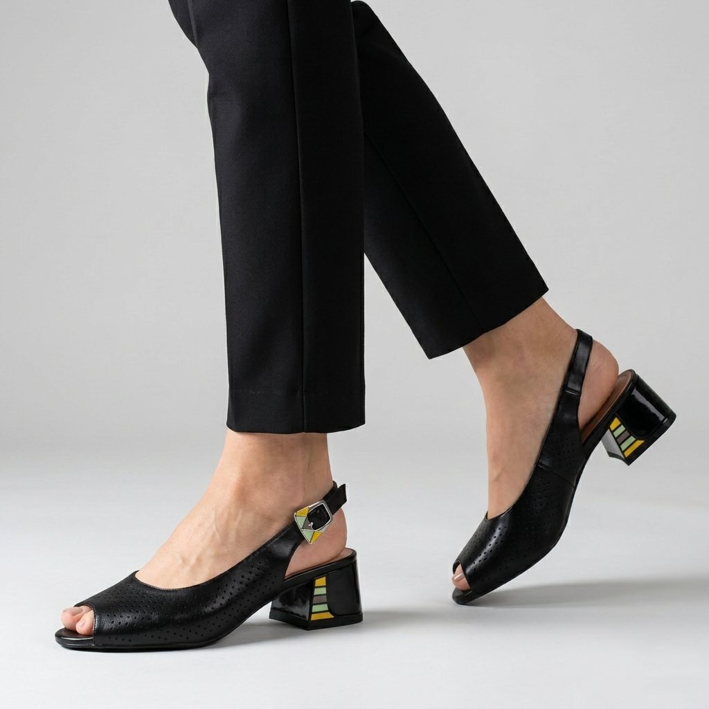 Tieto štýlové čierne dámske sandále sú ideálnou voľbou pre milovníčky modernej elegancie. Zvršok zdobený jemnou perforáciou je nielen estetický, ale zabezpečuje aj vynikajúcu priedušnosť počas teplejších dní. Výnimočnosť obuvi spočíva v stabilnom blokovom podpätku, ktorý zdobí unikátny farebný geometrický vzor, ladiaci s detailmi na pracke. Otvorená špička a tenký nastaviteľný remienok dodávajú ženský vzhľad, zatiaľ čo pohodlná vnútorná stielka zaručuje celodenný komfort, či už ide o pracovný outfit alebo špeciálnu príležitosť.
