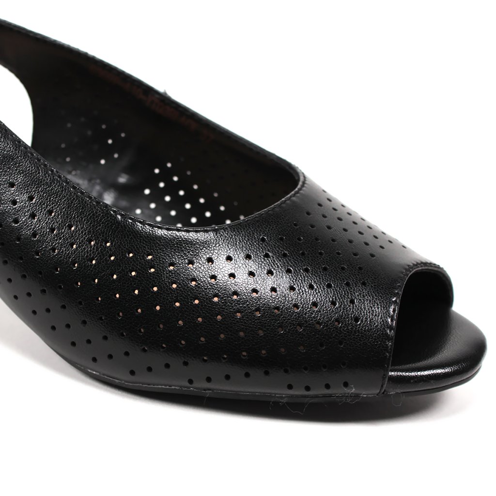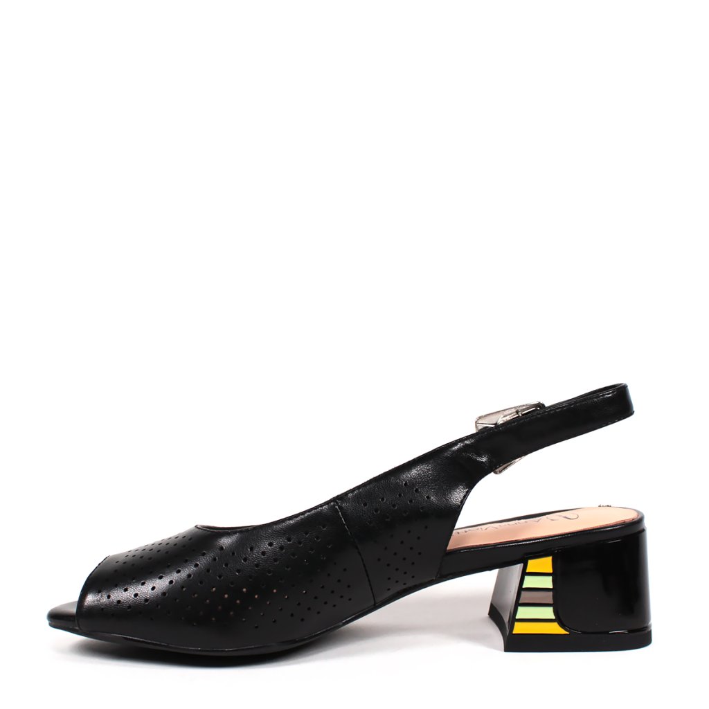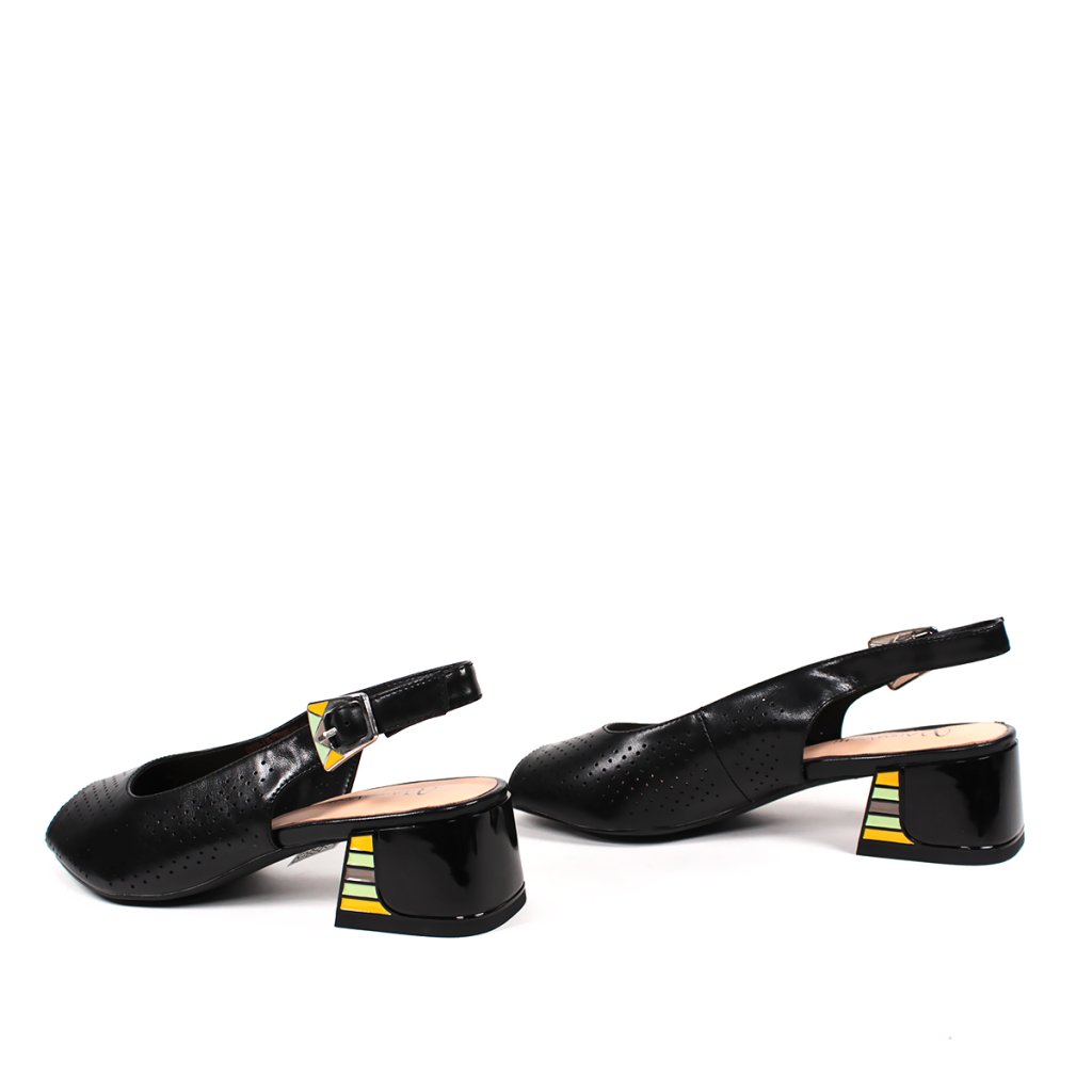 Tieto štýlové čierne dámske sandále sú ideálnou voľbou pre milovníčky modernej elegancie. Zvršok zdobený jemnou perforáciou je nielen estetický, ale zabezpečuje aj vynikajúcu priedušnosť počas teplejších dní. Výnimočnosť obuvi spočíva v stabilnom blokovom podpätku, ktorý zdobí unikátny farebný geometrický vzor, ladiaci s detailmi na pracke. Otvorená špička a tenký nastaviteľný remienok dodávajú ženský vzhľad, zatiaľ čo pohodlná vnútorná stielka zaručuje celodenný komfort, či už ide o pracovný outfit alebo špeciálnu príležitosť.
