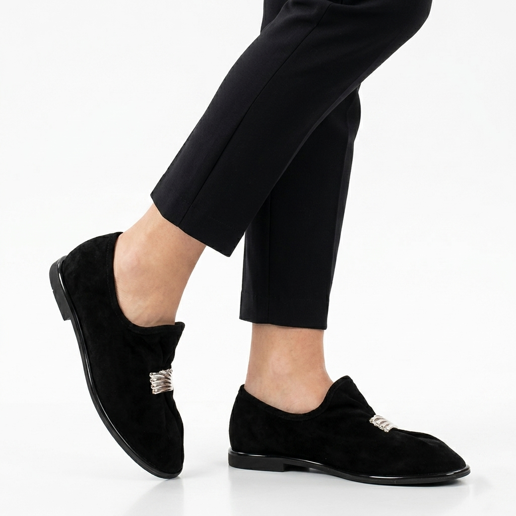Tieto elegantné čierne dámske nazúvacie topánky v semišovom vzhľade sú dokonalou kombináciou vycibreného štýlu a pohodlia. Výnimočnosť obuvi spočíva v jemnom riasení na špičke a v nápadnom striebornom zdobení v tvare mušle, ktoré dodáva nositeľke jedinečný vzhľad. Čisté línie a nízka, pohodlná podrážka ich robia ideálnymi na bežné nosenie aj slávnostnejšie príležitosti, zatiaľ čo mäkký zvršok a pružný lem zaručujú celodenný komfort. Je to moderná voľba pre tie dámy, ktoré obľubujú klasickú čiernu farbu v kombinácii s jemným leskom a neopakovateľným dizajnom.