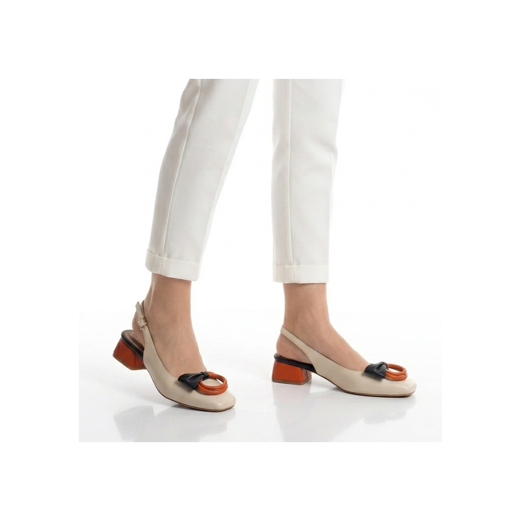 Tieto výnimočné a elegantné dámske sandále sú ideálnou voľbou pre tie z vás, ktoré milujú spojenie moderného štýlu s umeleckým detailom. Zvršok z bielej kože robí jedinečným tmavomodrá mašľa a výrazná oranžová ozdoba v tvare kruhov, zatiaľ čo hranatá špička a stabilný oranžový blokový podpätok odrážajú najnovšie módne trendy. Tenký remienok okolo päty s nastaviteľnou prackou a mäkká vnútorná stielka sa starajú o maximálne pohodlie, vďaka čomu je táto obuv nielen štýlovým doplnkom letného šatníka, ale zaručuje aj komfort počas celého dňa.